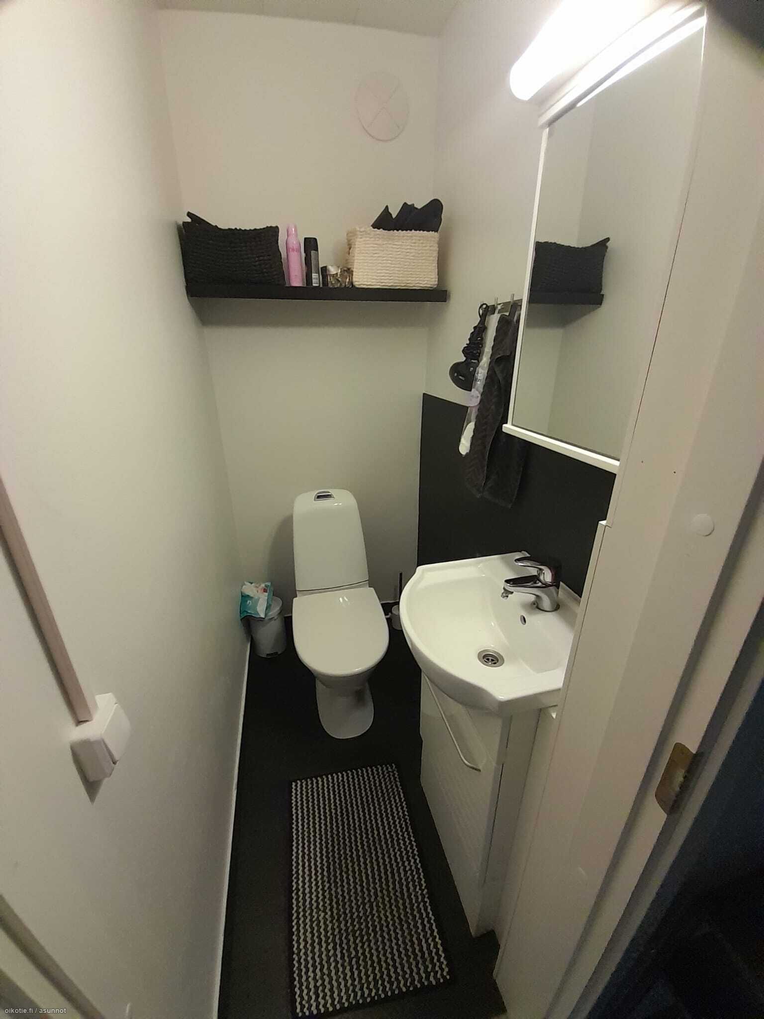 Laatoitettu kylpyhuone ja iso ikkunallinen sauna, jossa Harvian sähkökiuas. Erillinen WC-tila. Takapihalla talousrakennus/ulkoliiteri sekä kulku asuinrakennuksen pannuhuoneeseen takakautta.