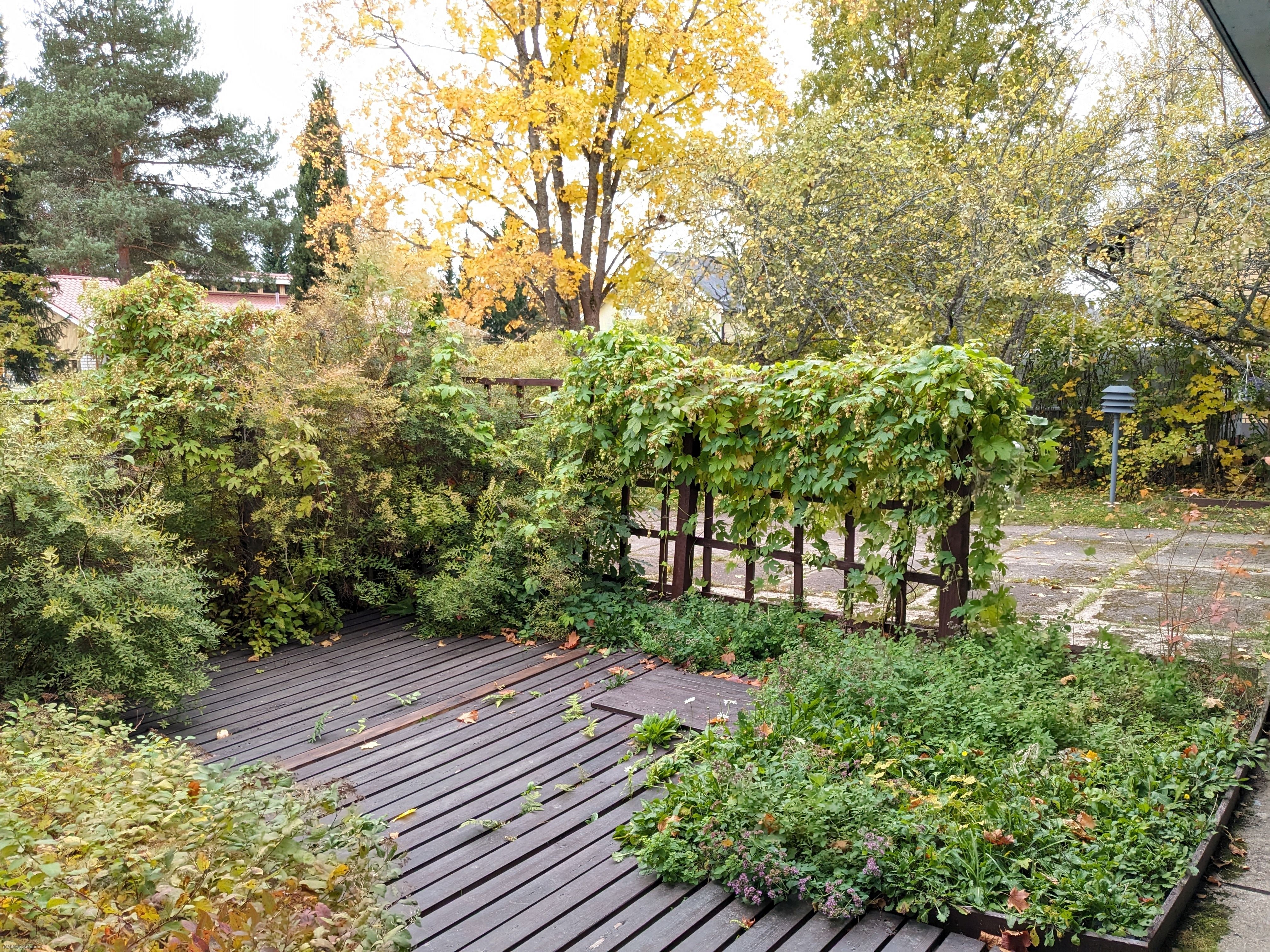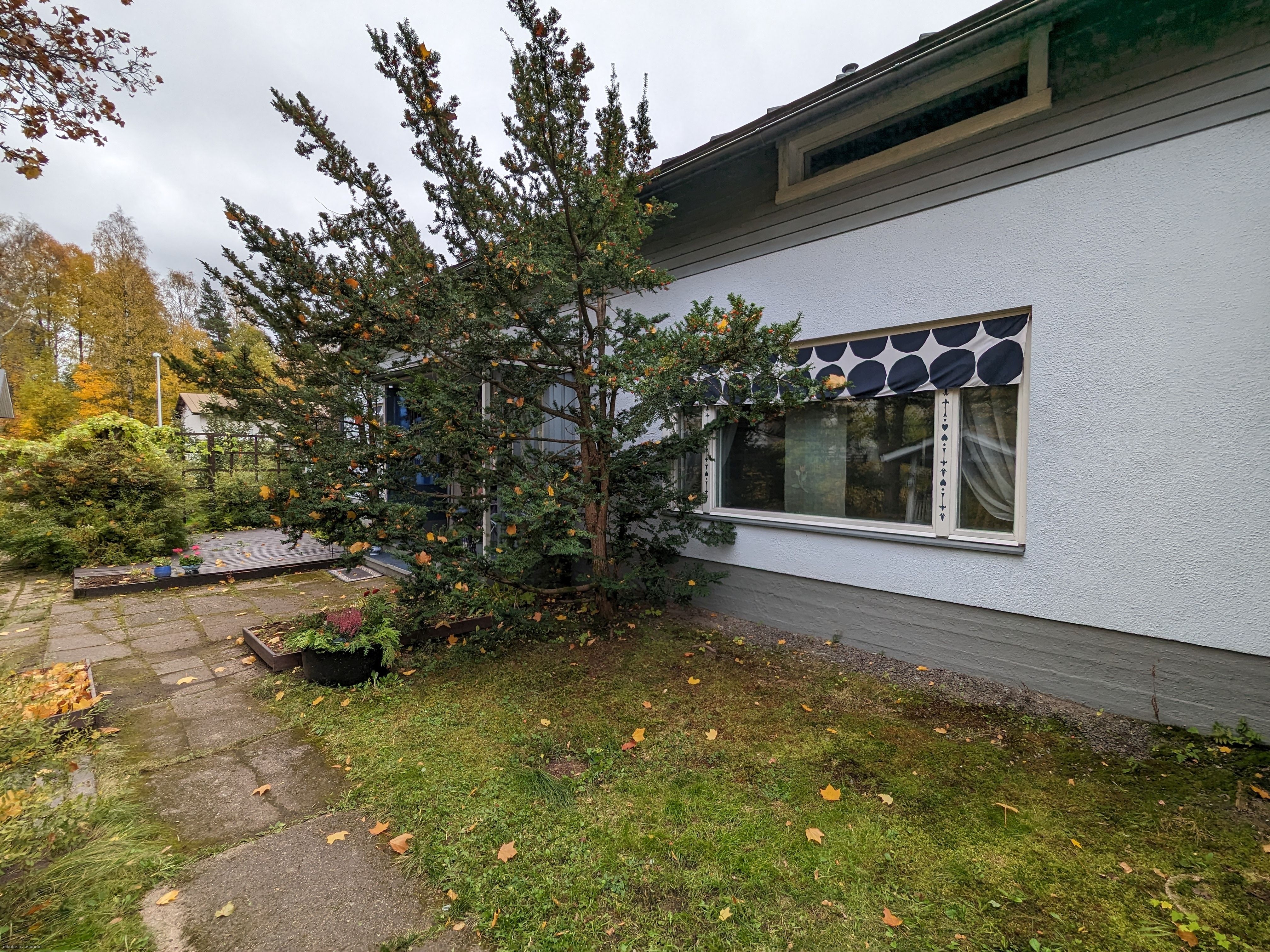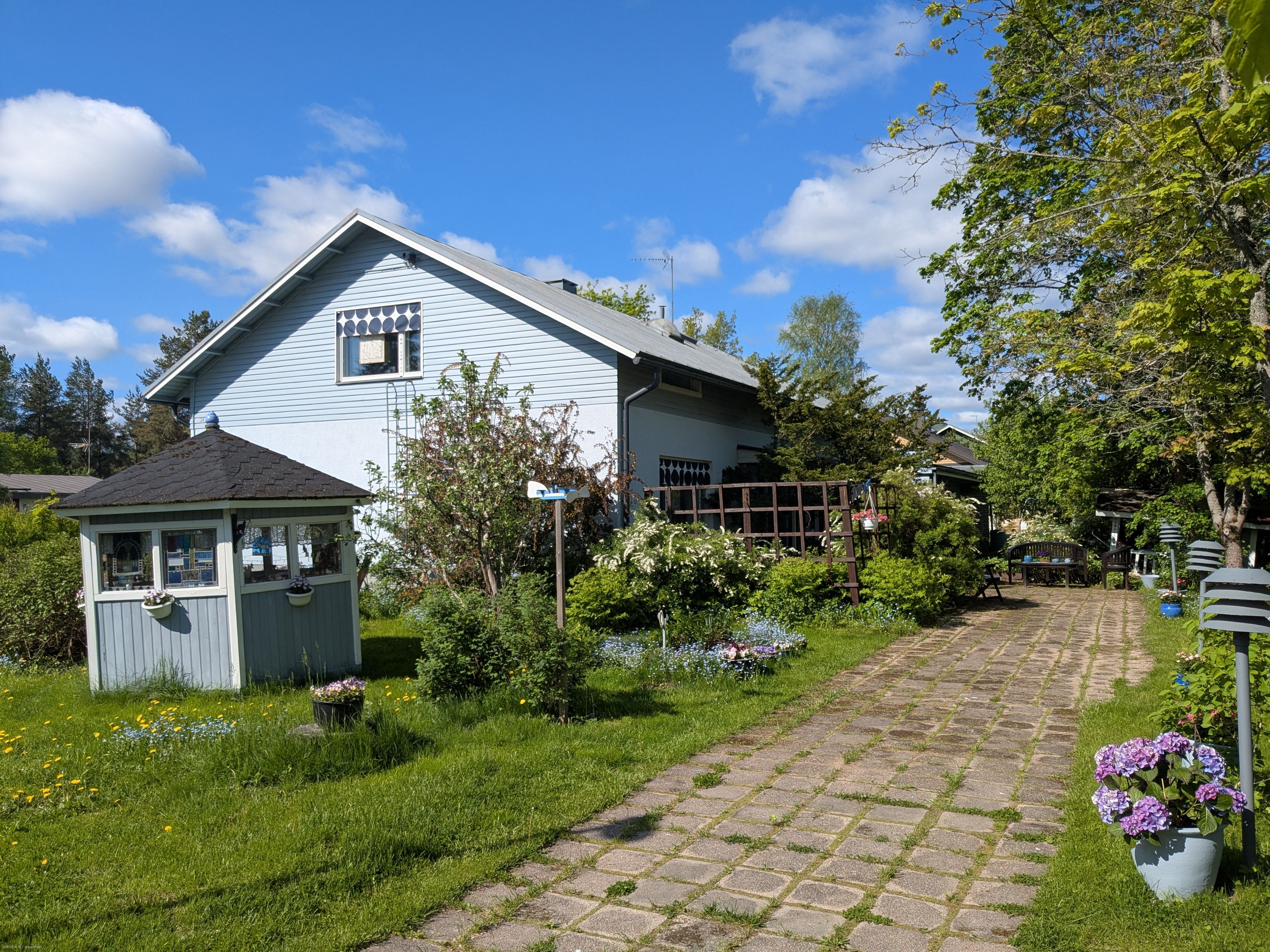 Viihtyisä oma 1128 m² kulmatontti, jonka pihan kulkuväylät on laatoitettu sekä valaistu ja molempia pääsisäänkäyntejä edeltää suojaisa terassialue.
