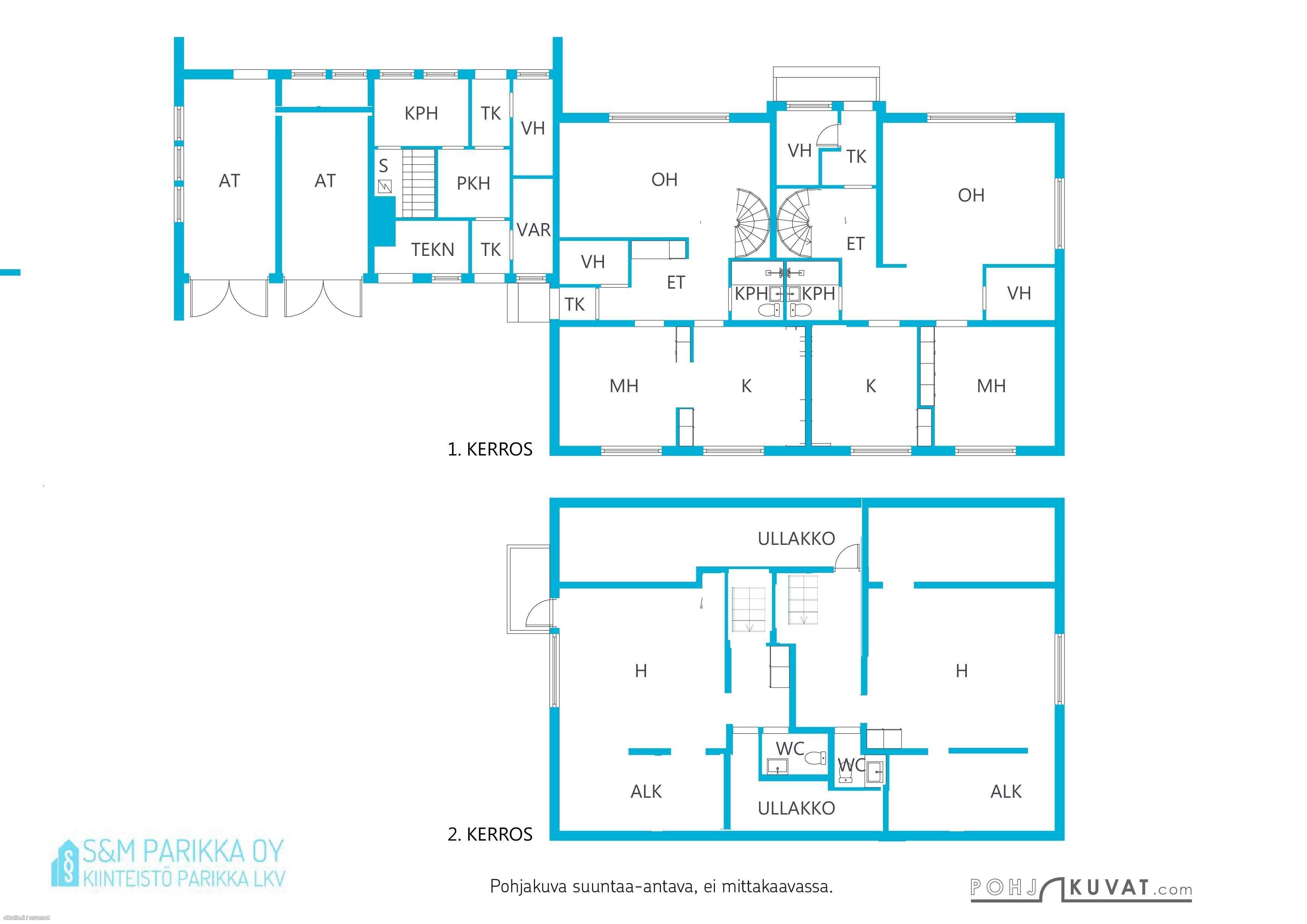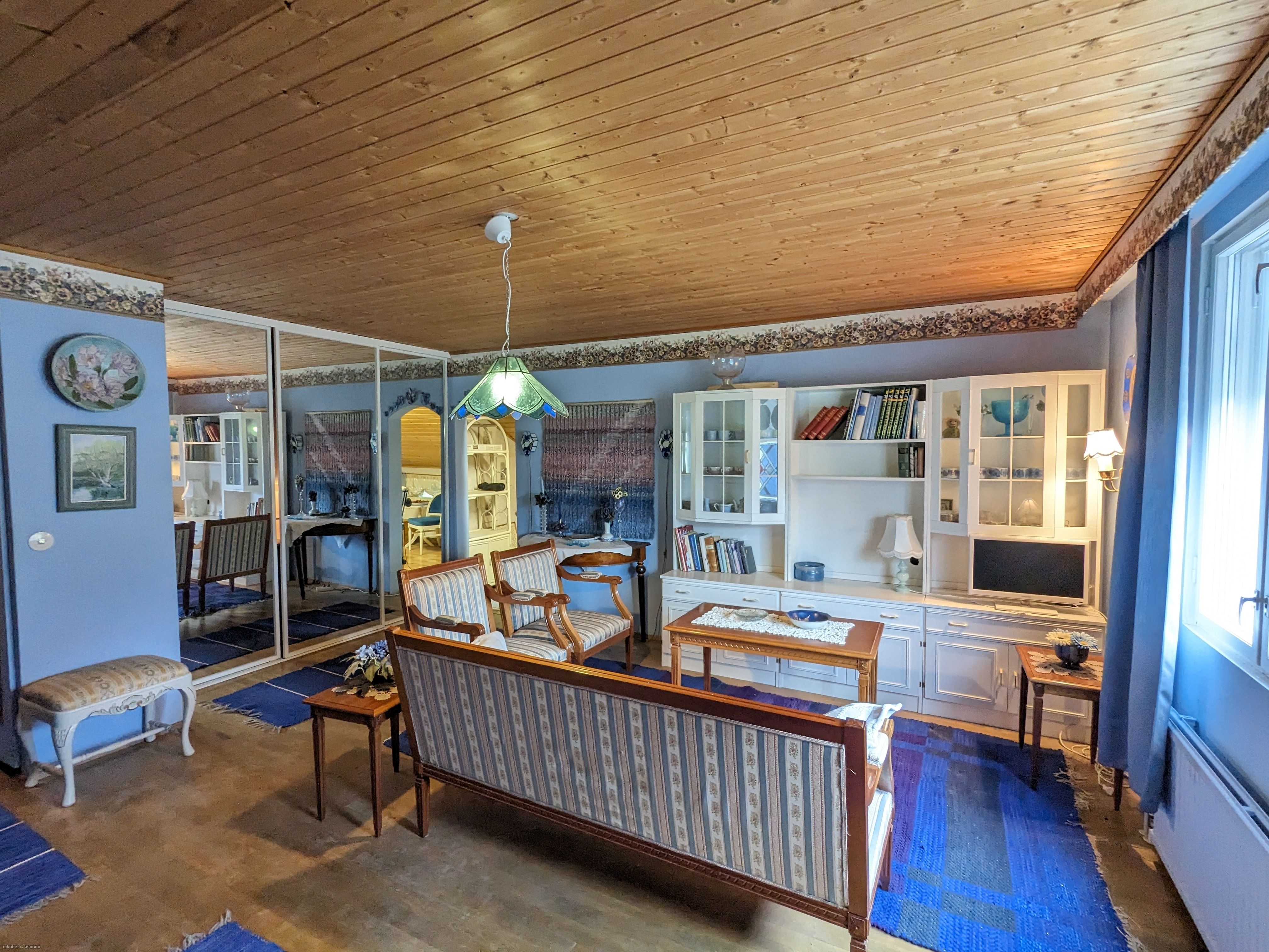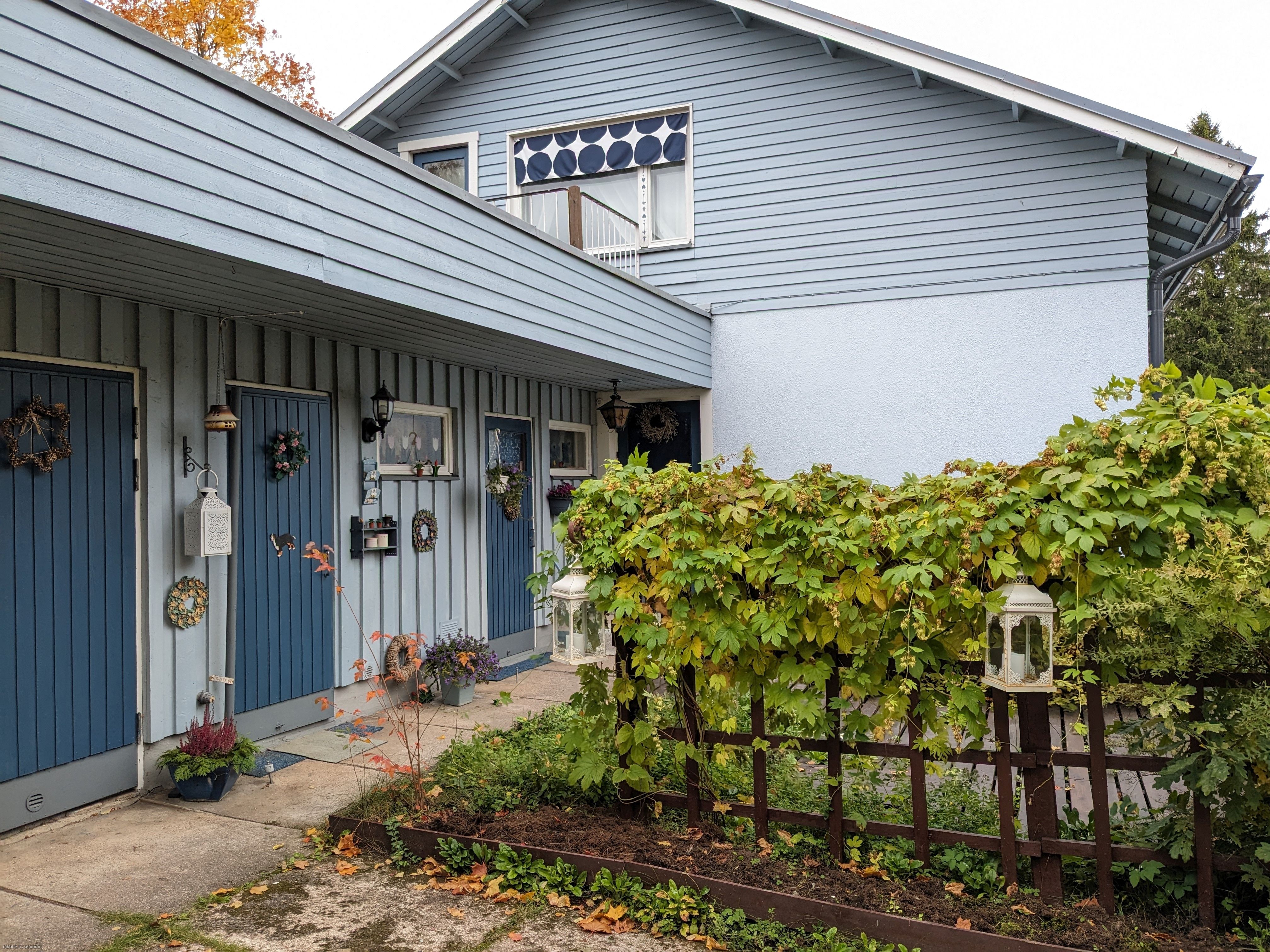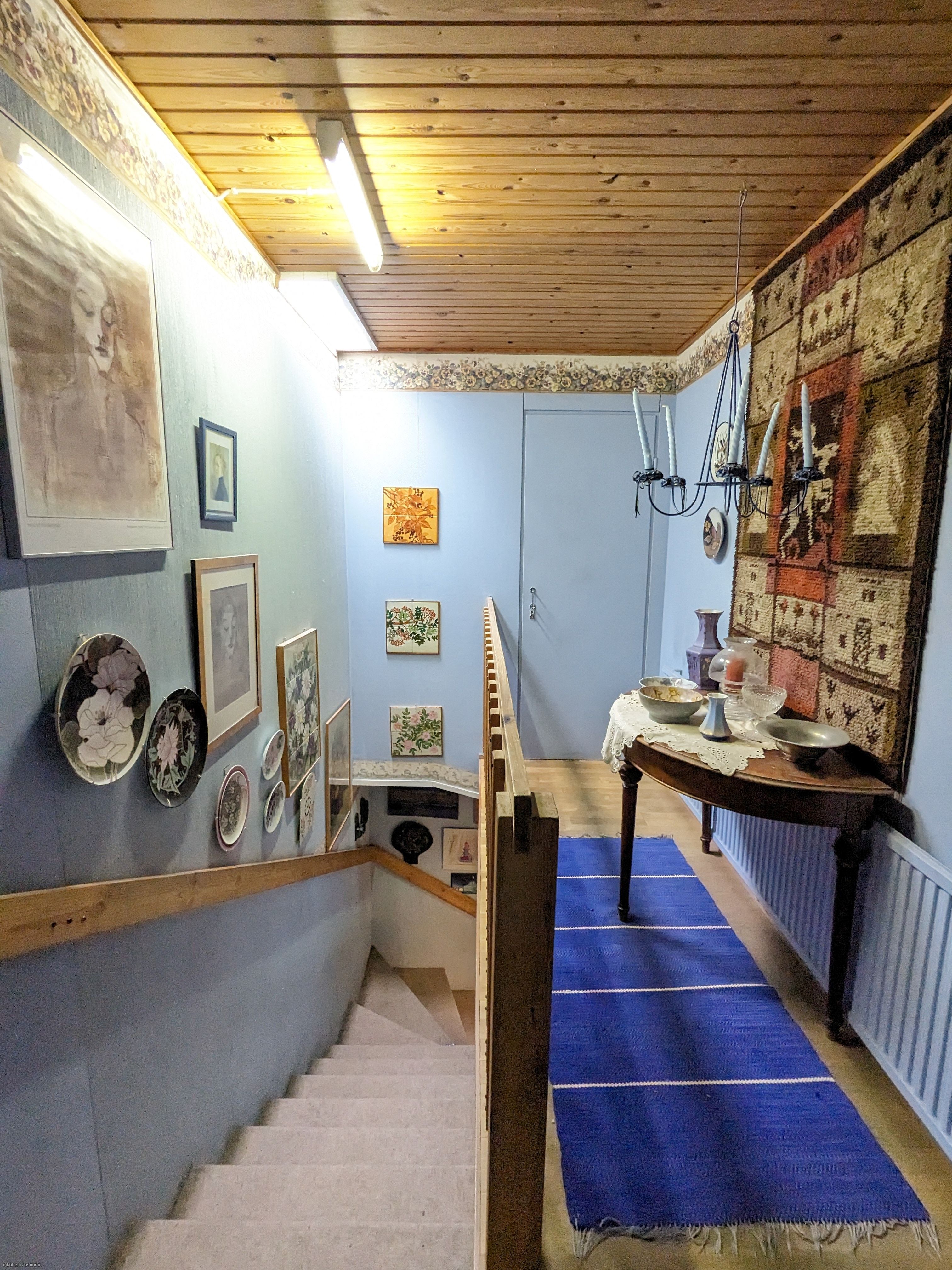 Molemmissa asunnoissa asuintilat kahdessa kerroksessa. 1Asunnossa on sisääntulokerroksessa kuisti, eteinen, olohuone sekä makuuhuone ja kaunis sinisävyinen 2010-luvun alussa remontoitu keittiö, laatoitettu kylpyhuonetila jossa on myös WC. Lisäksi alakerrassa on vaatehuone. Lattiat on laminaattia. Yläkerrassa on kattoikkunallinen aula, yksi tilava asuinhuone, WC-tila sekä asuinkäyttöön muutetut/alkovi vintit. Yläkerrassa parkettilattia. Lisäksi kylmä ullakko.
