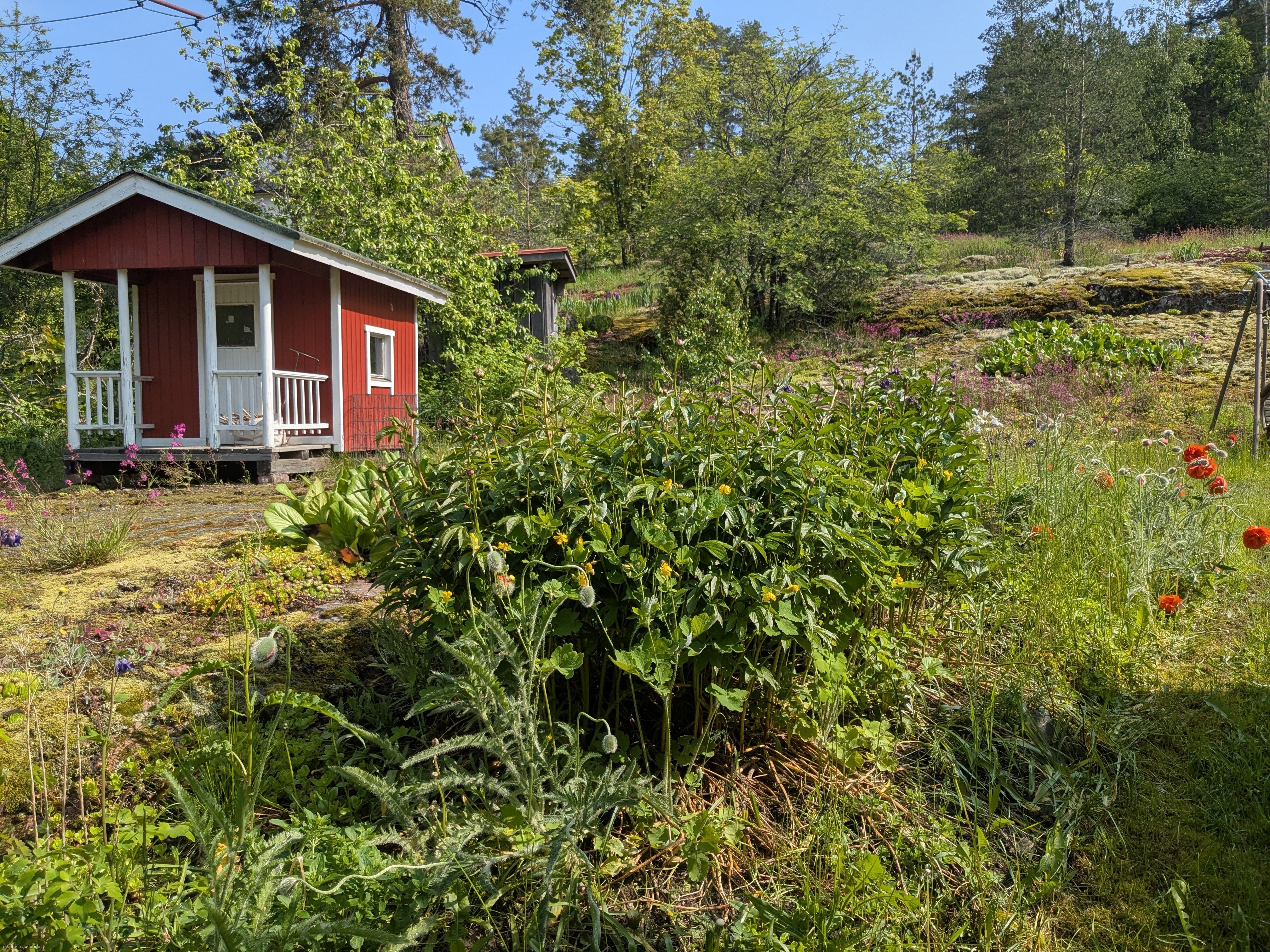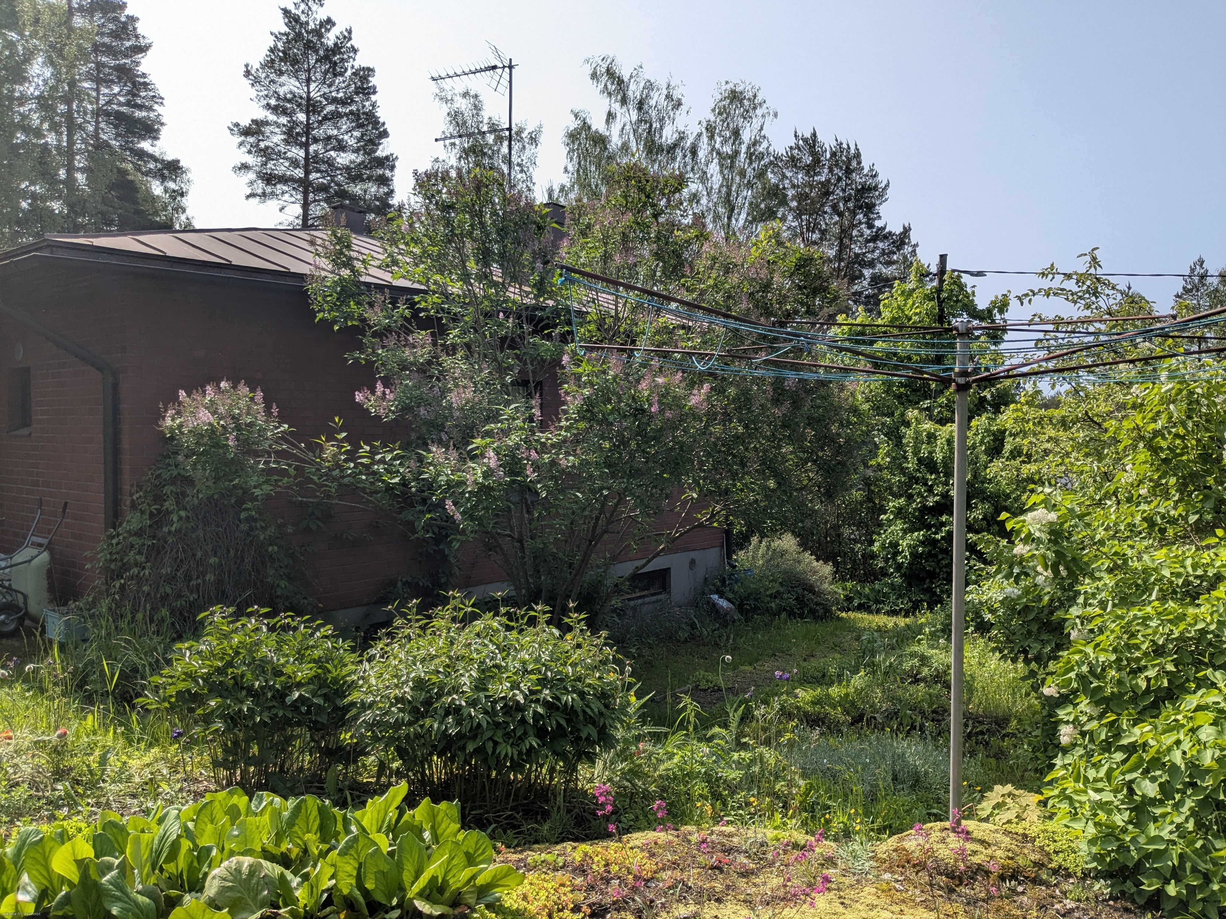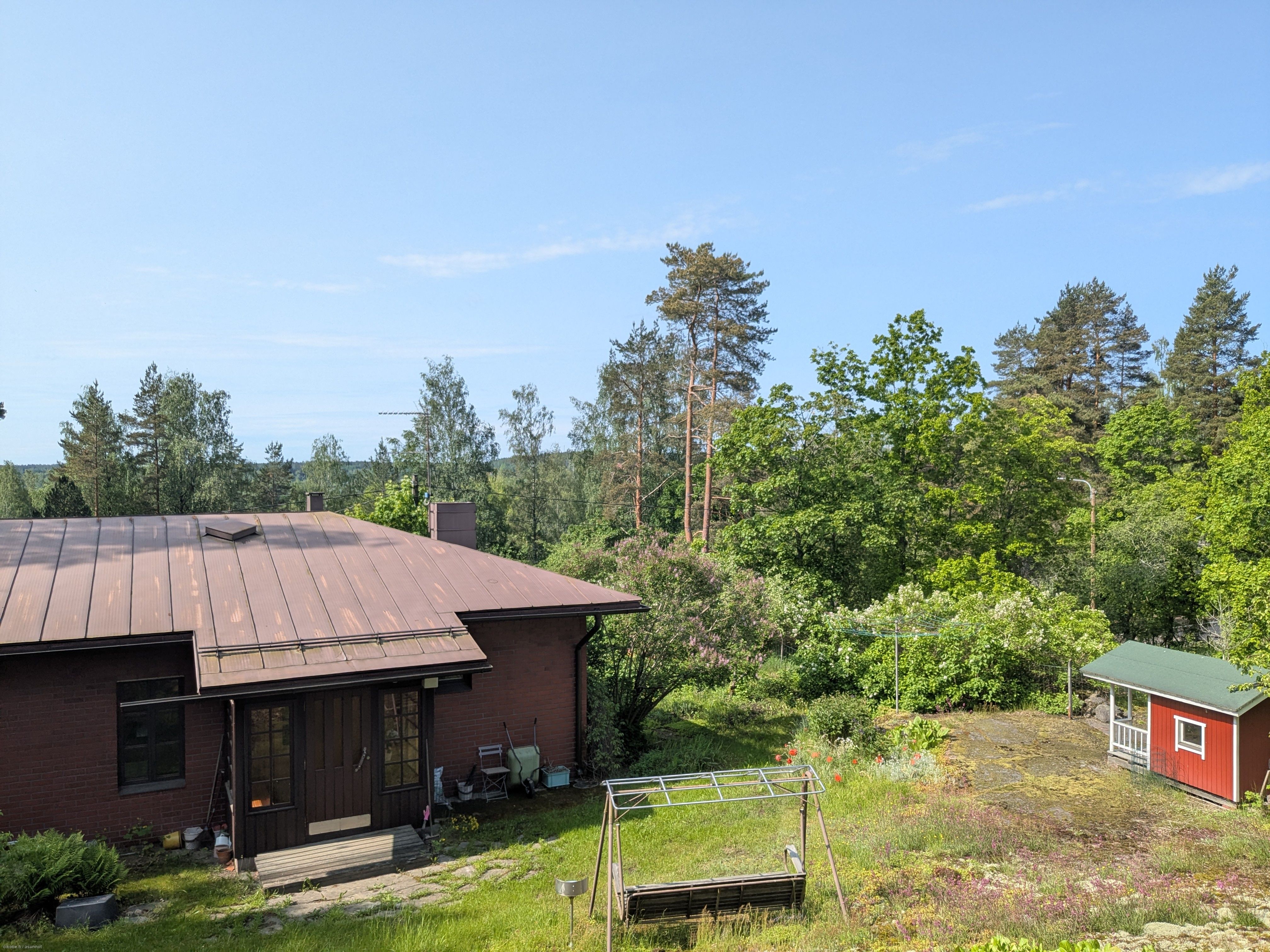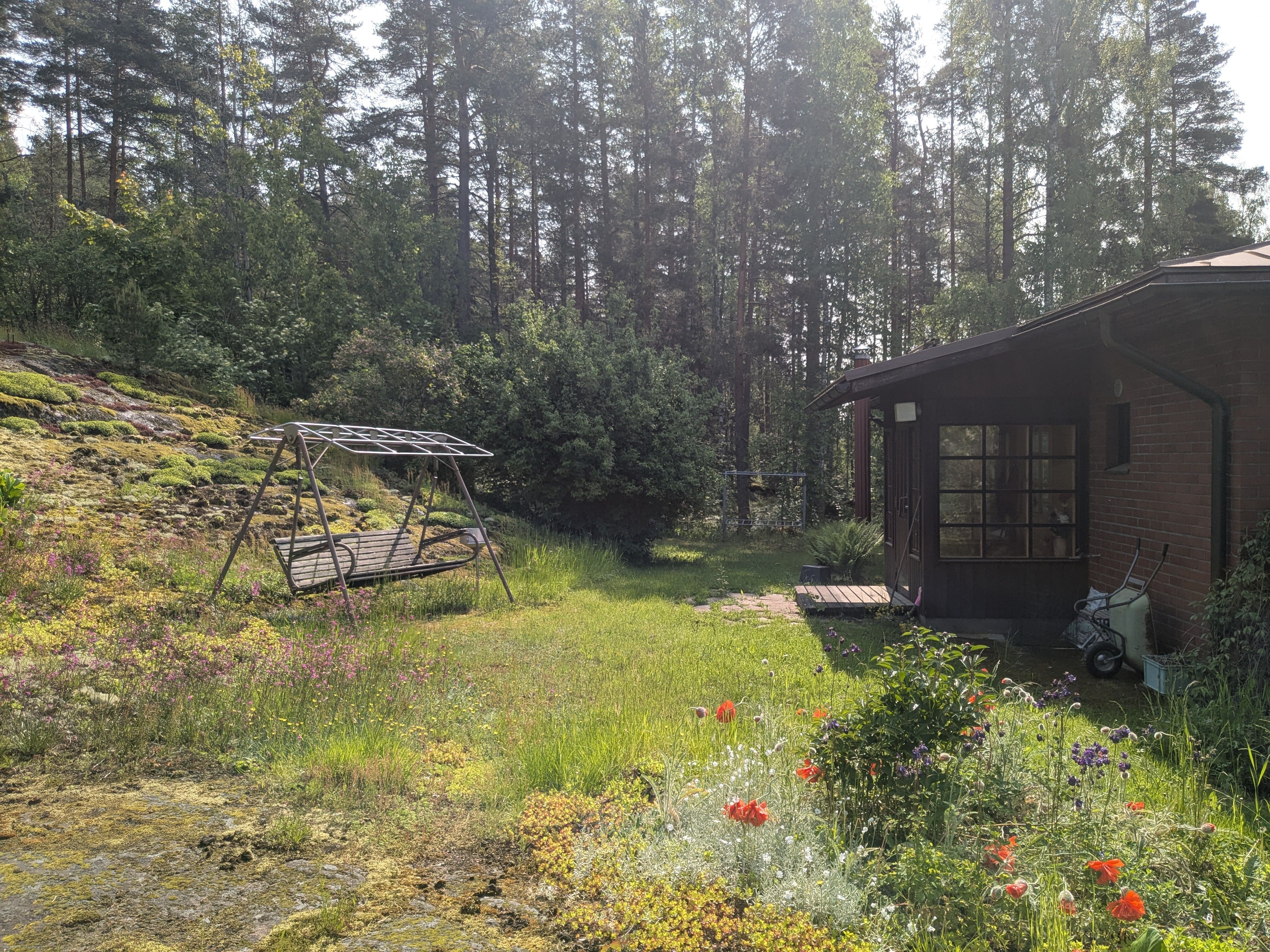 Osittain lähimetsään rajoittuvalla rinnetontilla on puutarhakasvillisuutta, vanha leikkimökki, talousrakennus sekä koira-aitaus.