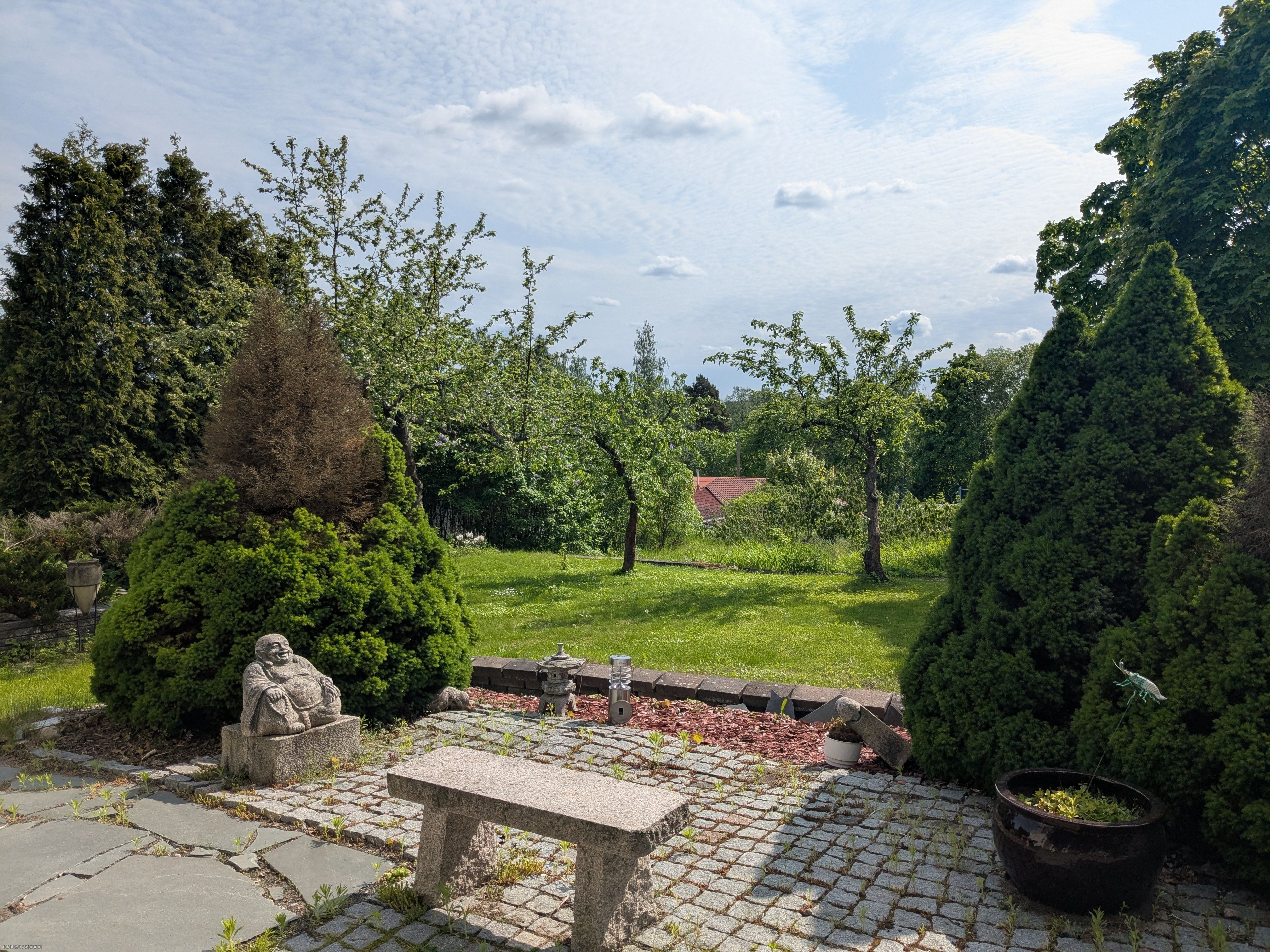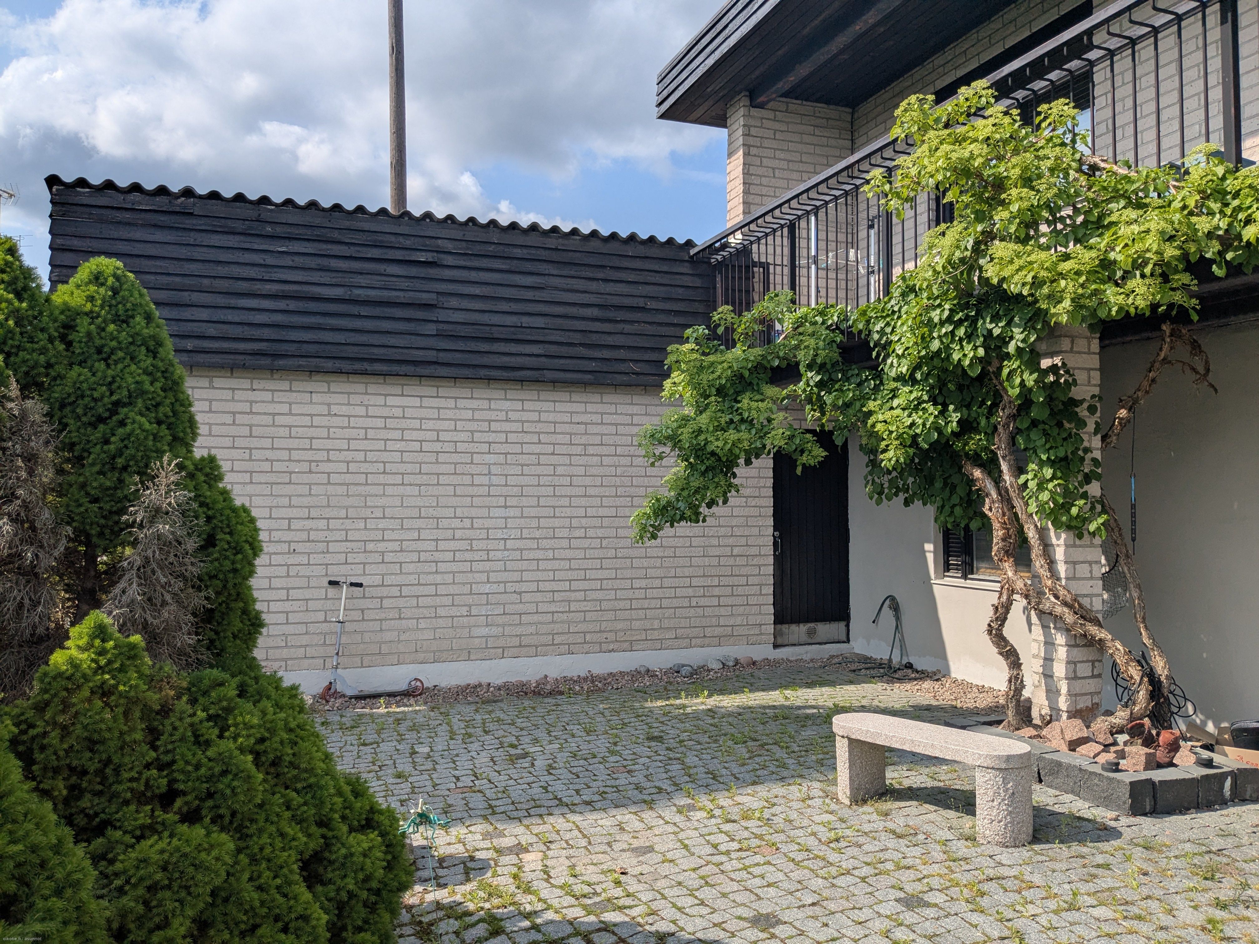 Rinnetontti. Pihapiirissä on kaunista terassikivetystä, nurmialuetta, omenapuita ym. Autotallin edessä asfaltoitu pysäköintialue useammalle autolle. Autotallin lisäksi yksi iso varastotila.
