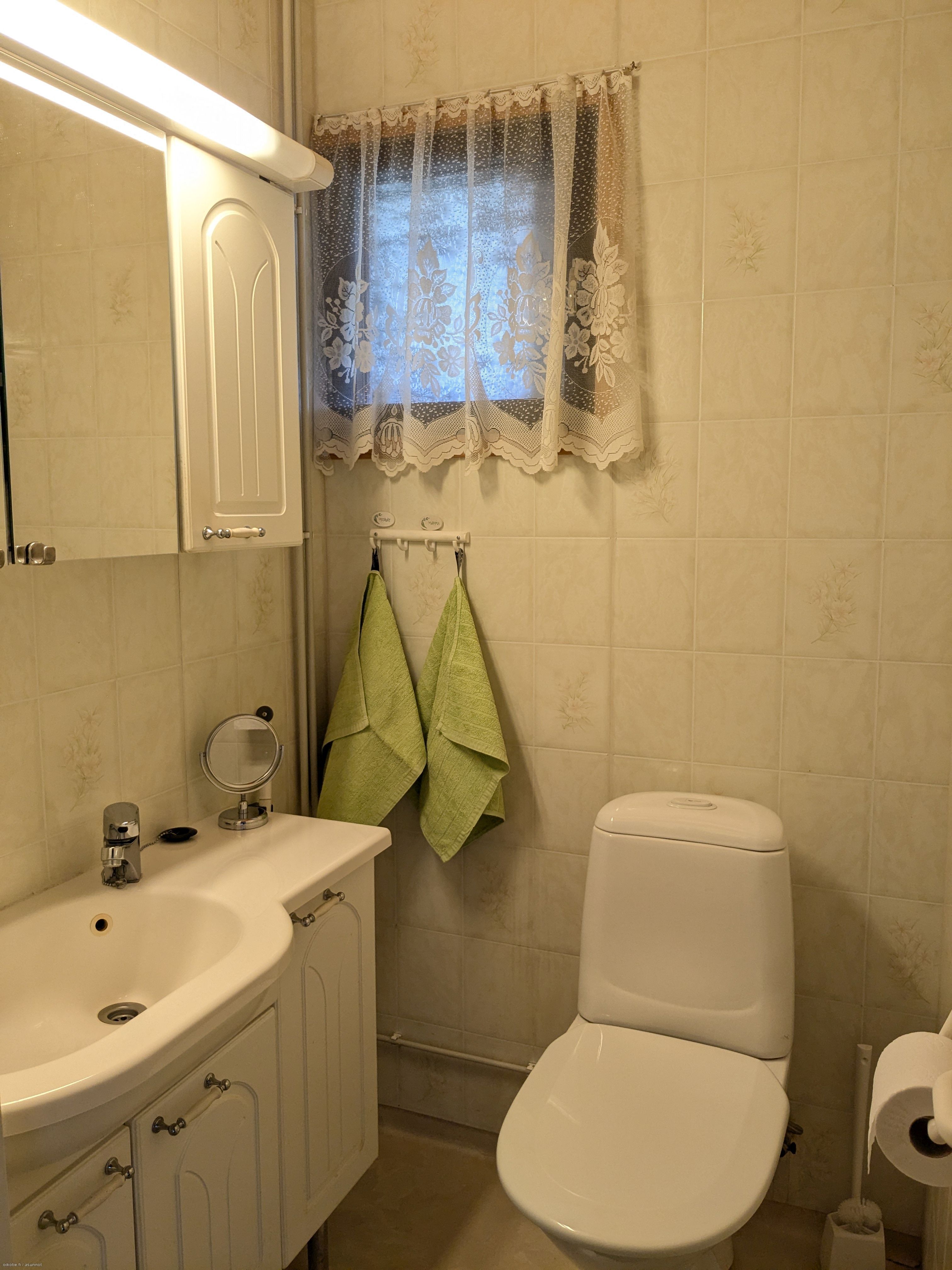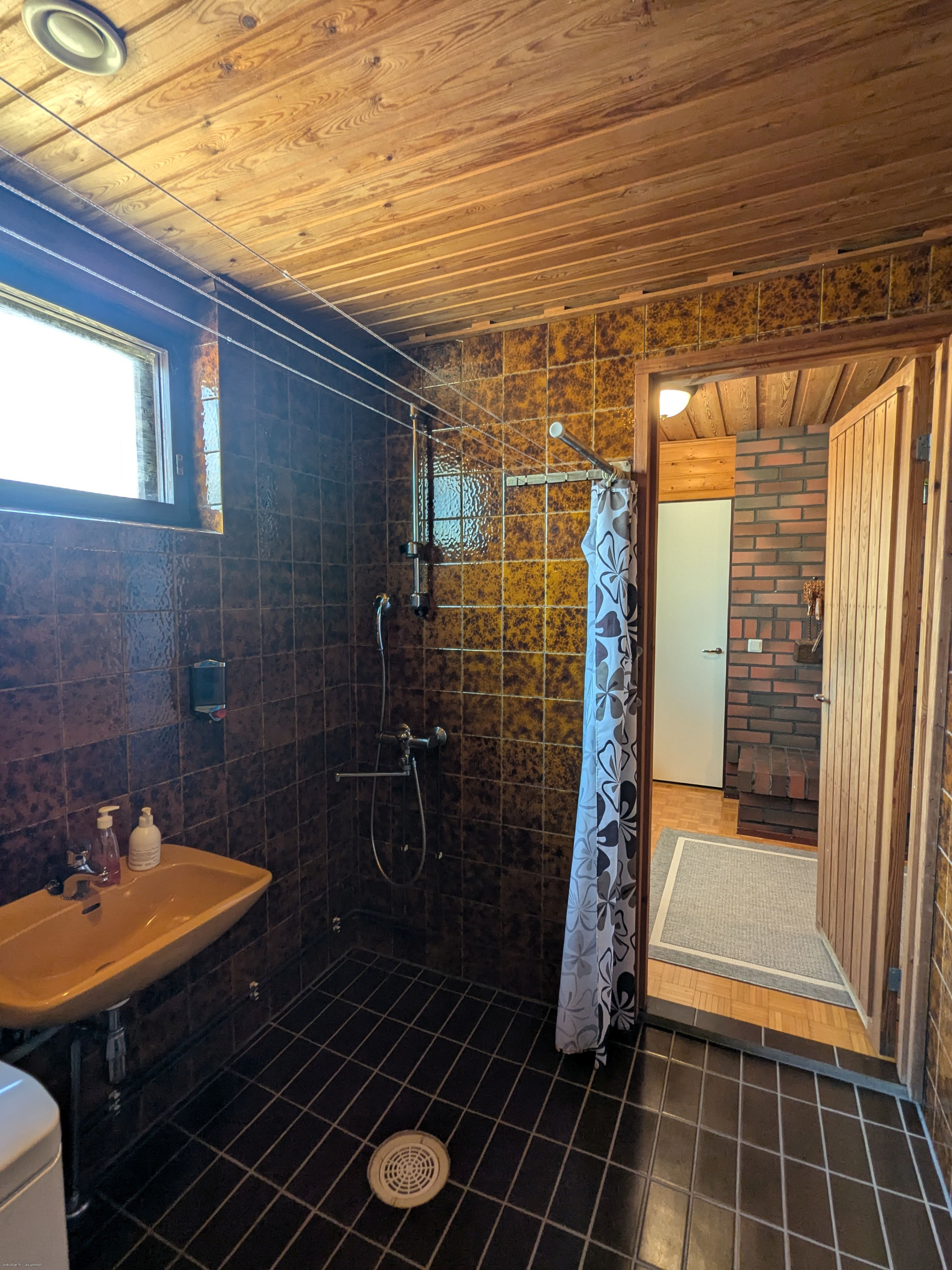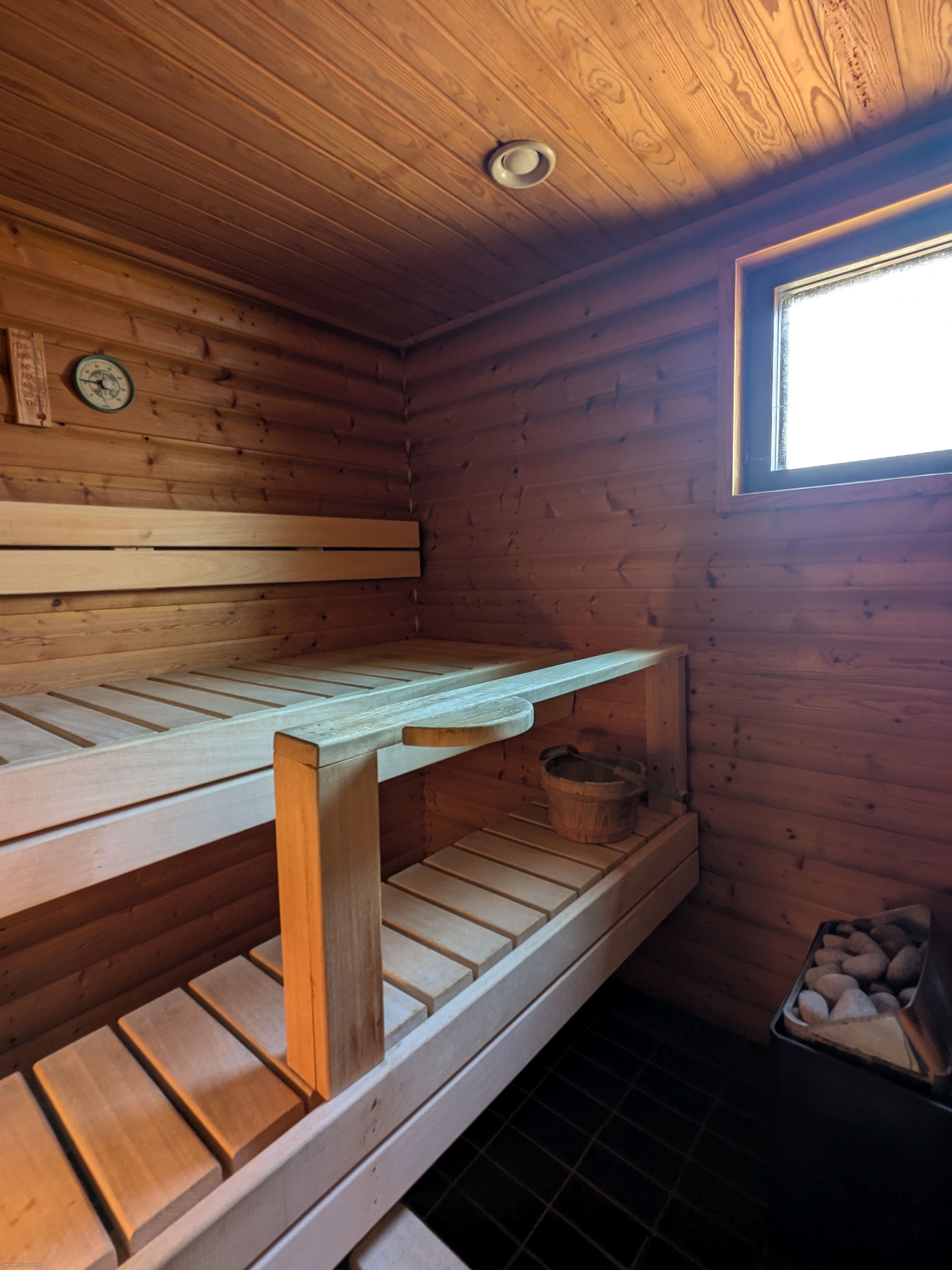 Varusteet: Sähkökiuas, Ikkuna ulos. Lattiamateriaali: Laattalattia