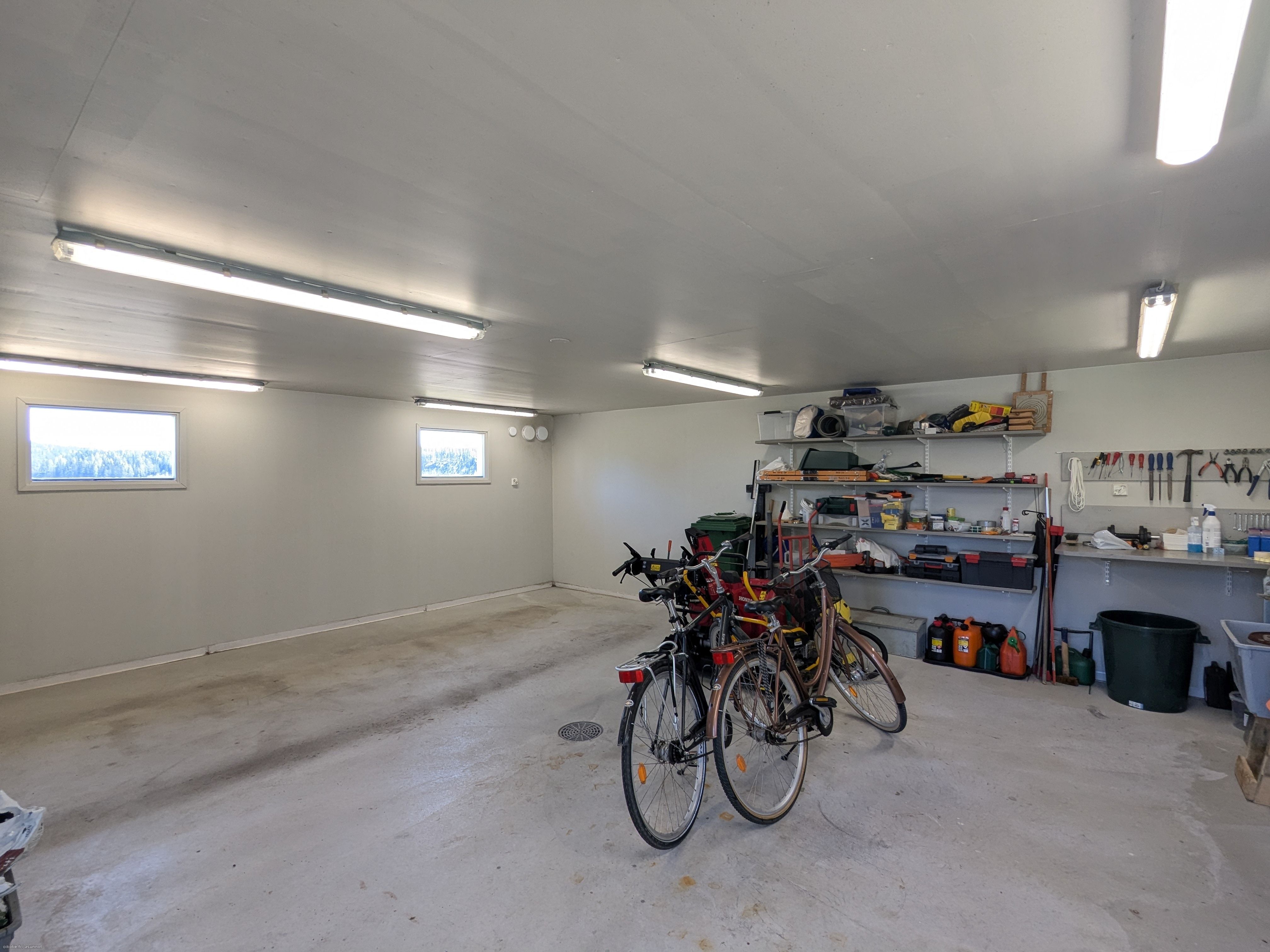 Kahden auton lattiakaivollinen autotallirakennus, jossa erillinen varastotila. Lisäksi autotallin vieressä on pysäköintitilaa useammalle autolle.