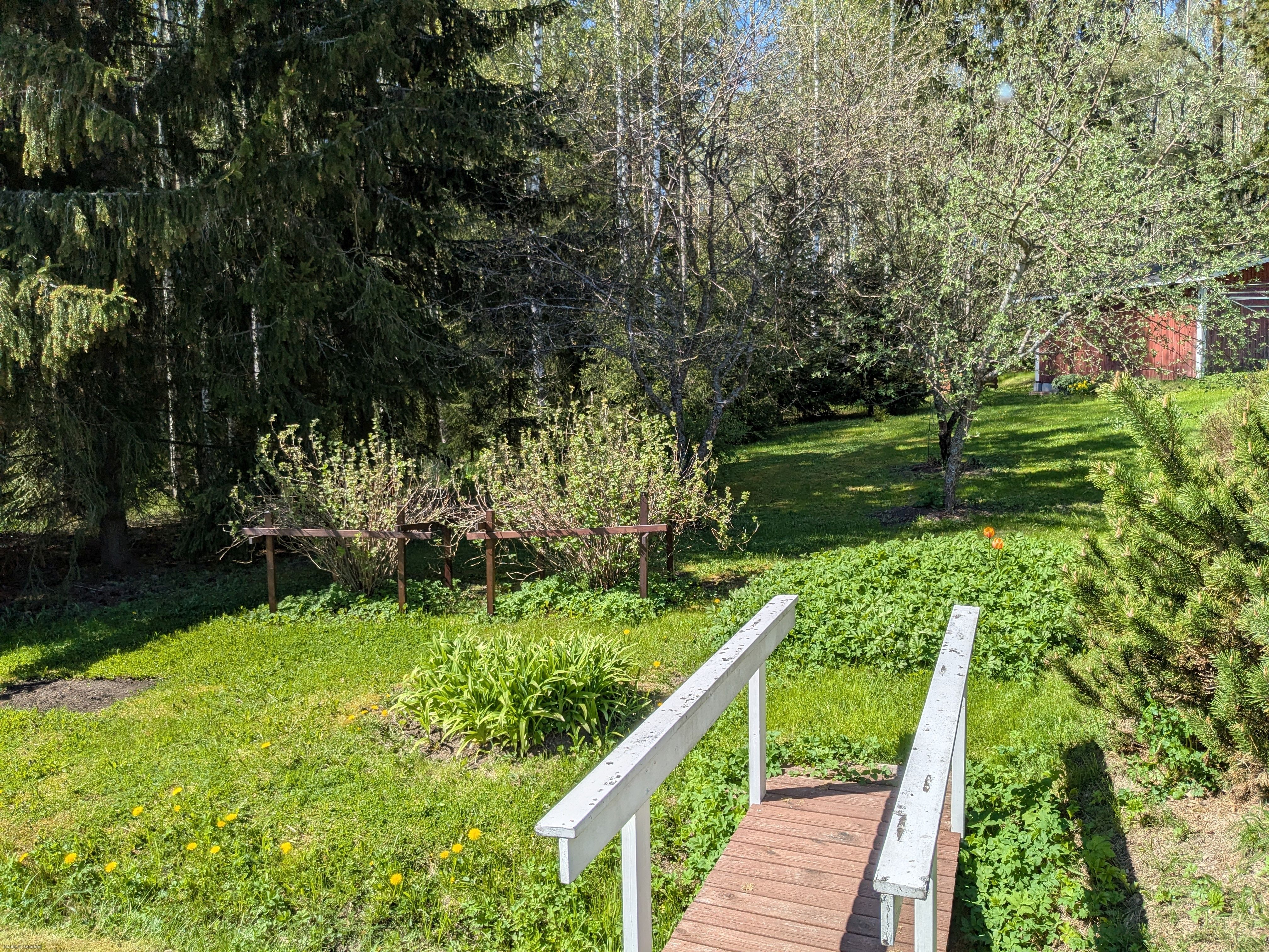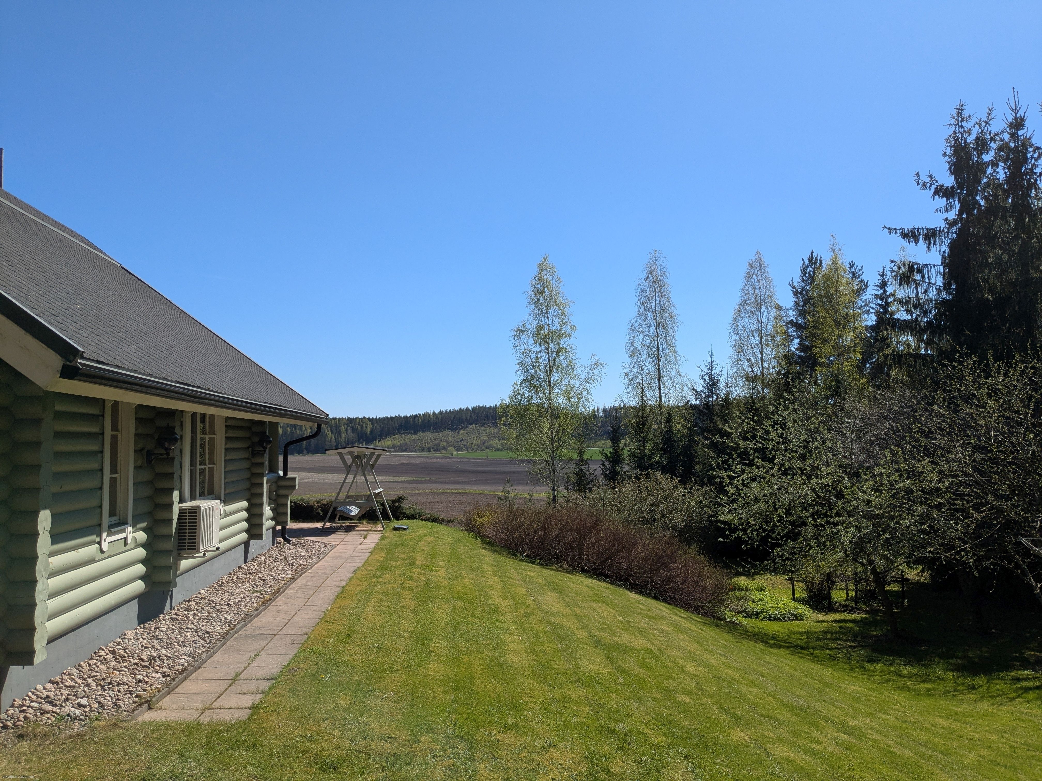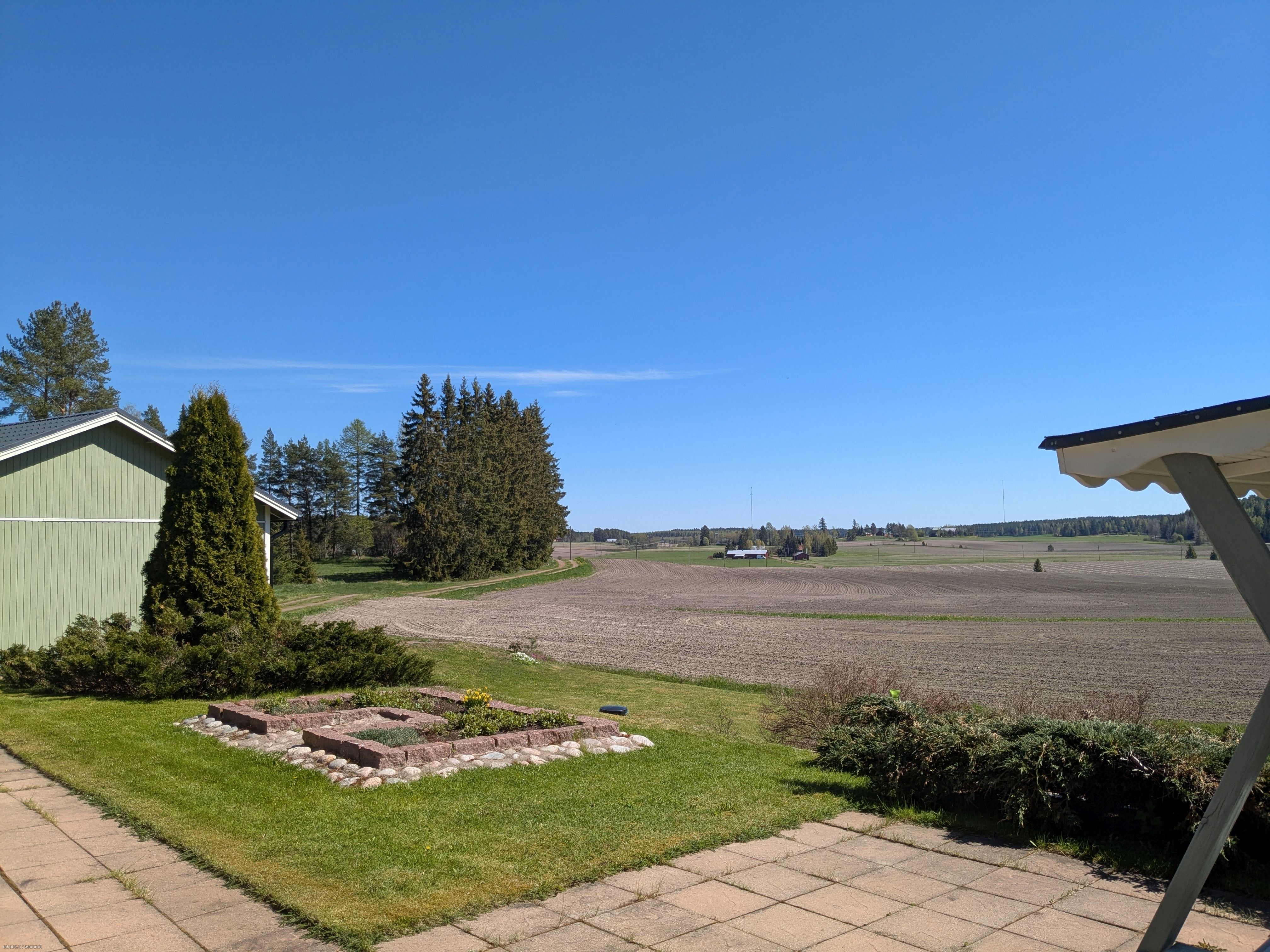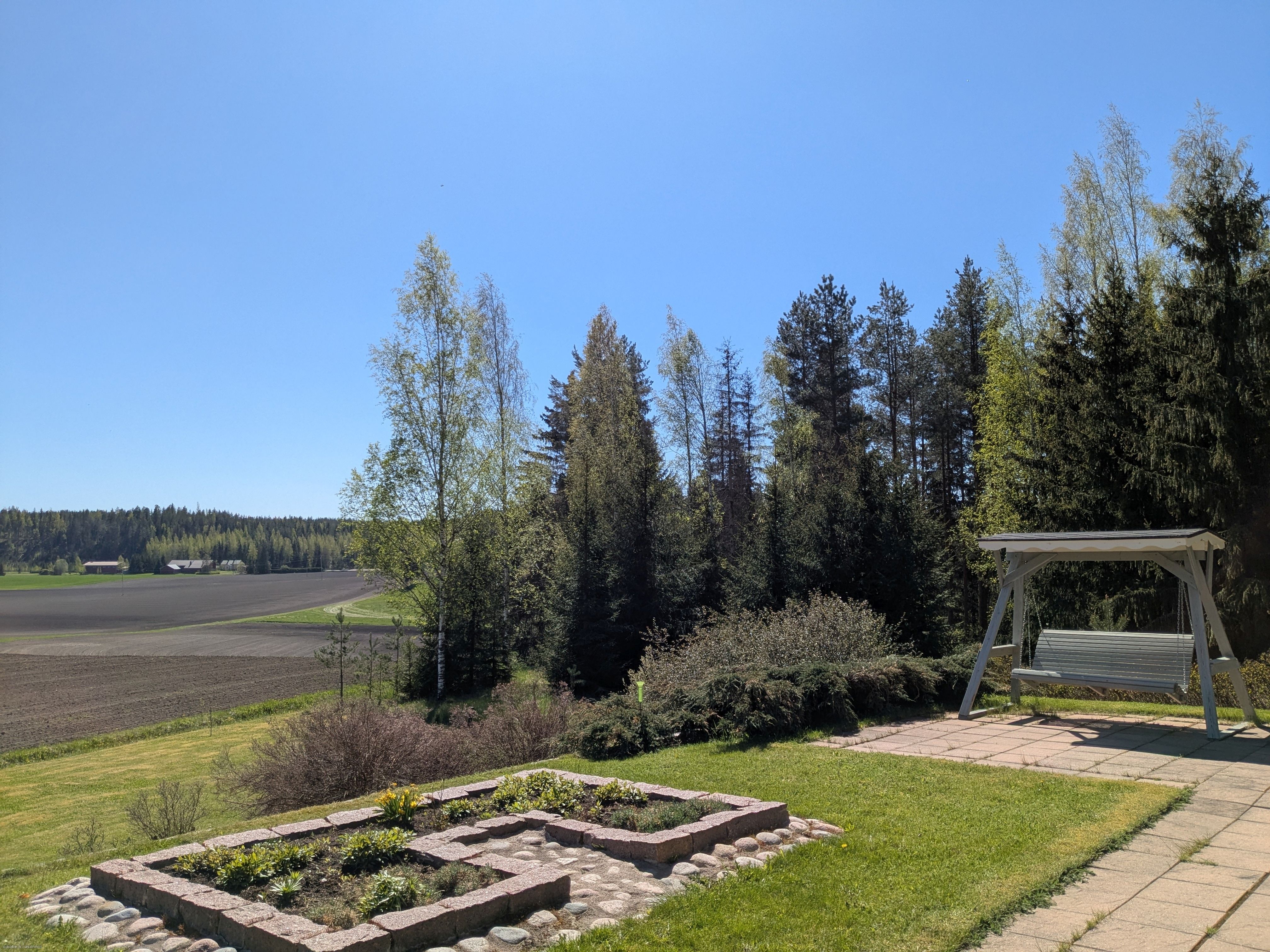Terassilta ja tuvasta aukeaa kaunis peltomaisema kauas horisonttiin. Pihassa on puutarhaa, omaa metsää sekä tasainen nurmialue kesäpeleille.