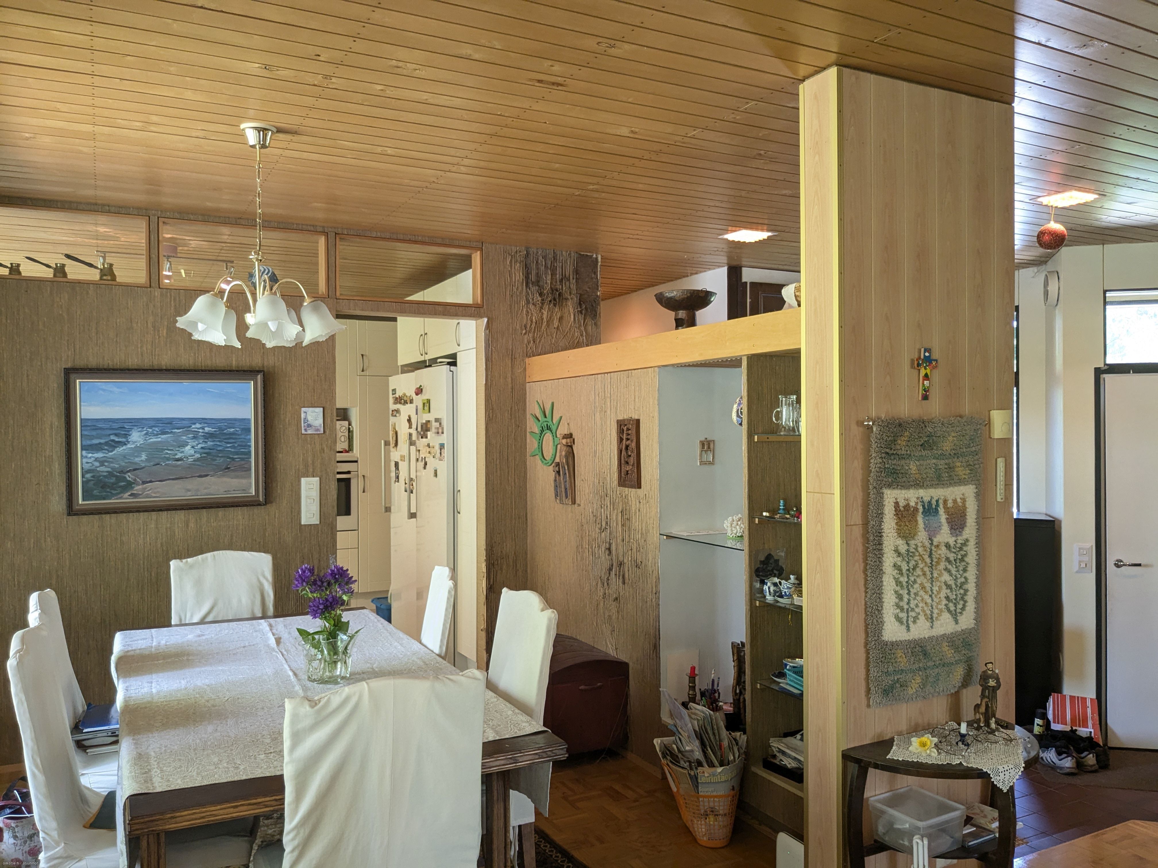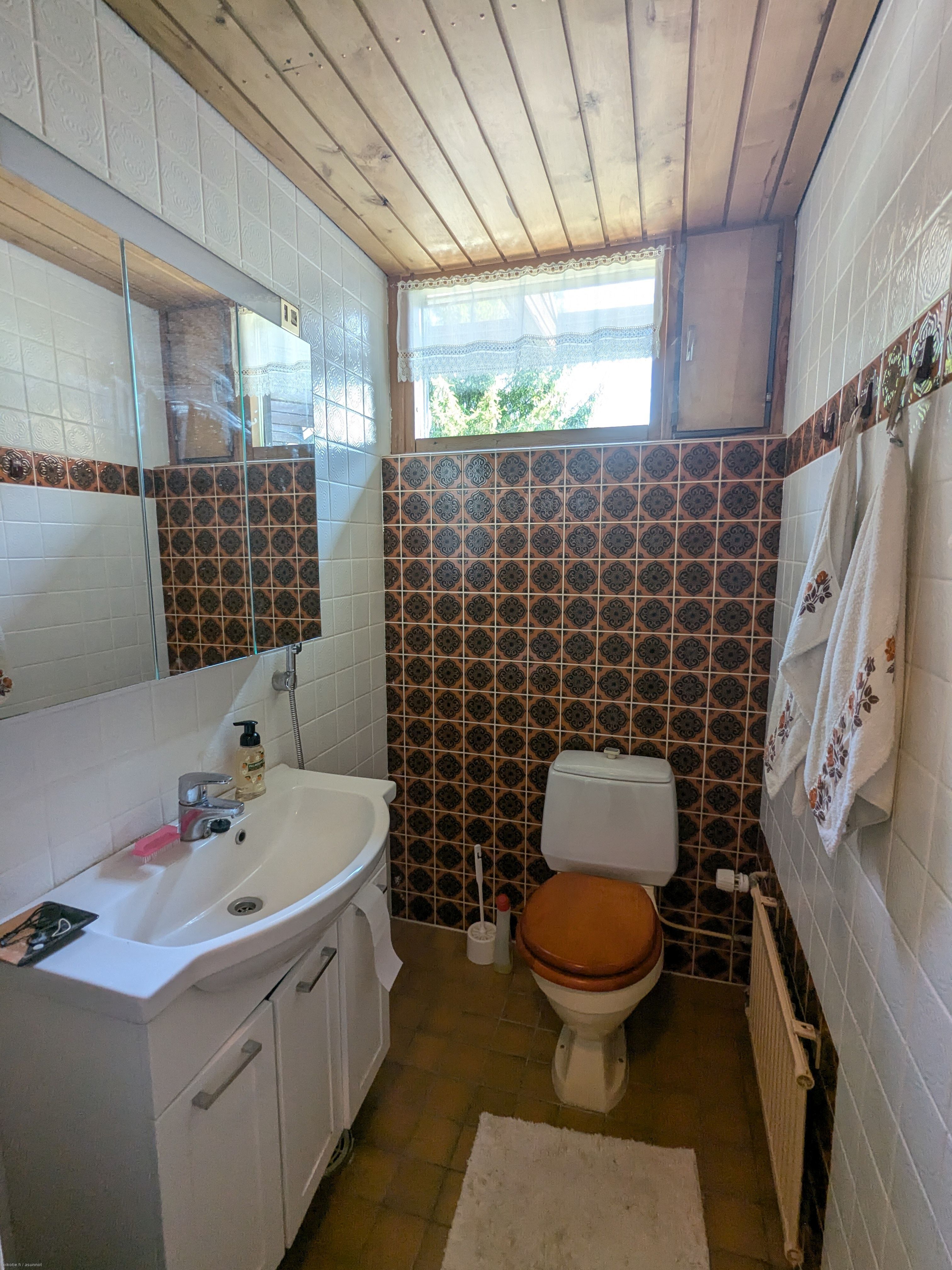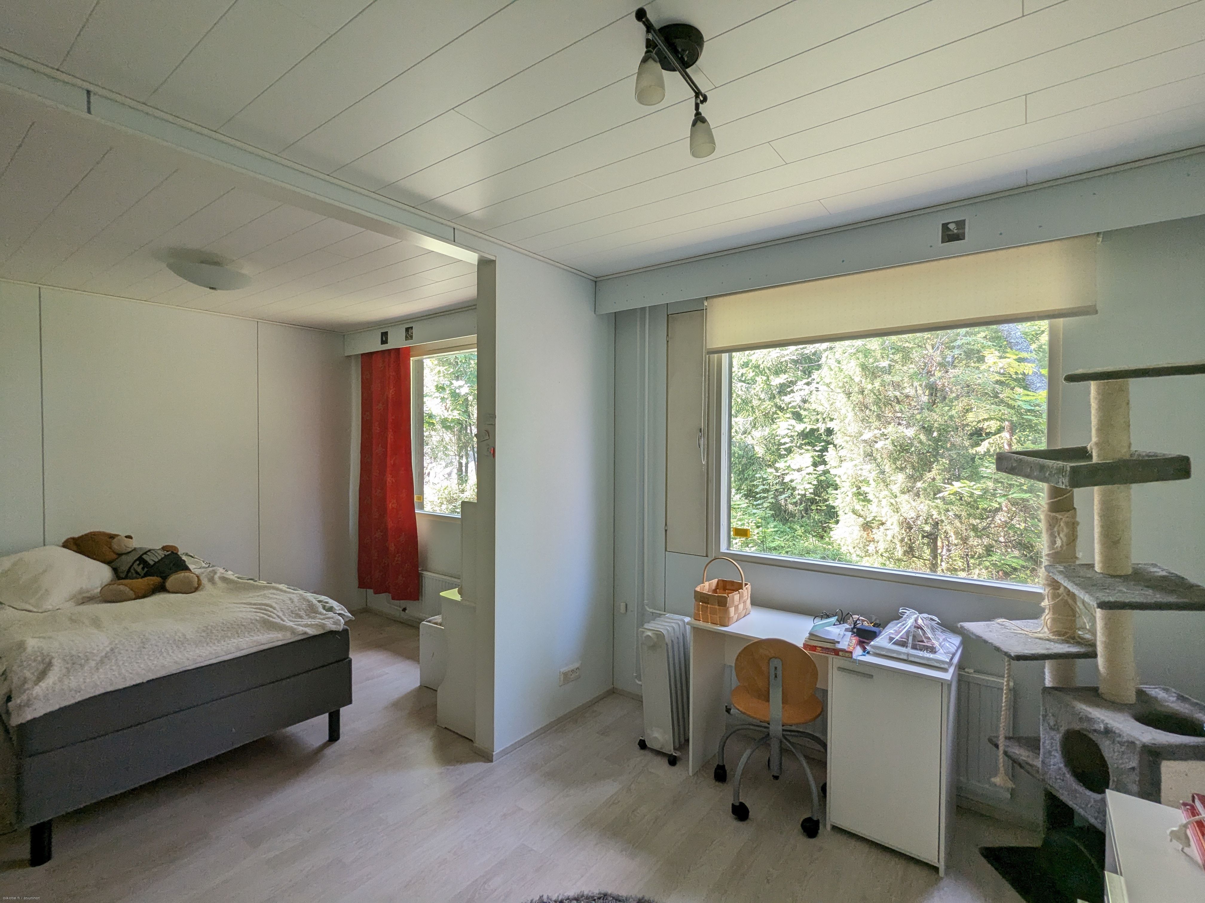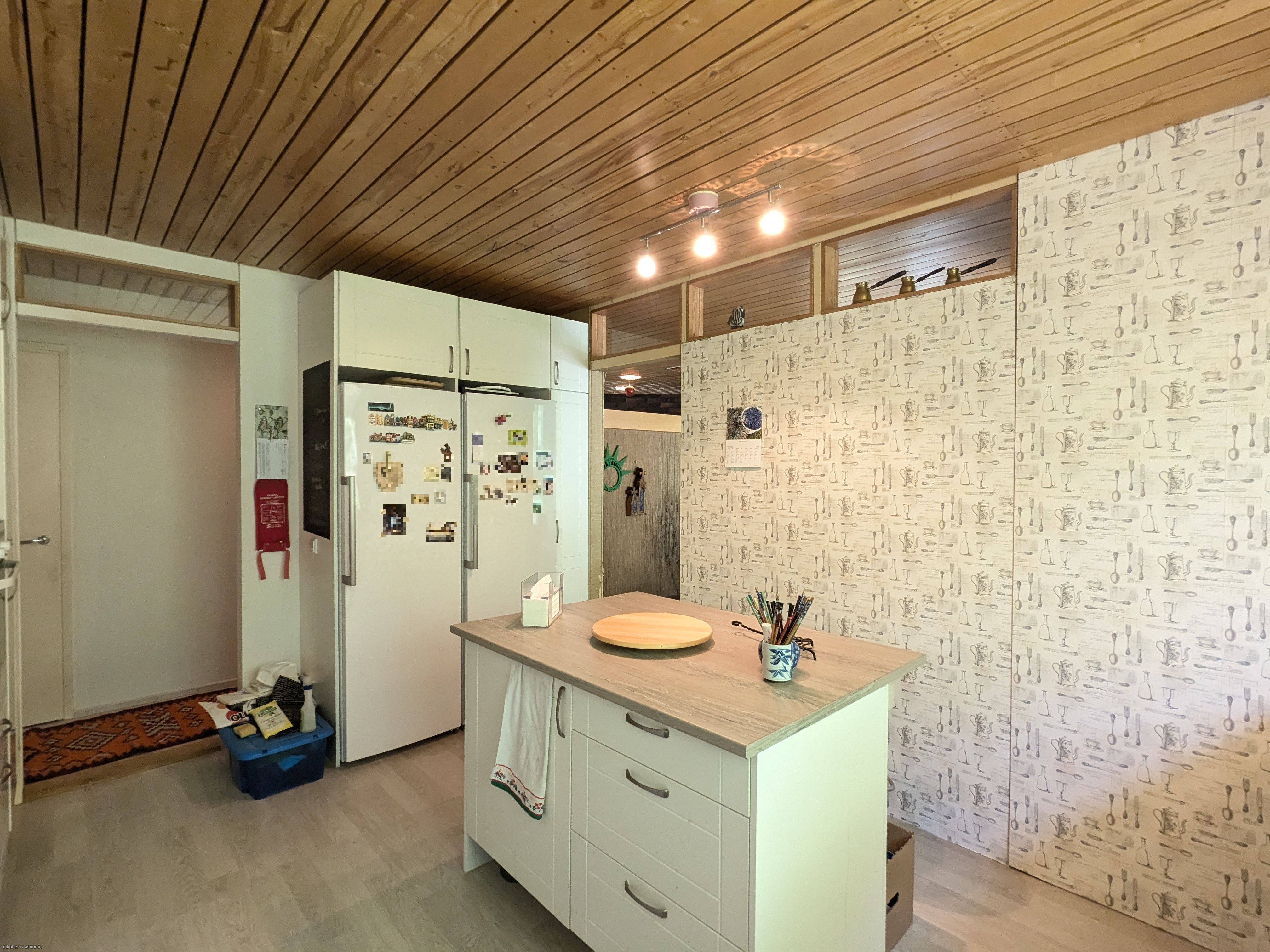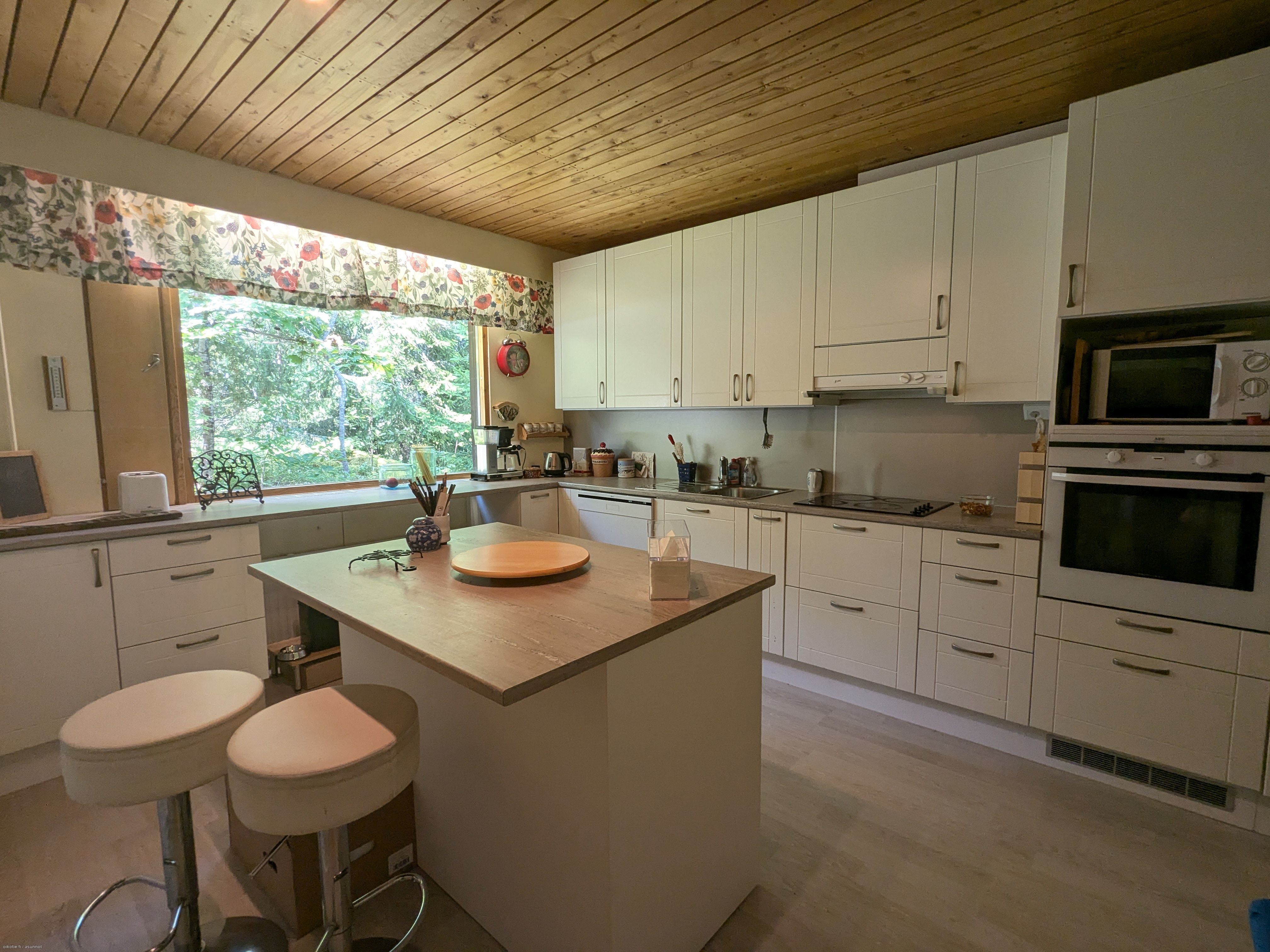 Vuonna 2016 uusitussa vaaleasävyisessä keittiössä on runsaasti työskentelytilaa, modernit koneet sekä tilava saareke. Asuinsiivessä sijaitsee kaksi isoa makuuhuonetta, pieni kodinhoitohuone, jossa on pyykinpesukonevalmius sekä talon toinen WC-tila.