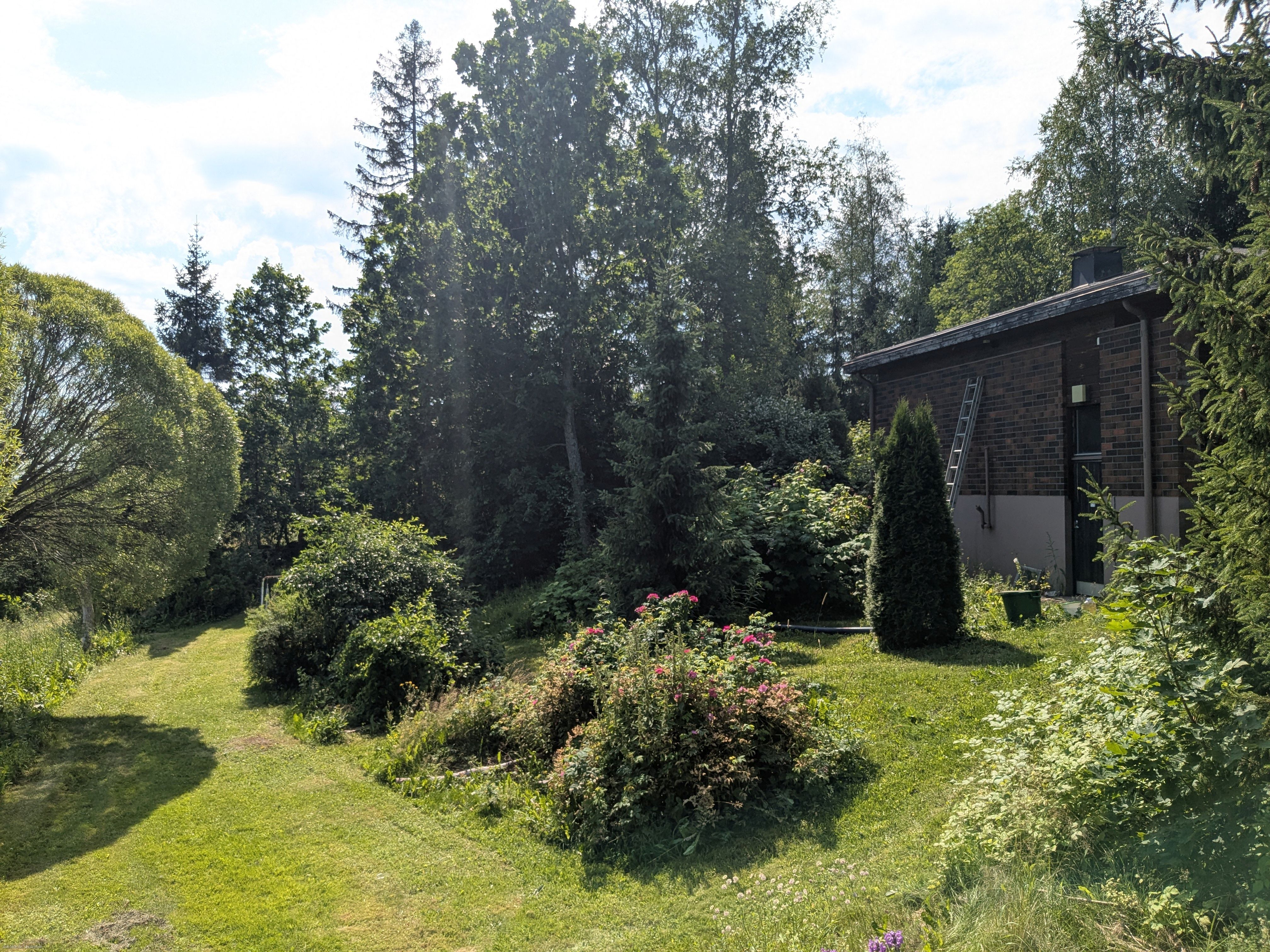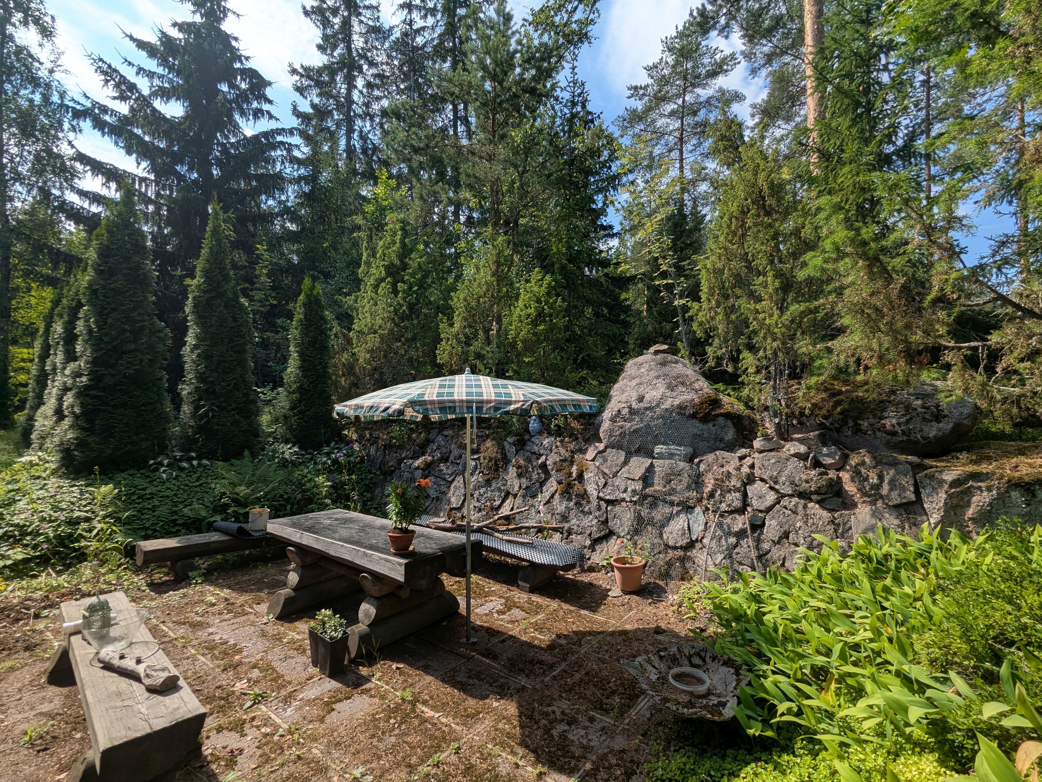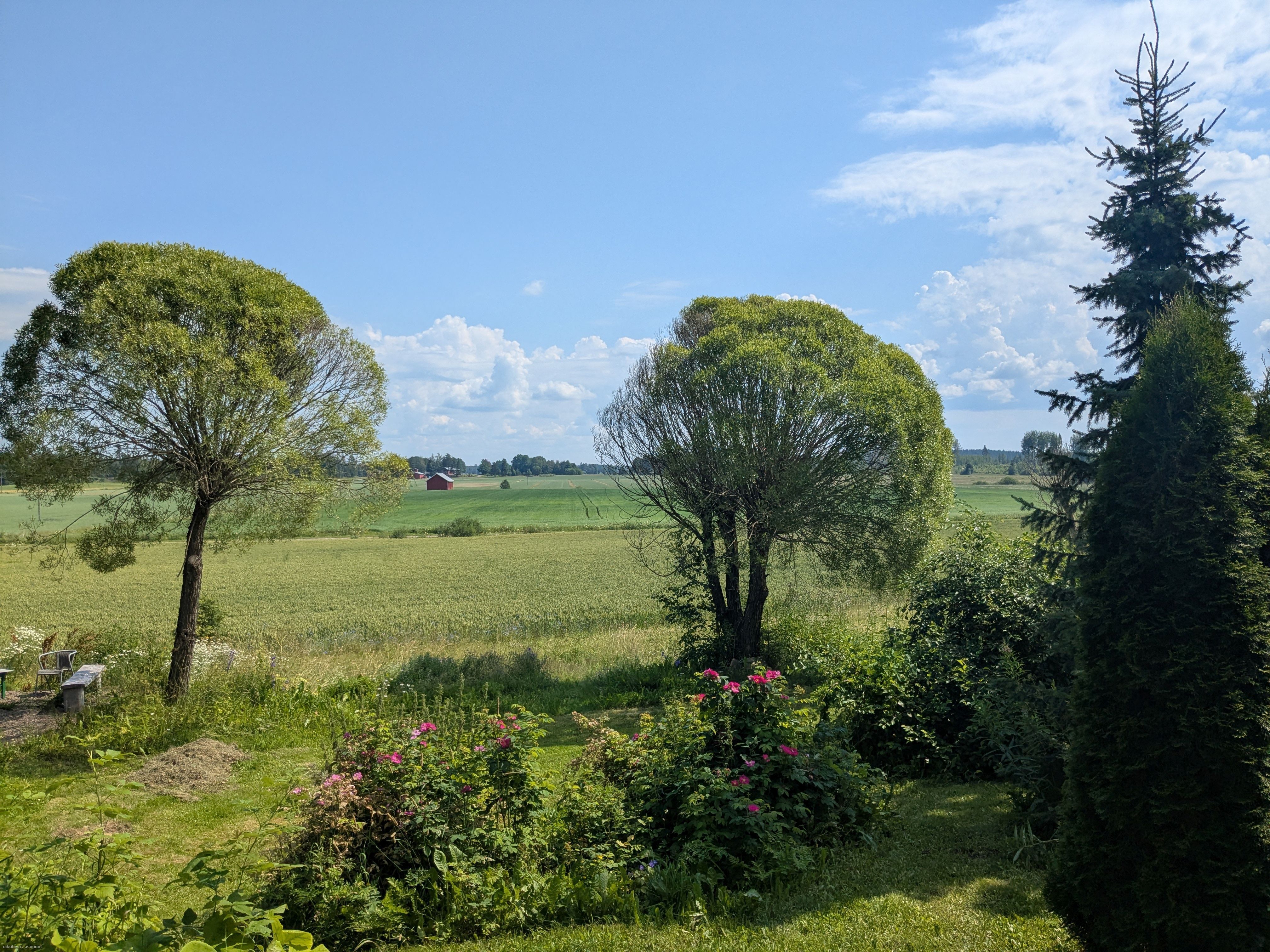 Ruokailu- sekä uima-allas tilasta kulku takapihalle. Metsikköön ja peltomaisemaan rajoittuvassa pihapiirissä on monipuolista puutarhakasvillisuutta, kasvihuone, 8 omenapuuta ja paljon muuta. Pellonlaidalla sijaitsevalta grillipaikalta ja puutarhasta aukeaa kaunis maalaismaisema. Asuinrakennuksen yhteydessä on varastotiloja sekä lämmin ja vesipisteellinen autotalli, jonka edessä sijaitsevalla hiekkapihalla pysäköintitilaa useammalle autolle.