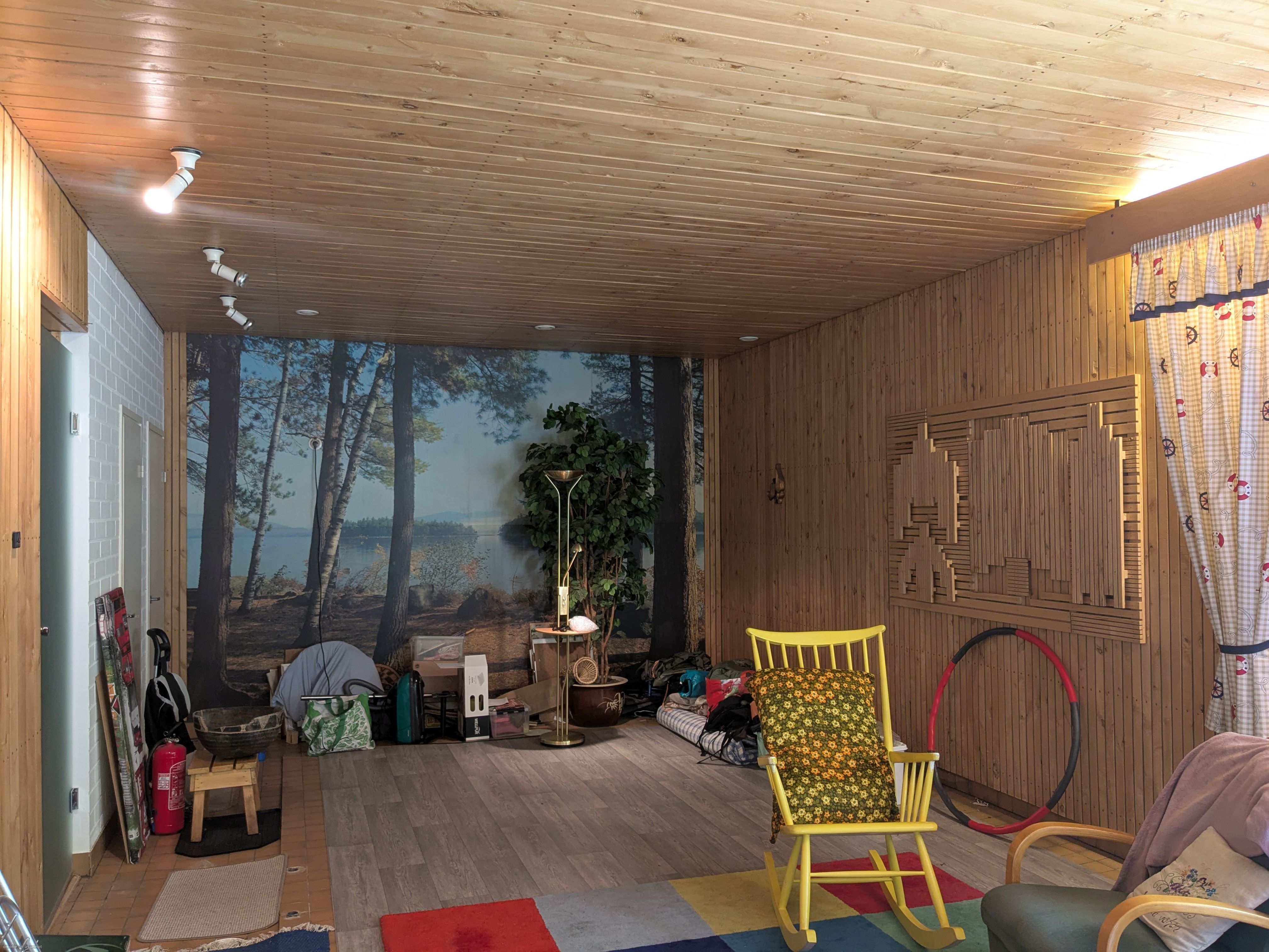 Kylpyhuone ja saunatiloja edeltää avotakallinen takkahuone sekä iso alkuperäisessä tarkoituksessaan uima-allas tilana toiminut huonekorkeudeltaan korkea tila. Ostajan halutessa on uima-allas on mahdollista ottaa takaisin käyttöön.