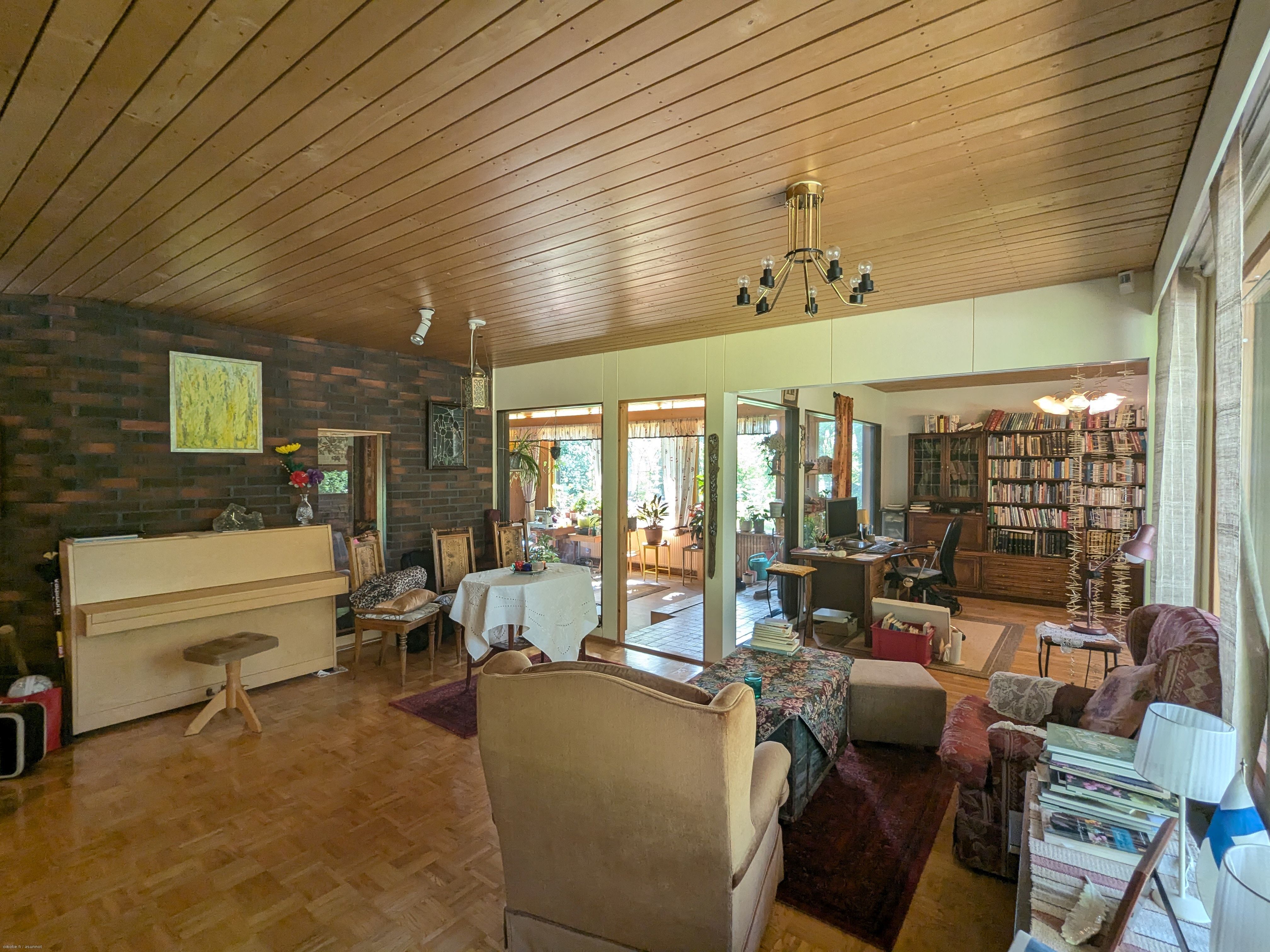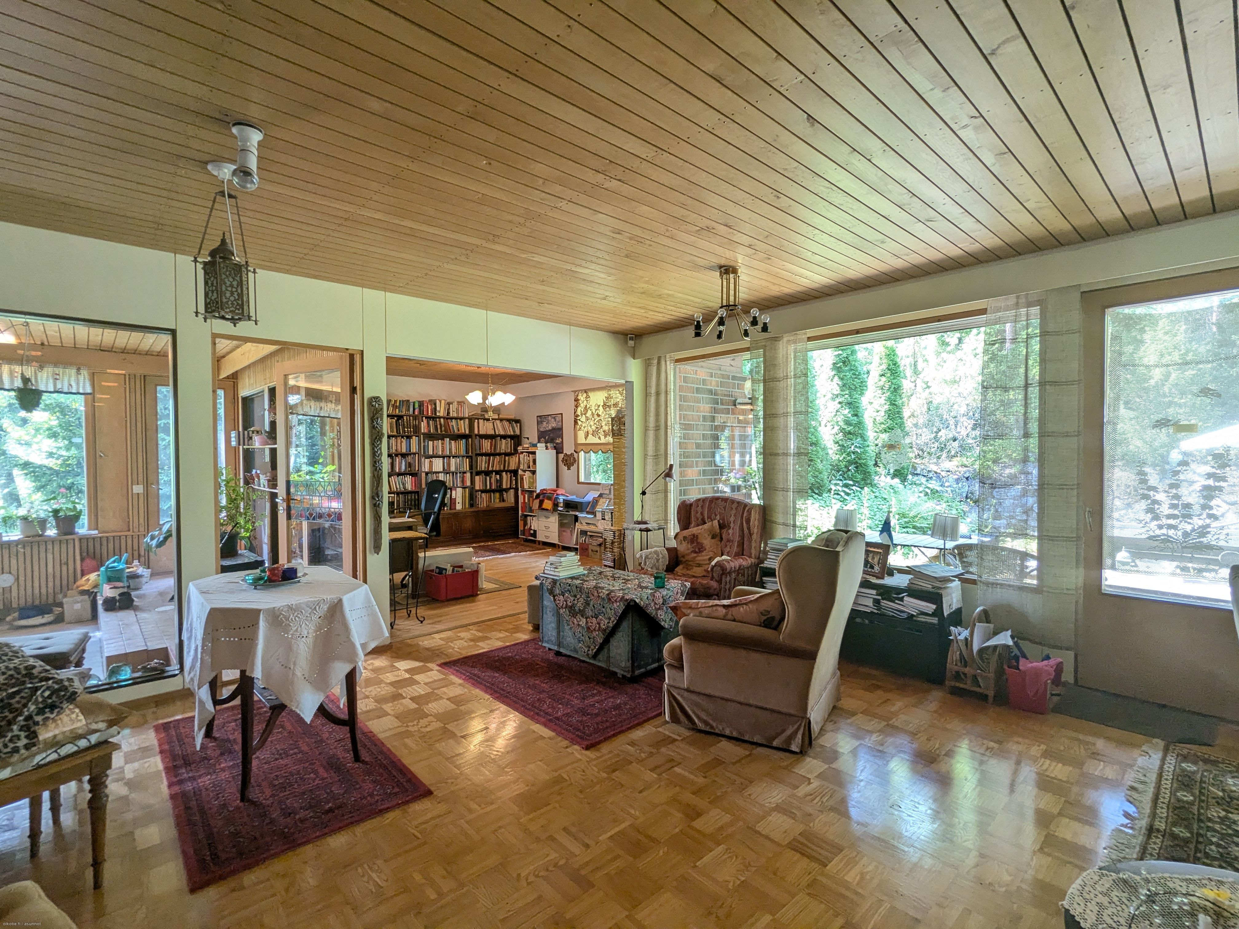 Energialuokaltaan D2018 kodissa on vuonna 2018 asennettu maalämpö. Heti sisään tultaessa katse kiinnittyy avaraan ja yhtenäiseen eteis- ja olohuone tilaan, joka yhdistyy keittiön ruokailutilaan. Olohuoneen perällä on iso kirjasto/työhuonetila, jossa on uusi tammiparketti.