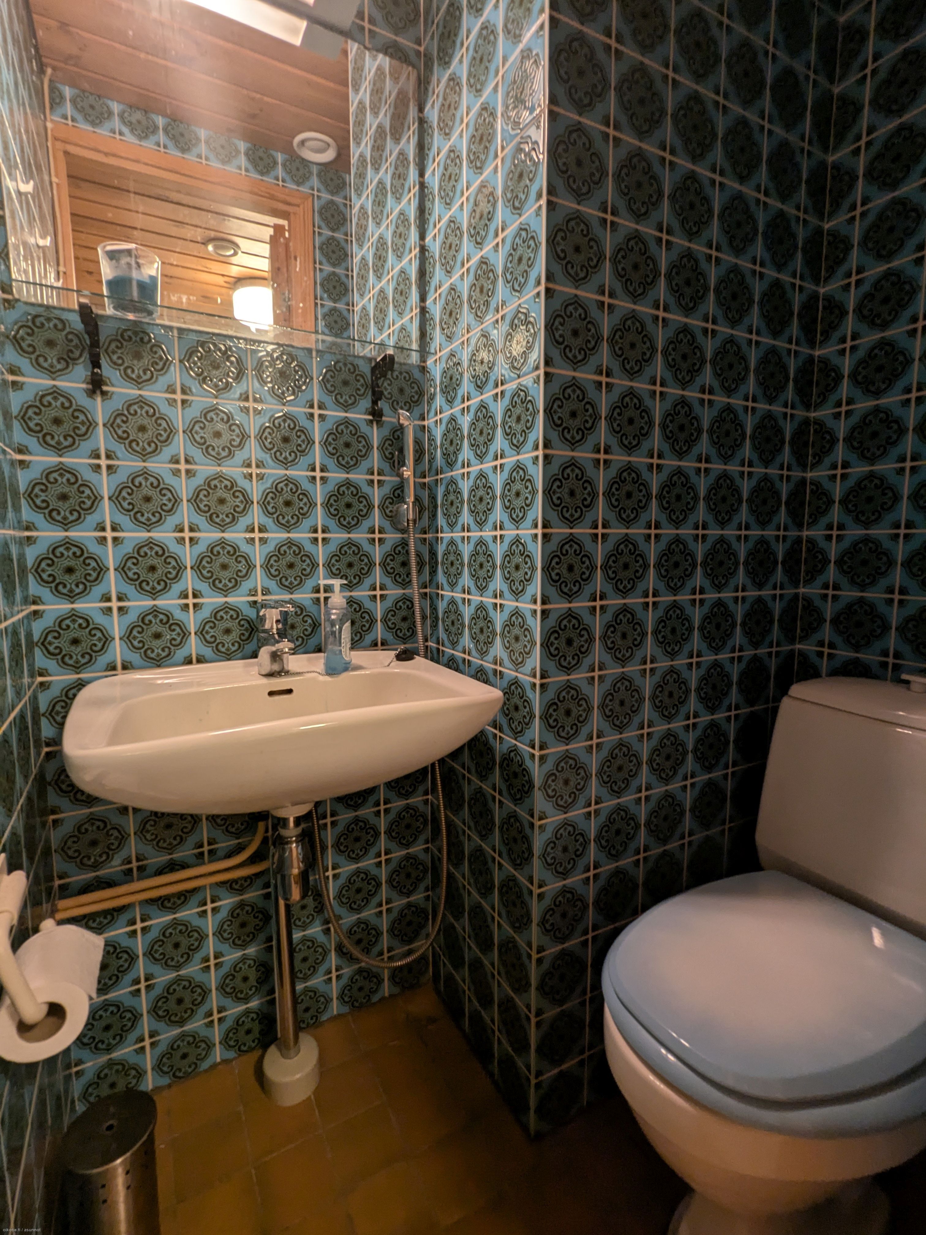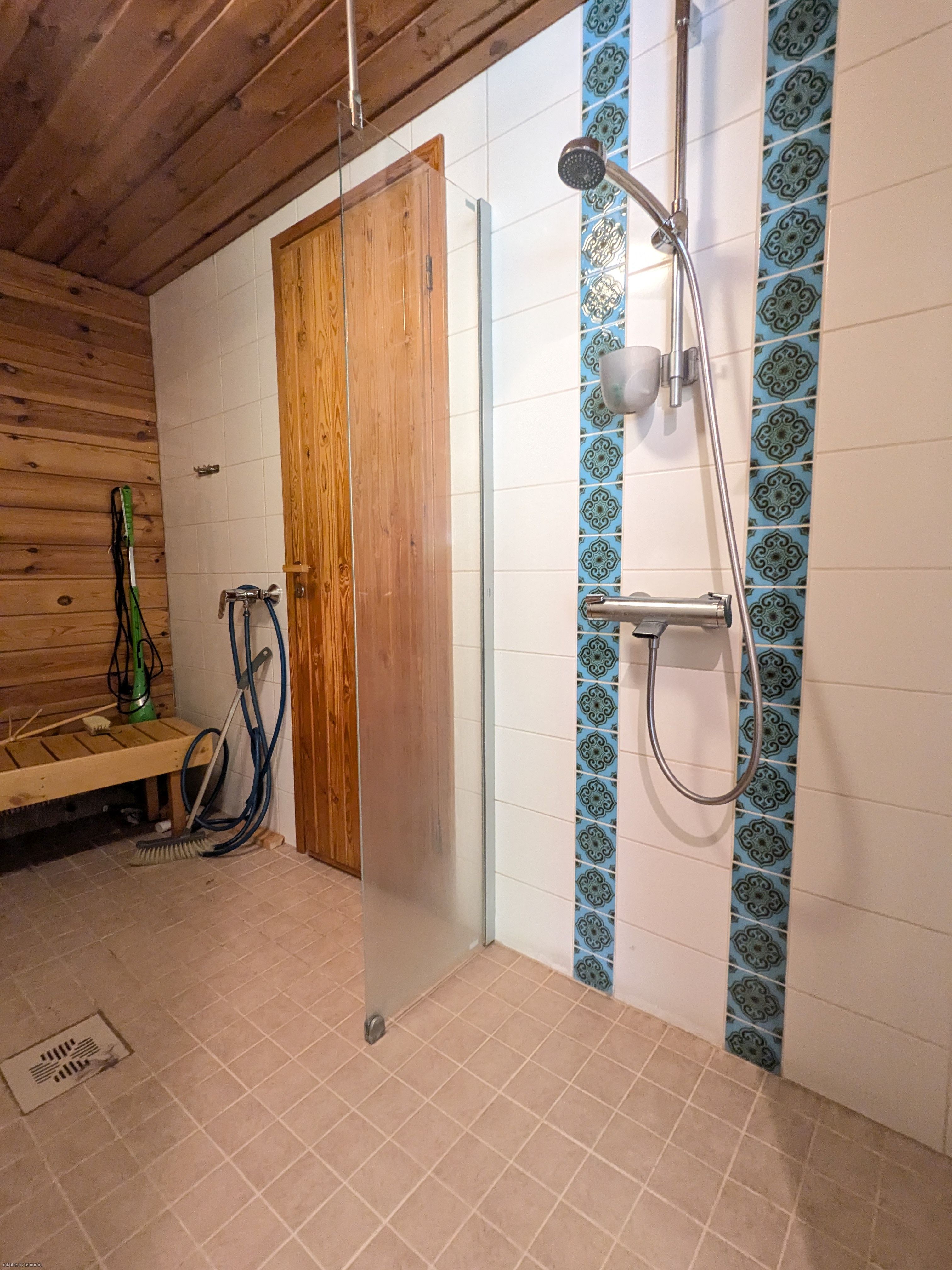 Varusteet: Sähkökiuas, Lattiakaivo. Lattiamateriaali: Laattalattia