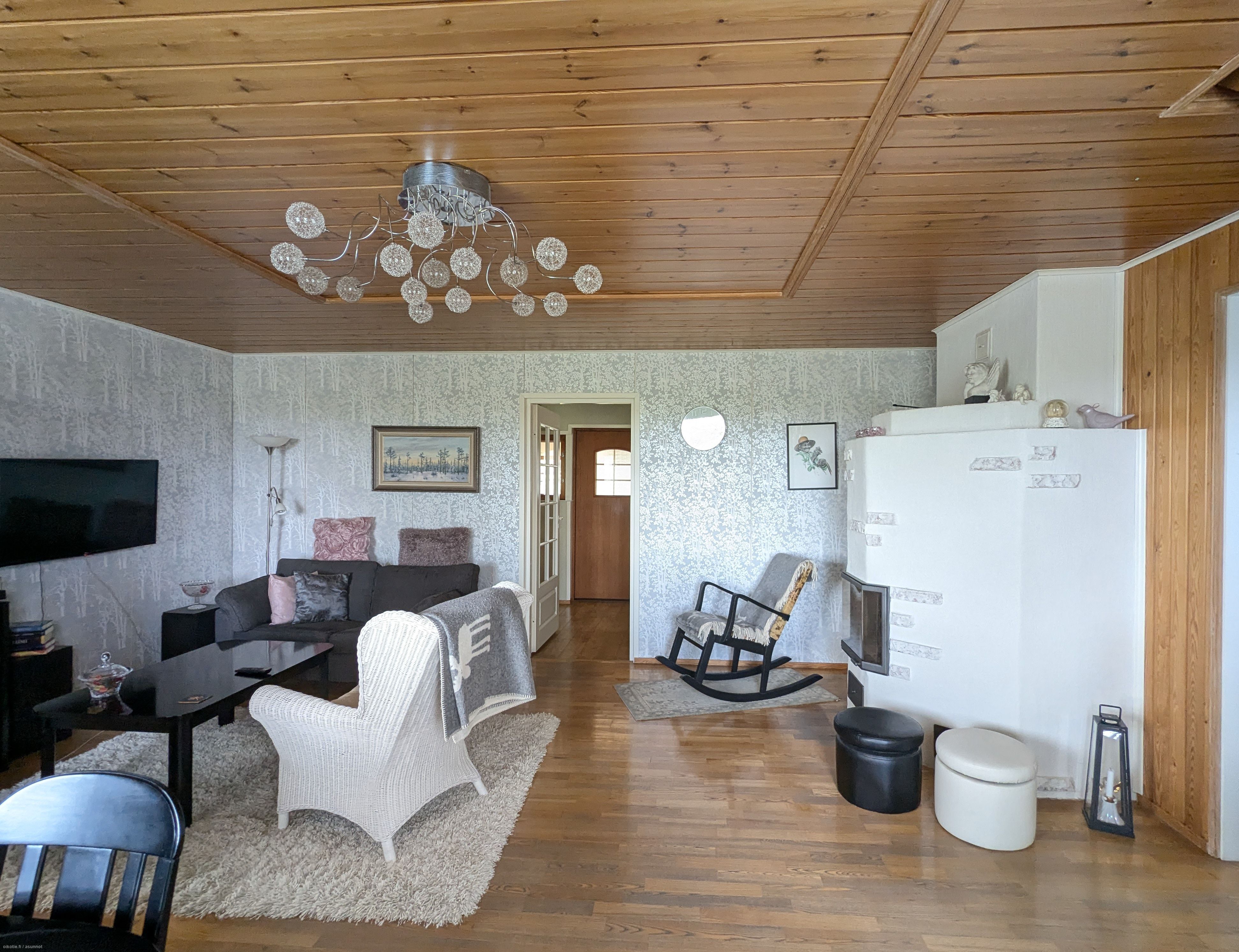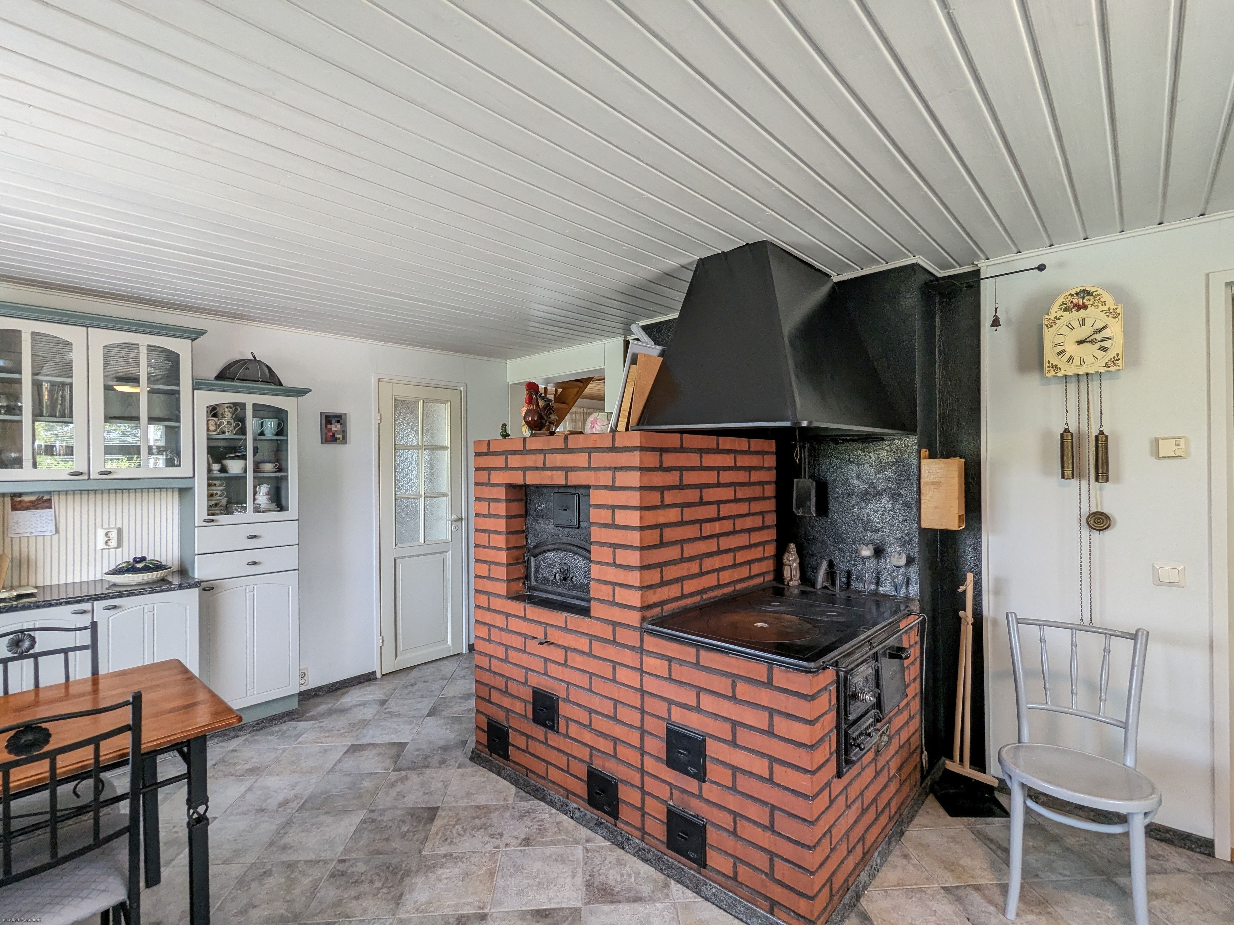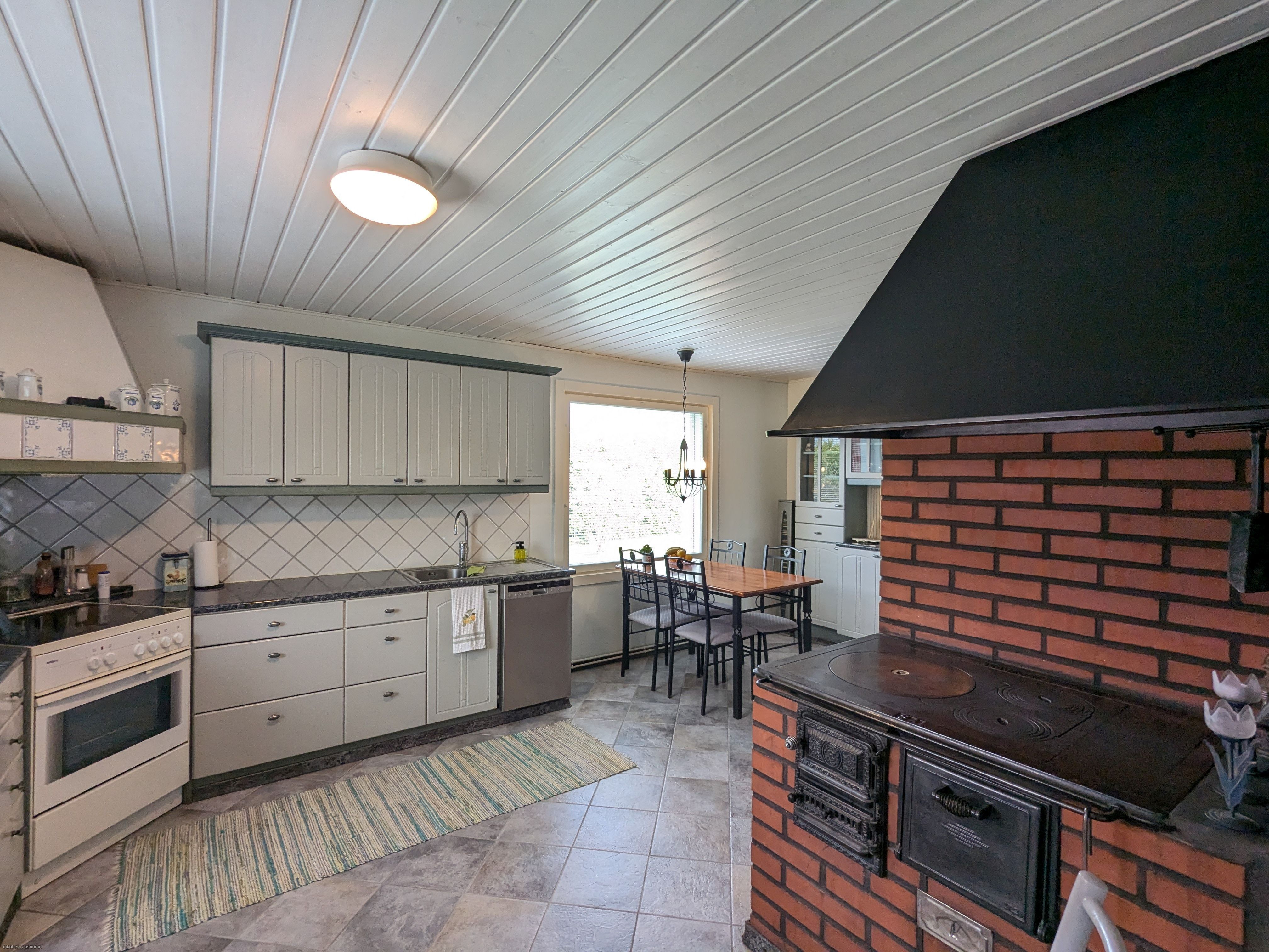 Varusteet: Jääkaappipakastin, Astianpesukone, Astianpesukoneliitäntä. Työtaso: Laminaattitaso. Liesi: Liesituuletin hormilla, Keraaminen liesi, Puuhella, Leivinuuni