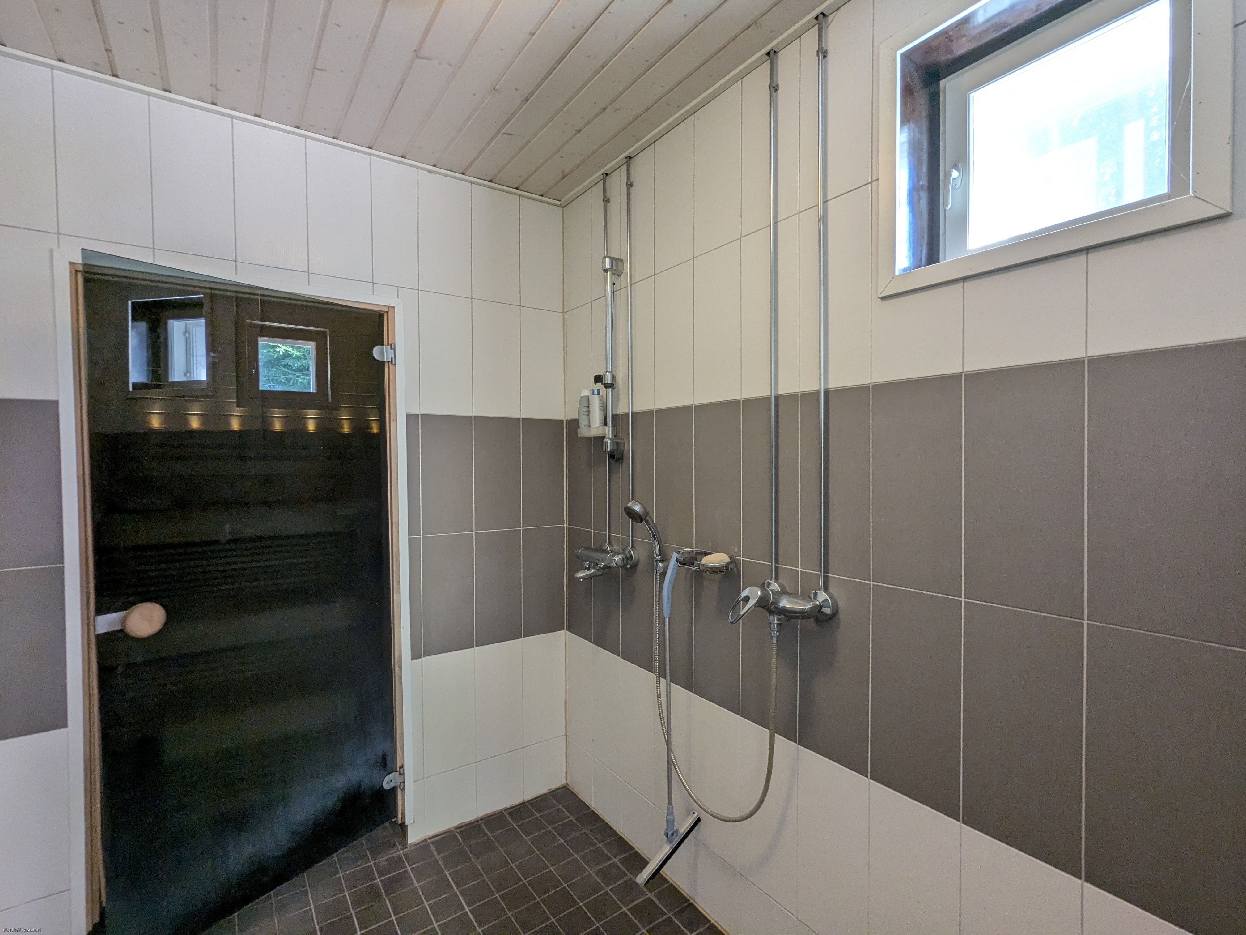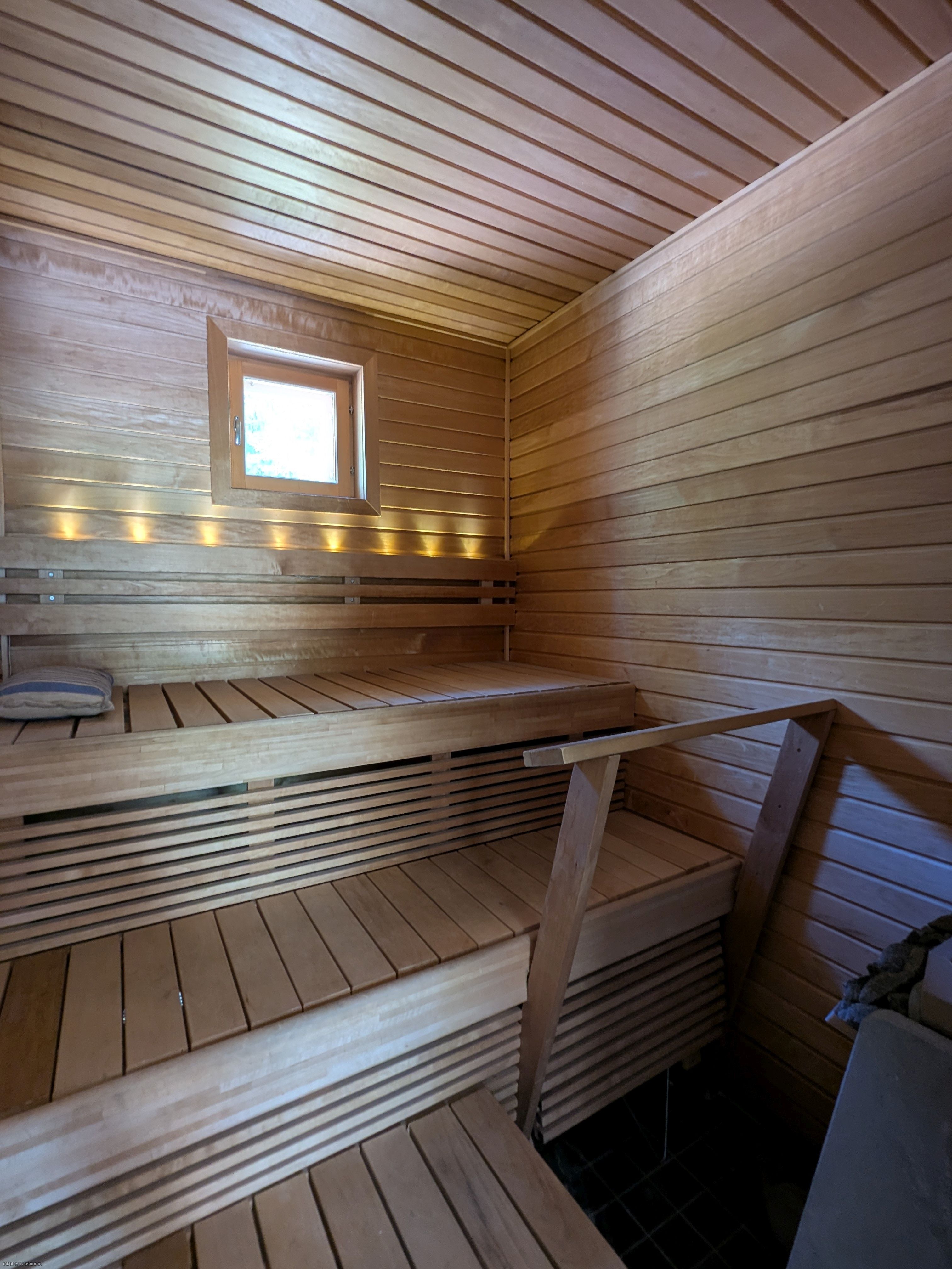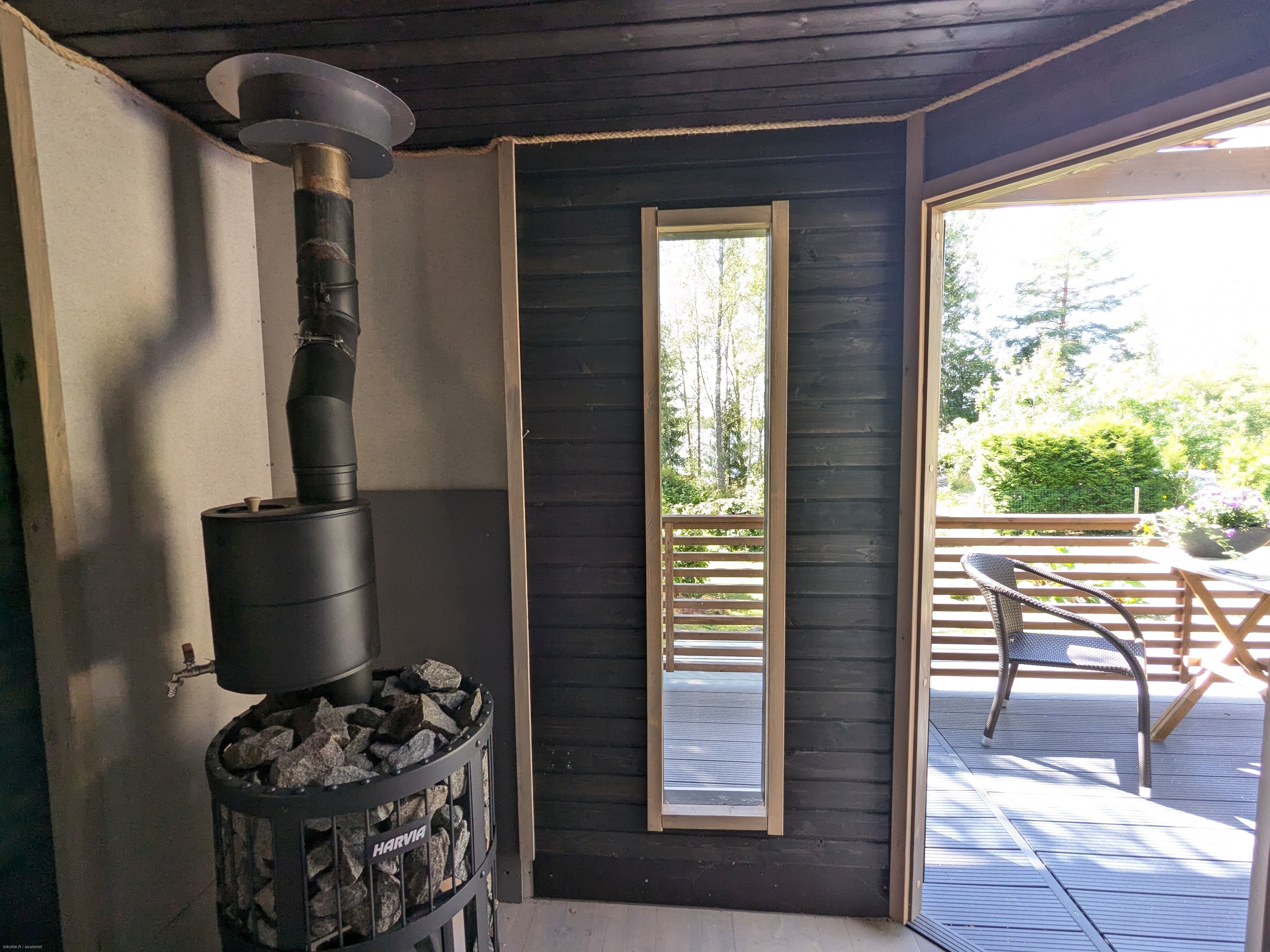 Pihasaunassa puukiuas ja kantovesi. Sähkökiuas. Lattiamateriaali: Laattalattia