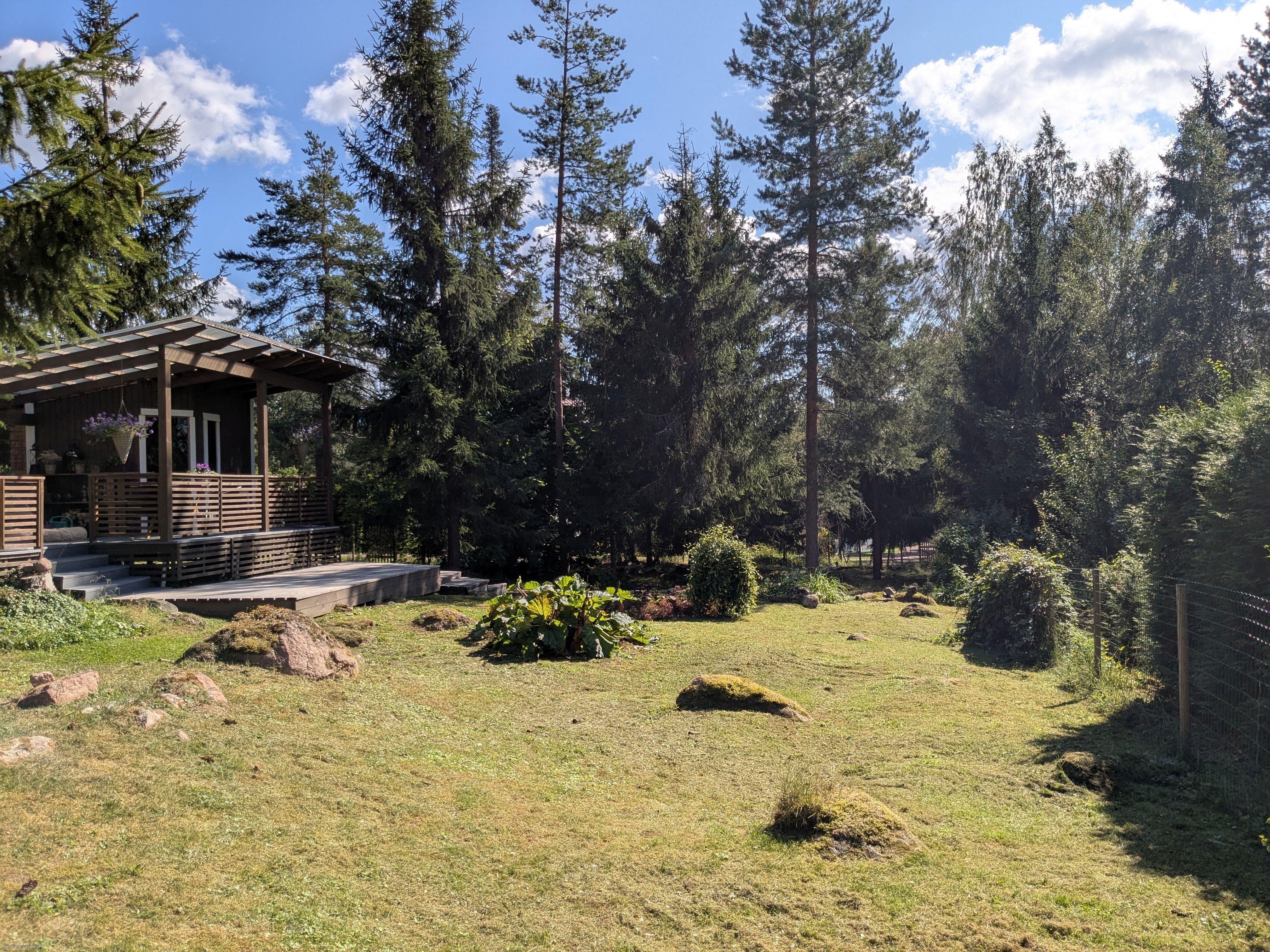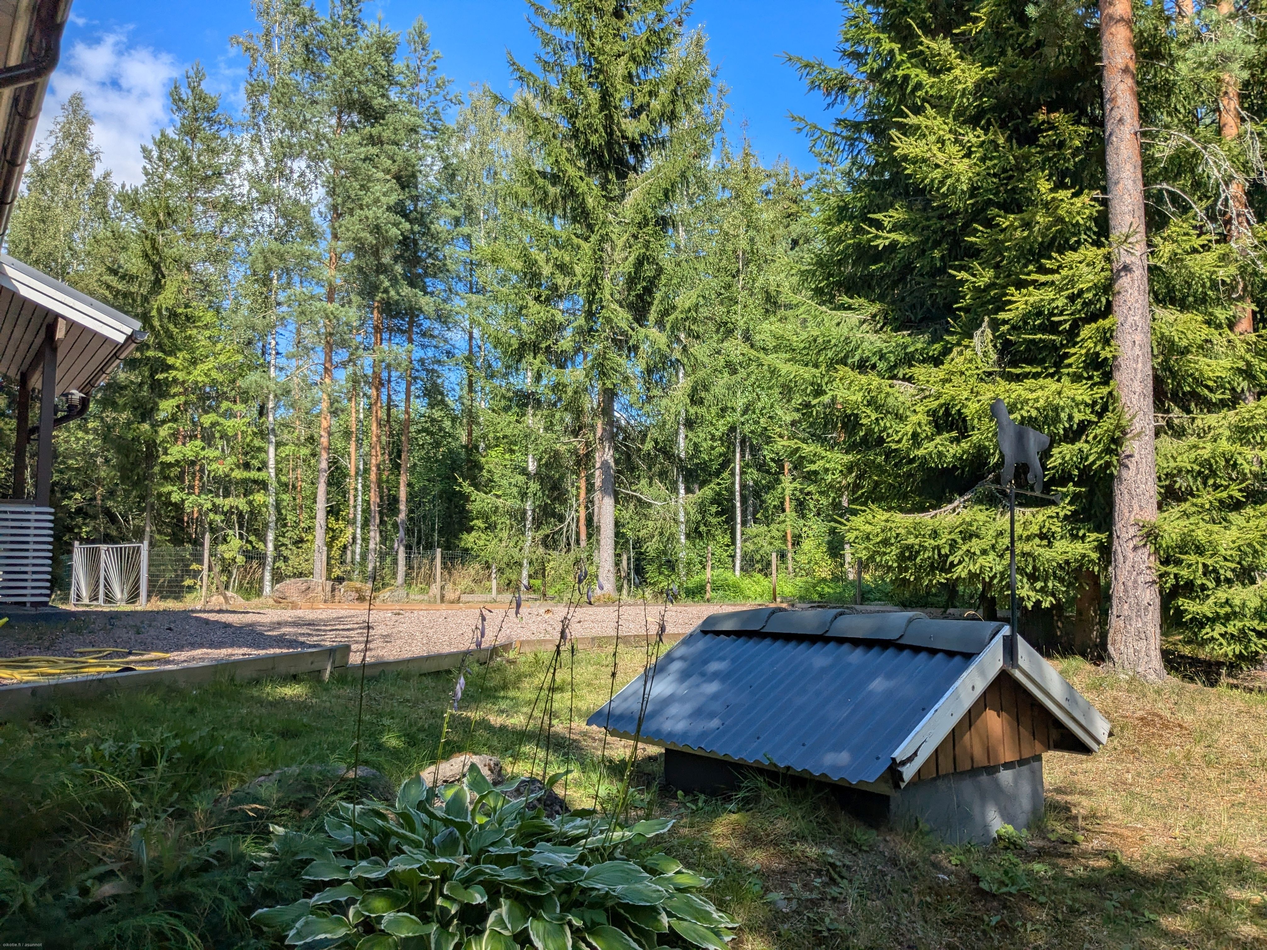 Metsätonttimainen pihapiiri on helppohoitoinen ja osittain aidattu. Tontti jatkuu portin ulkopuolella, jossa on pysäköintialue sekä mahdollisuus rakentaa autotalli tai -katos. Pihapiirissä on vuonna 2022 valmistunut puulämmitteinen ulkosauna, jonka yhteydessä katettu terassialue. Etupihan puolella on ulkovarasto sekä hiekka-aluetta.