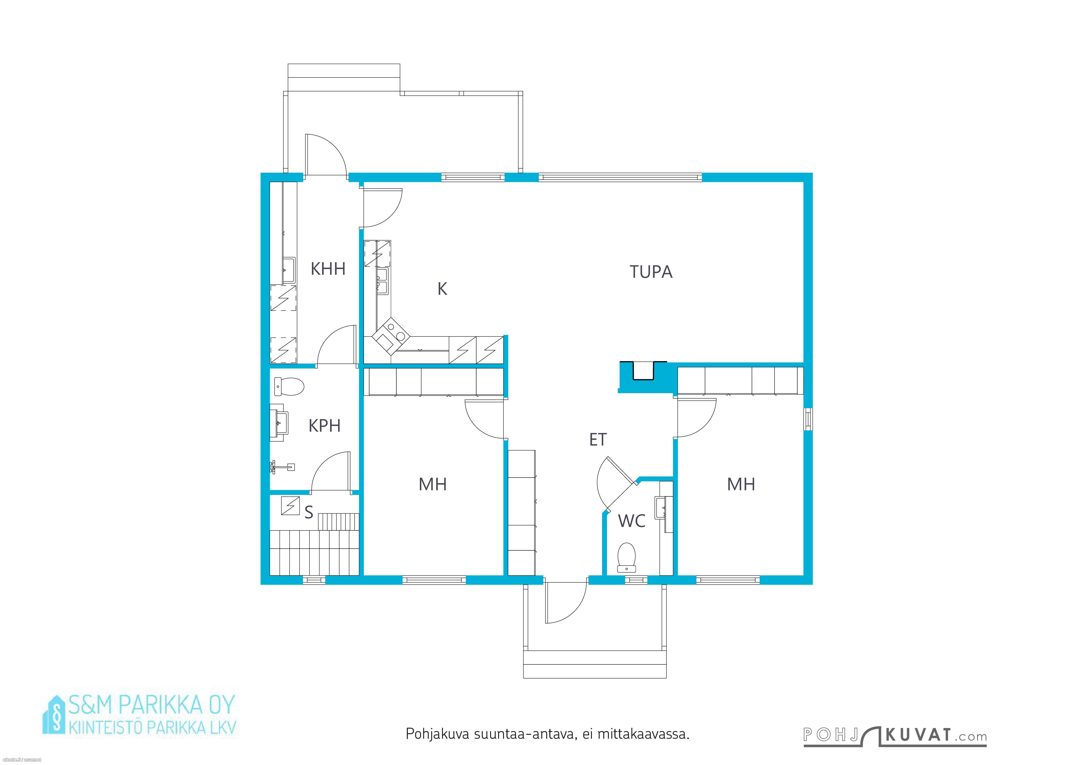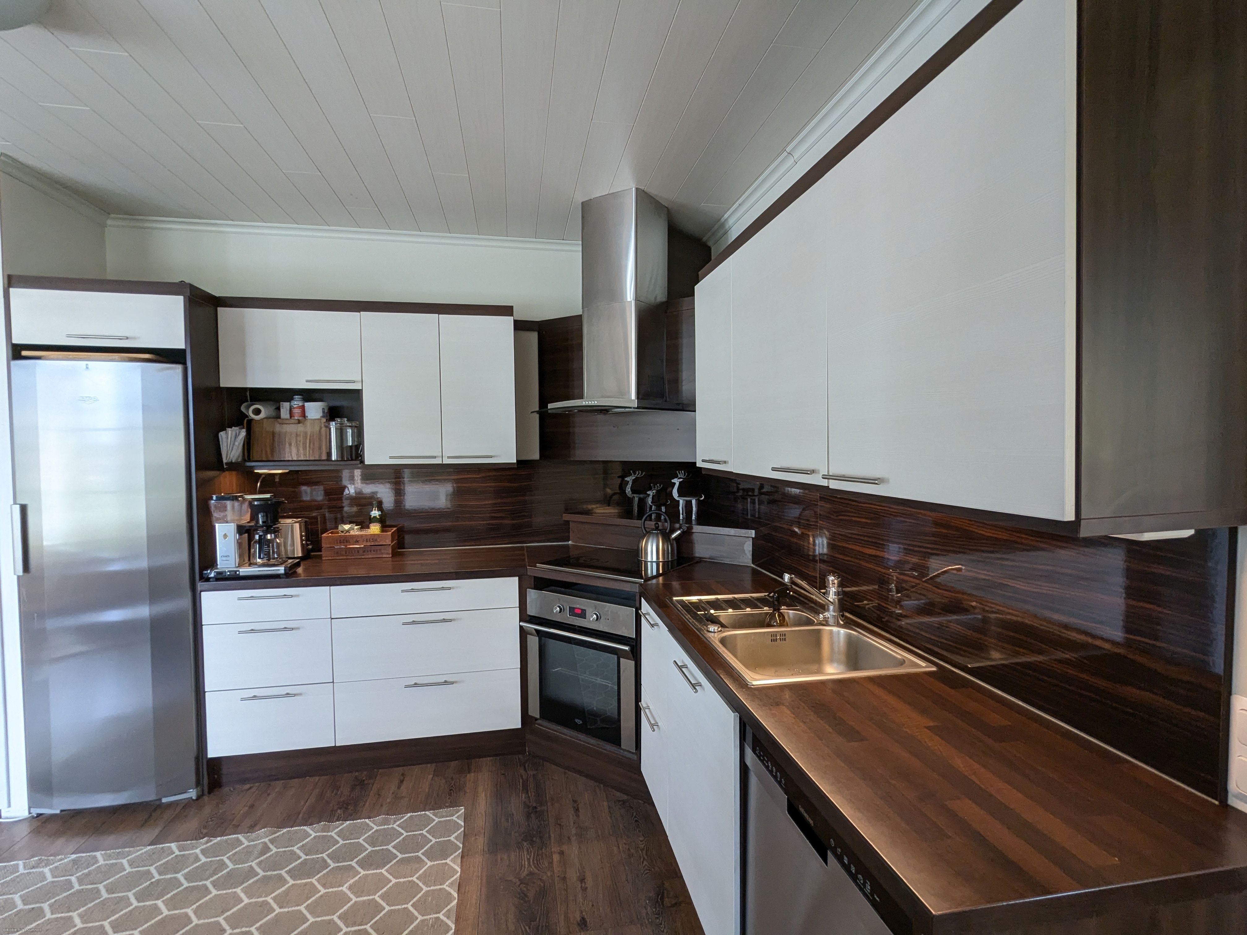 Varusteet: Jääkaappi, Pakastin, Astianpesukone. Työtaso: Laminaattitaso. Liesi: Induktioliesi, Erillisuuni, Liesituuletin hormilla. kiinteät valaisimet