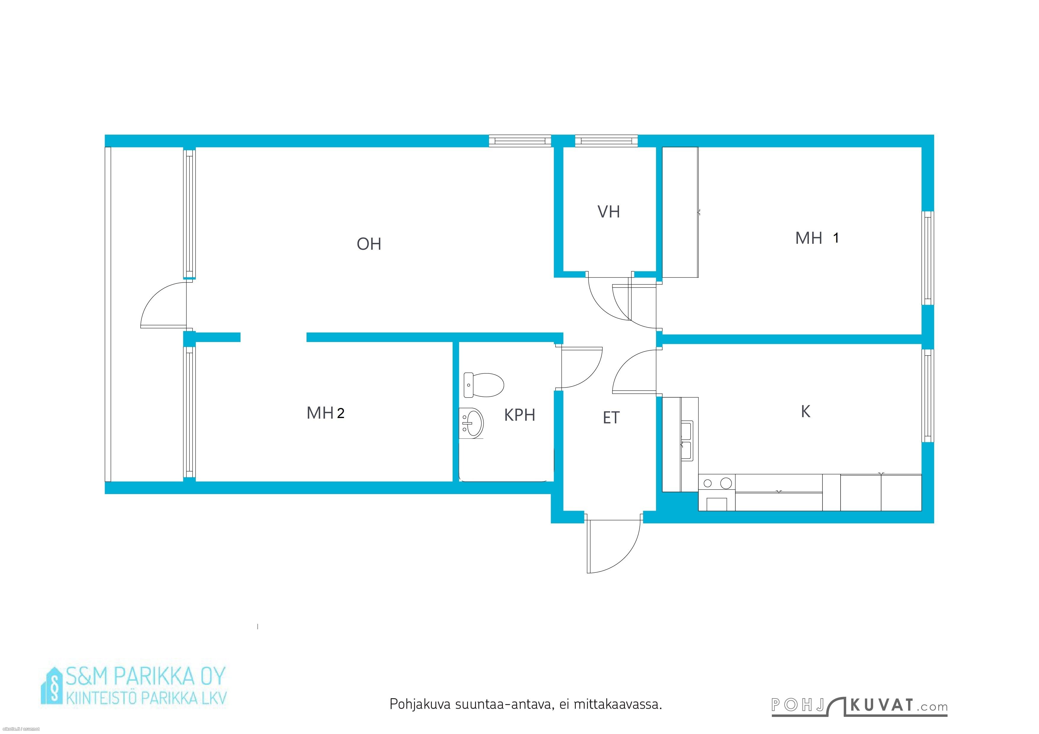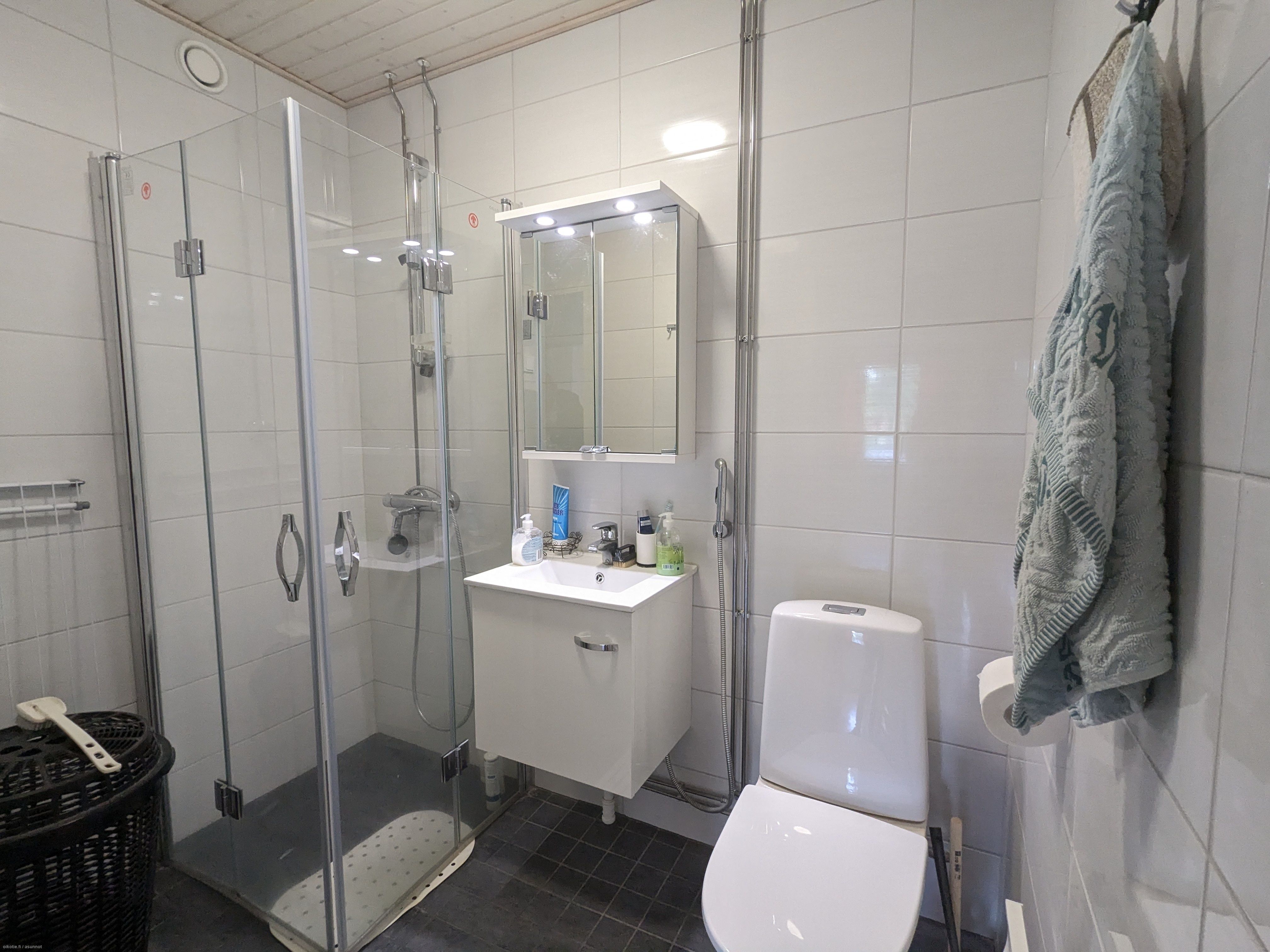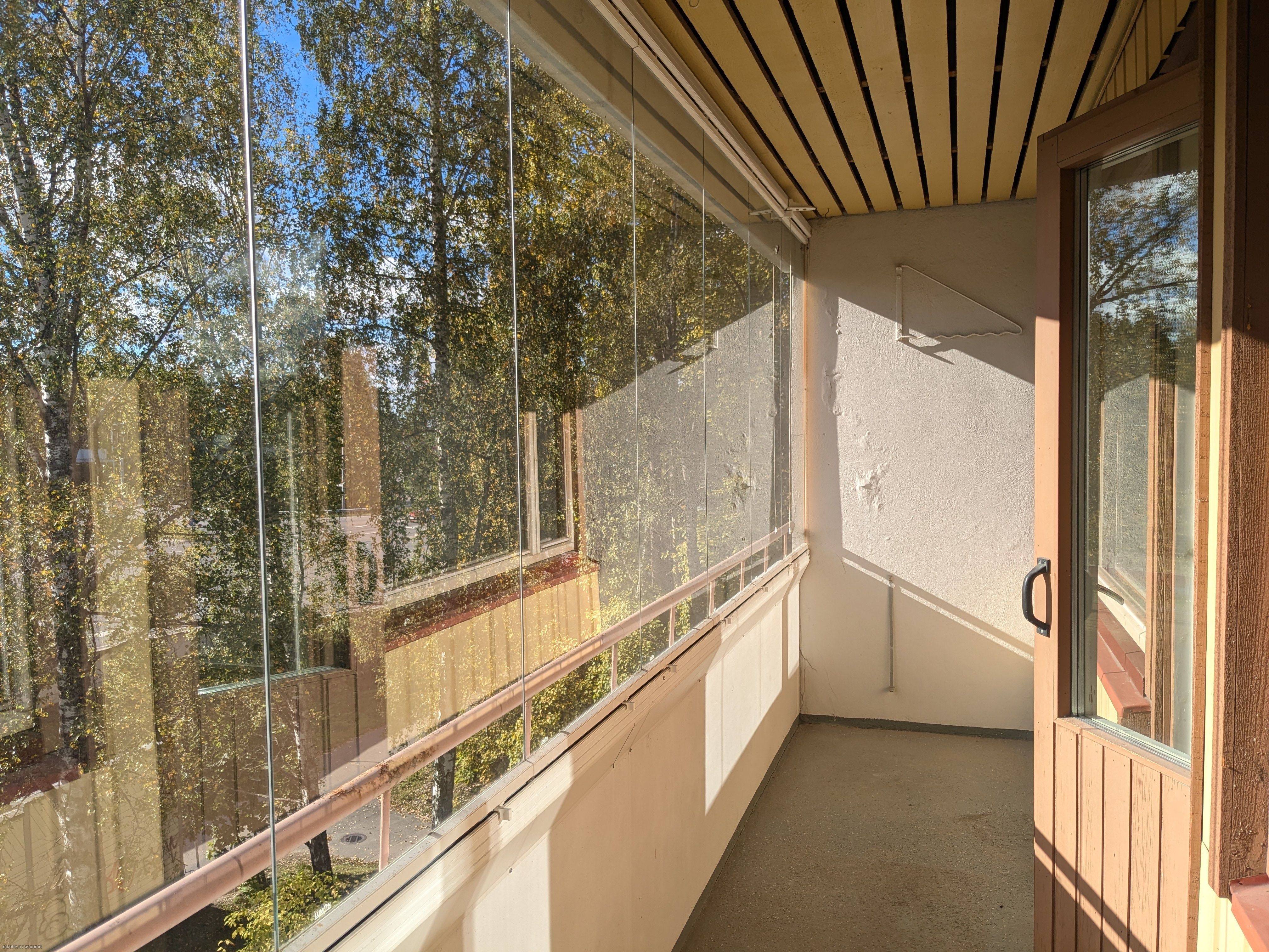 Valoisassa kodissa on kaksi erillistä makuuhuonetta ja olohuone, jonka yhteydessä on iso lasitettu parveke. Tilava eteisaula sekä vaatehuone. Laatoitettu ja lattialämmityksellinen kylpyhuone on uusittu käyttövesiputkien uusimisen yhteydessä.