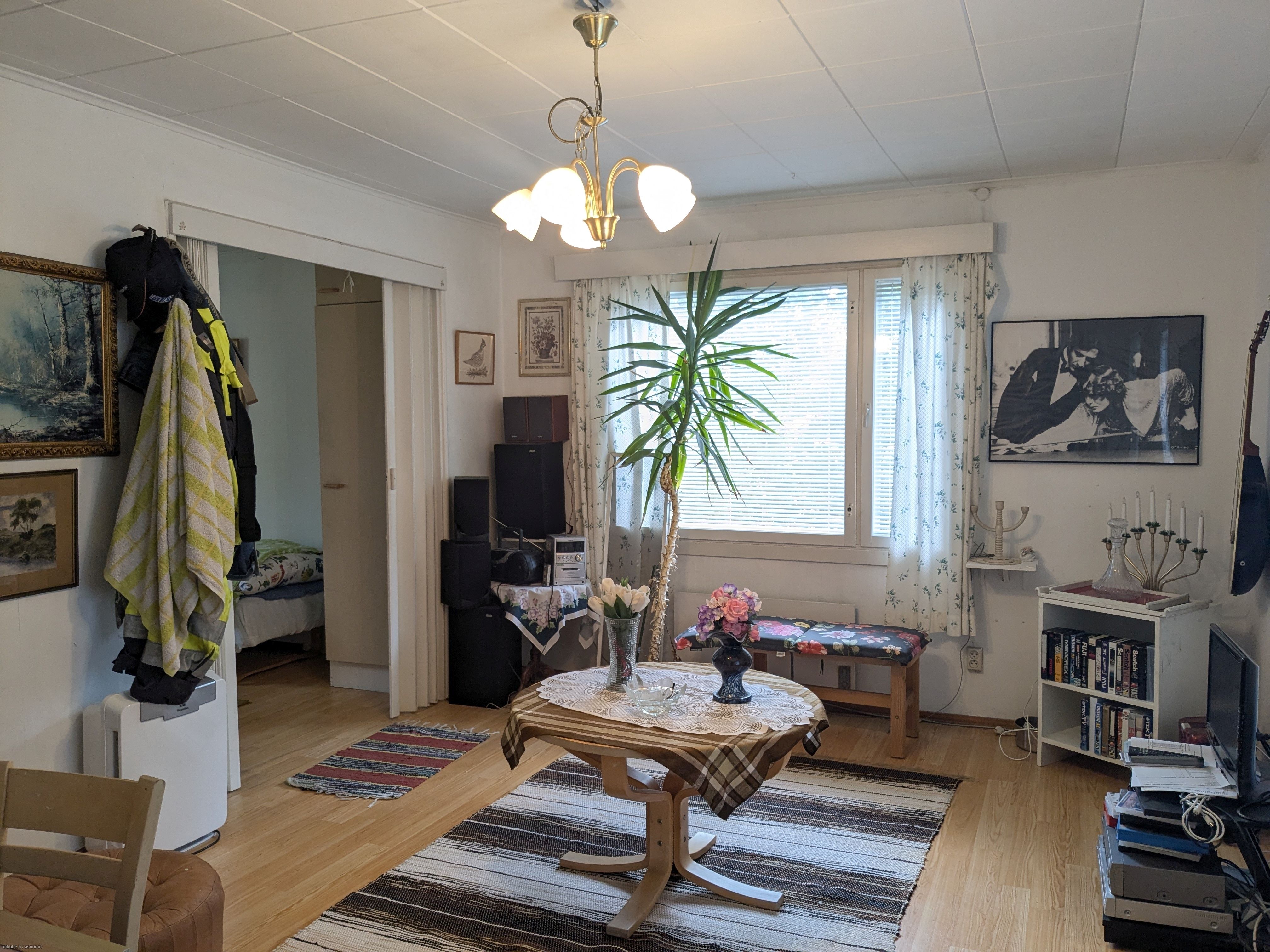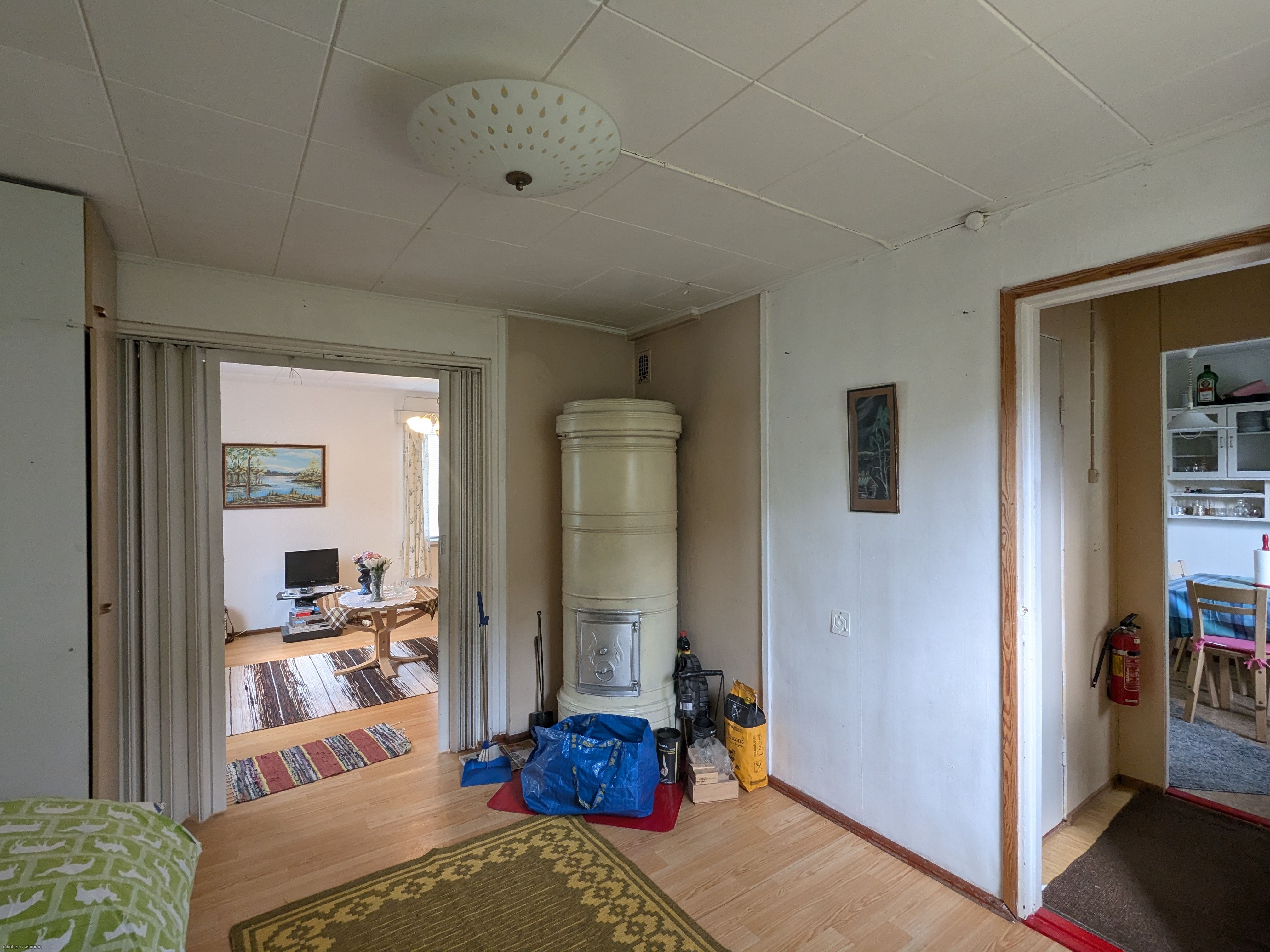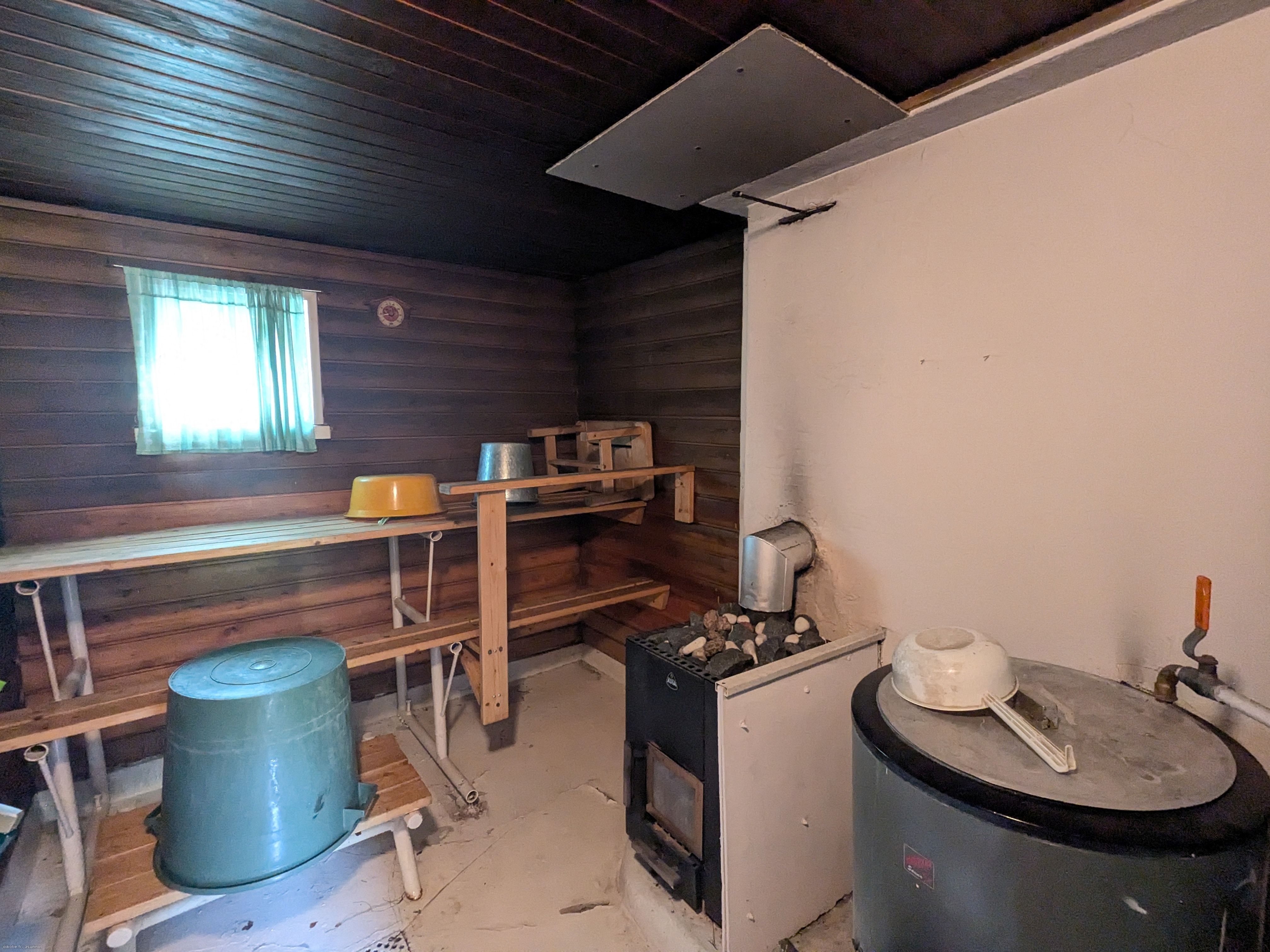 Kodissa on olohuone, kaksi asuinhuonetta, joista toinen toimii tällä hetkellä ruokailutilana keittiön yhteydessä. Molemmissa huoneissa on pystyuunit sekä keittiössä puuhella! Lisäksi on WC-tila, pienempi asuinhuone sekä varastotilaa. Katetun kuistin läpi kulku saunatiloihin, jossa on vesipata sekä puukiuas. Saunaa edeltää pukuhuone ja ulkovarasto, joka toimii askartelu/verstastilana. Yksitasoisen asuinrakennuksen kate on uusittu v.2022.