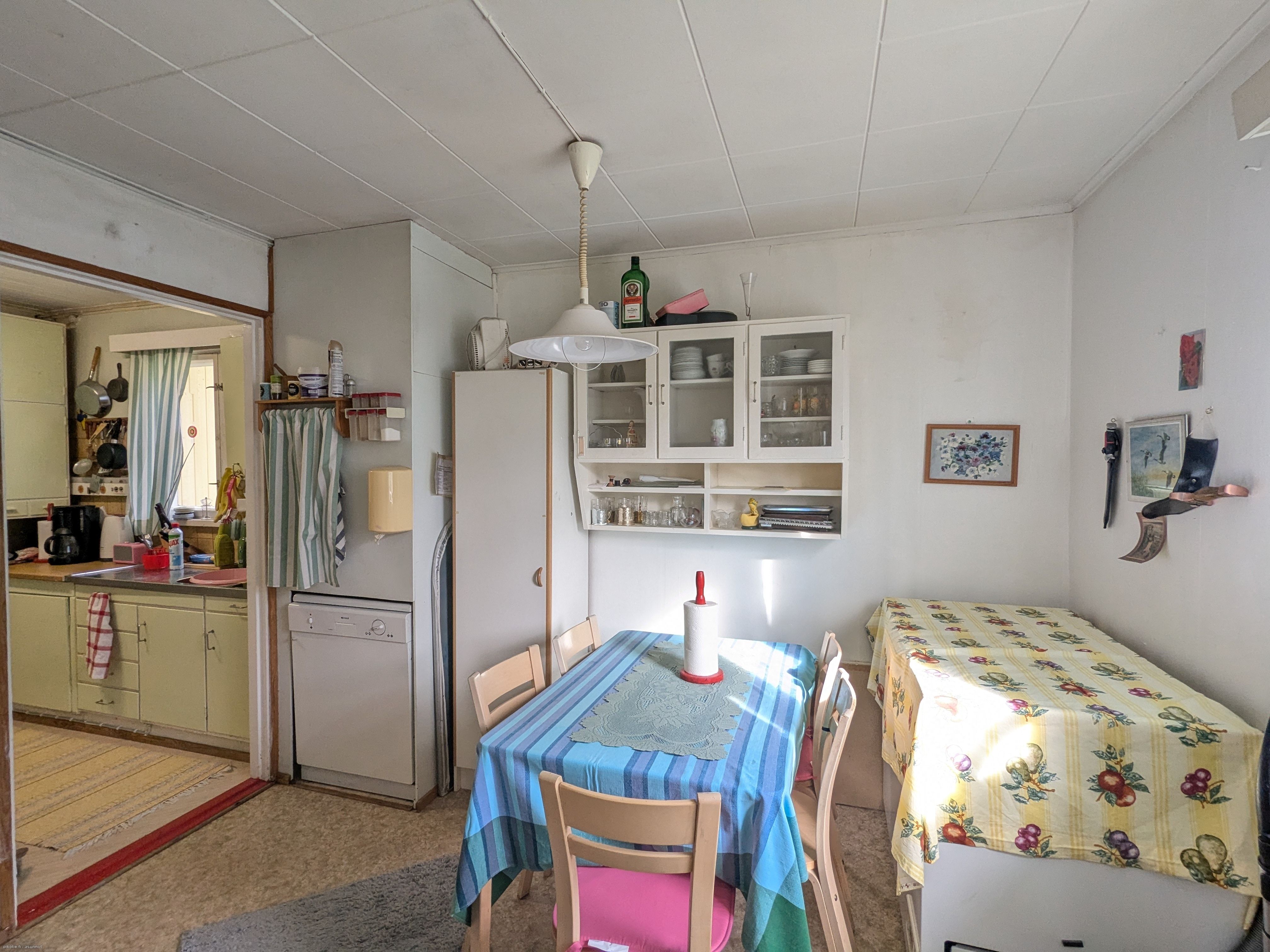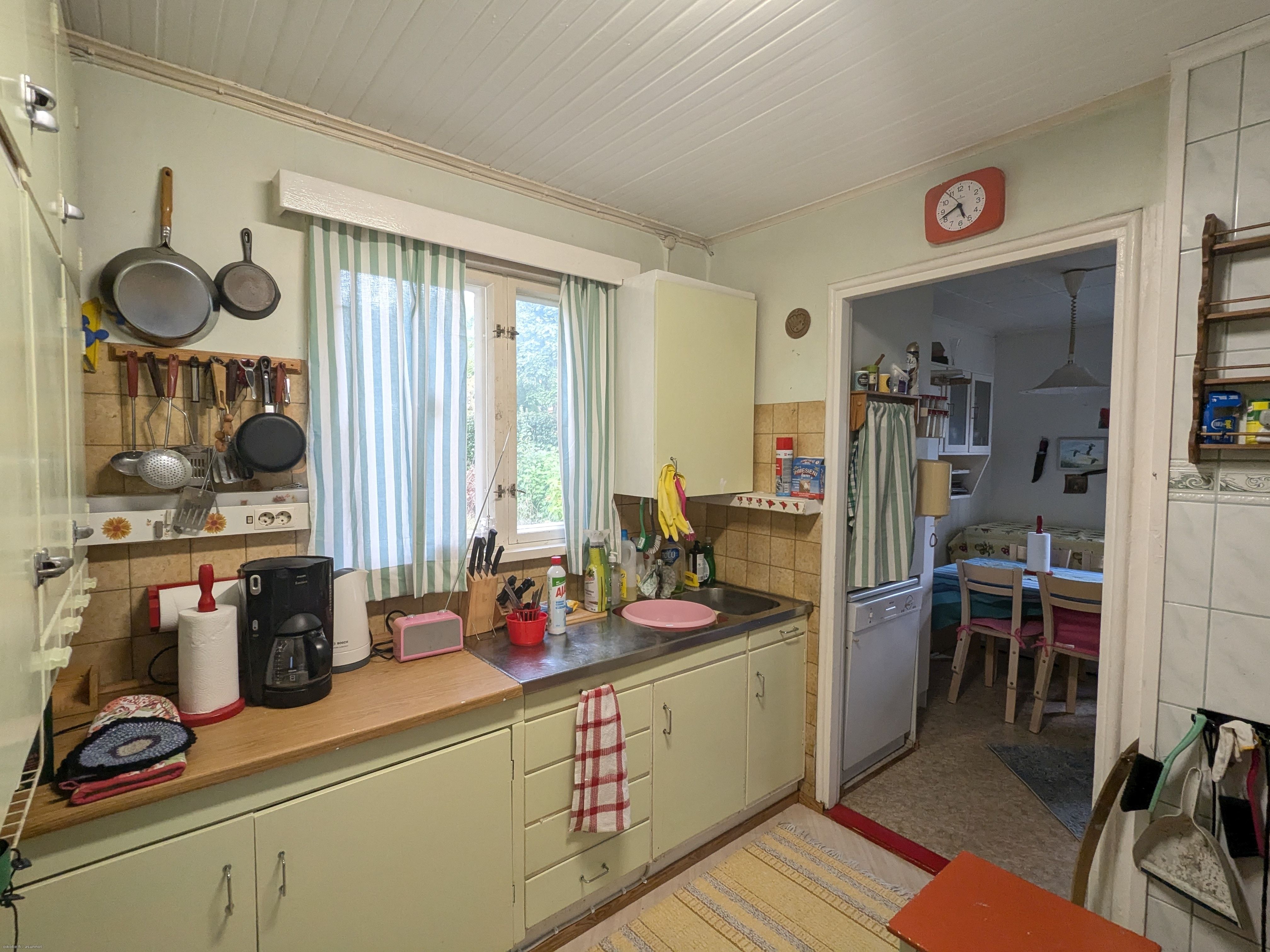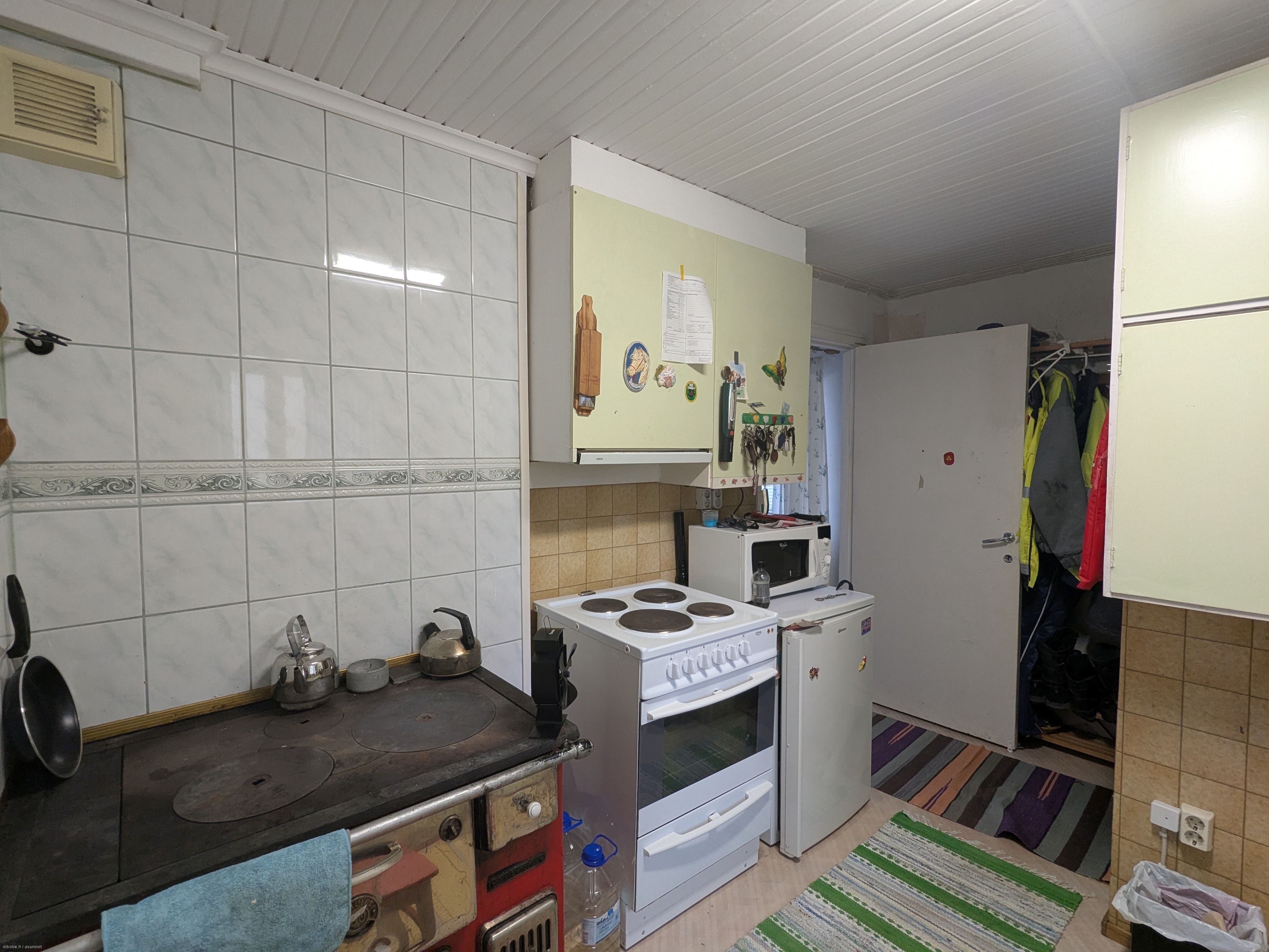 Varusteet: Jääkaappi, Astianpesukoneliitäntä. Liesi: Sähköliesi, Puuhella, Mikroaaltouuni. Keittiön viereinen huone toiminut ruokailutilana, jossa pystyuuni, astianpesukone sekä lämminvesivaraaja.