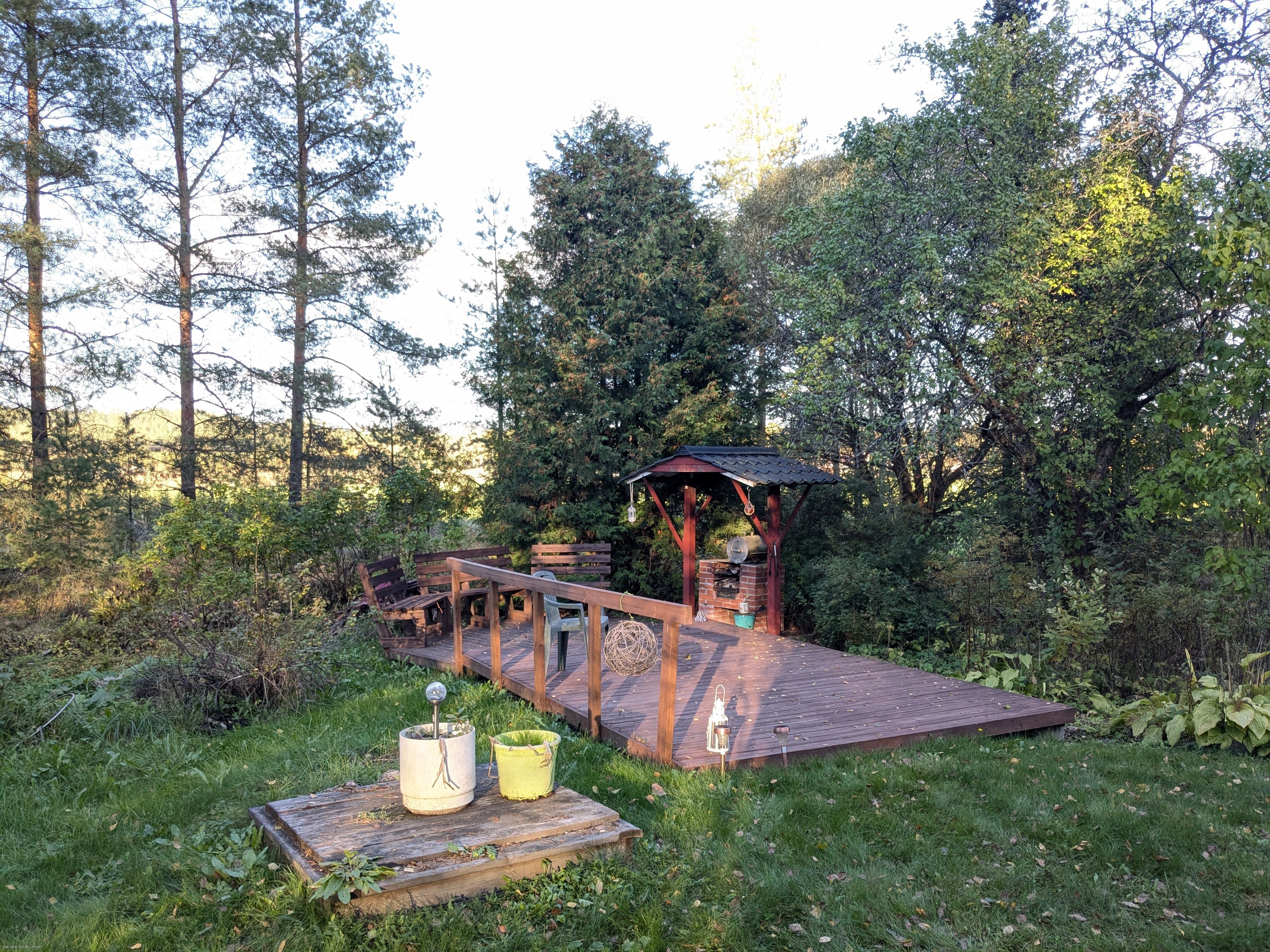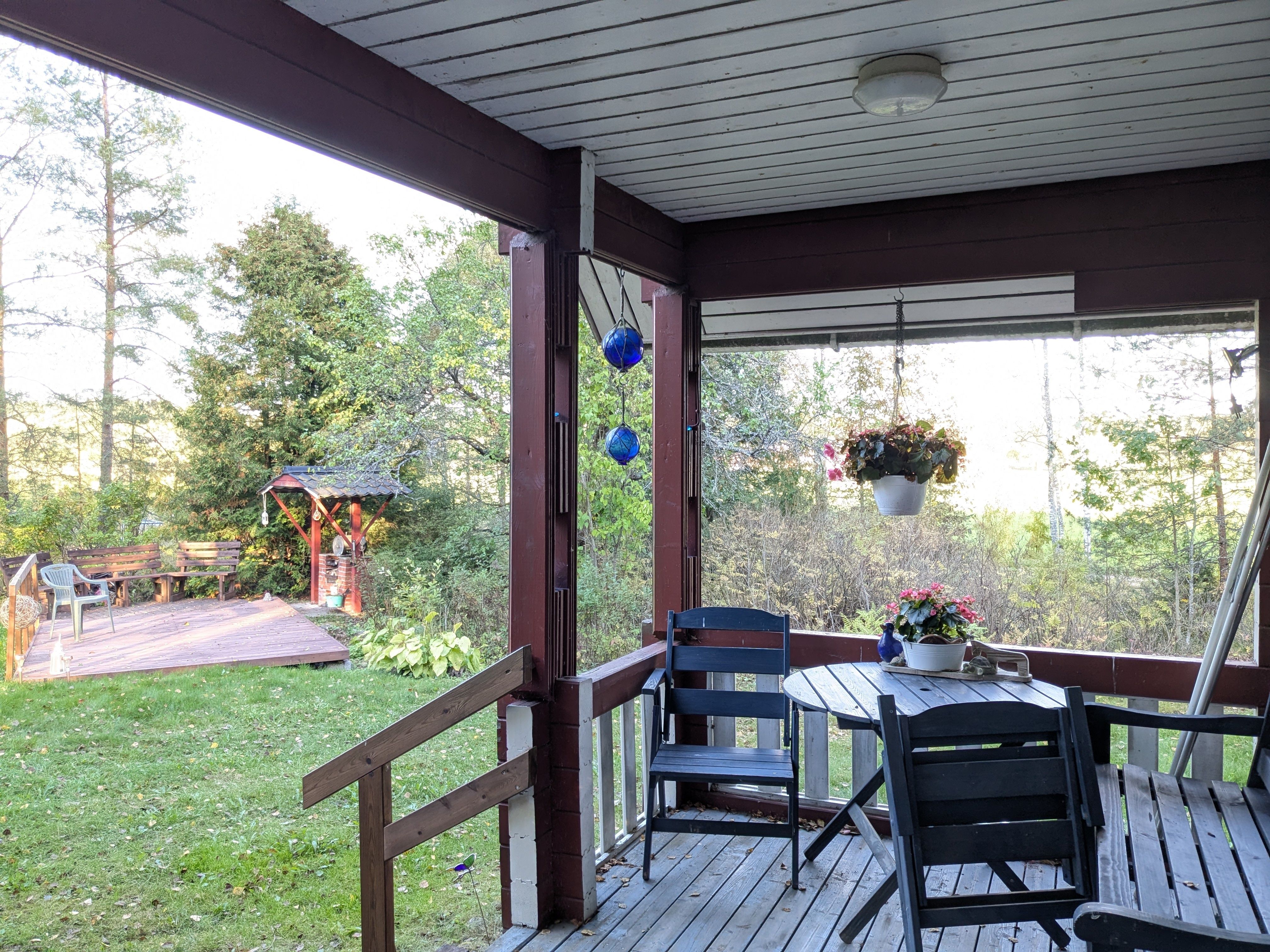 Päärakennuksen yhteydessä katettu terassi/kuisti, jonka lisäksi on terassialue. Pihassa monipuolista kasvillisuutta ja tilaa mm. isomallekin kasvimaalle.