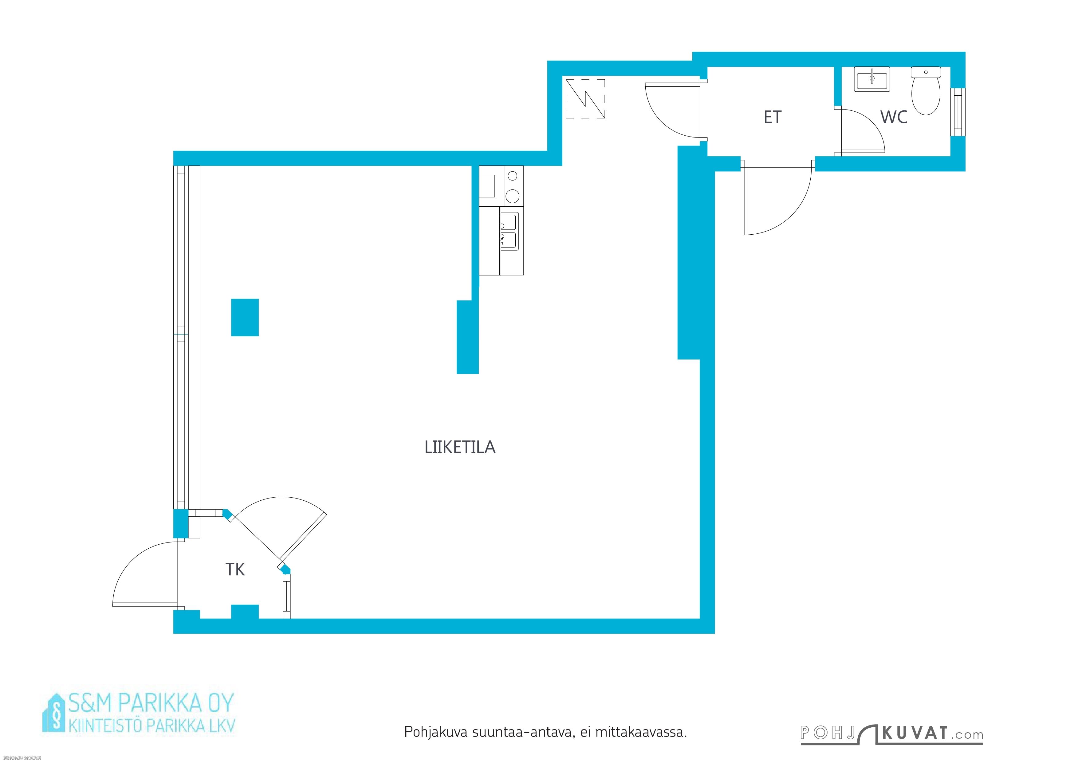 Yhdessä tasossa oleva esteetön katutason liiketila, joka soveltuu mm. pienmyymälä, toimisto, kampaamo ym. käyttöön. Tilassa on ilmalämpöpumppu.