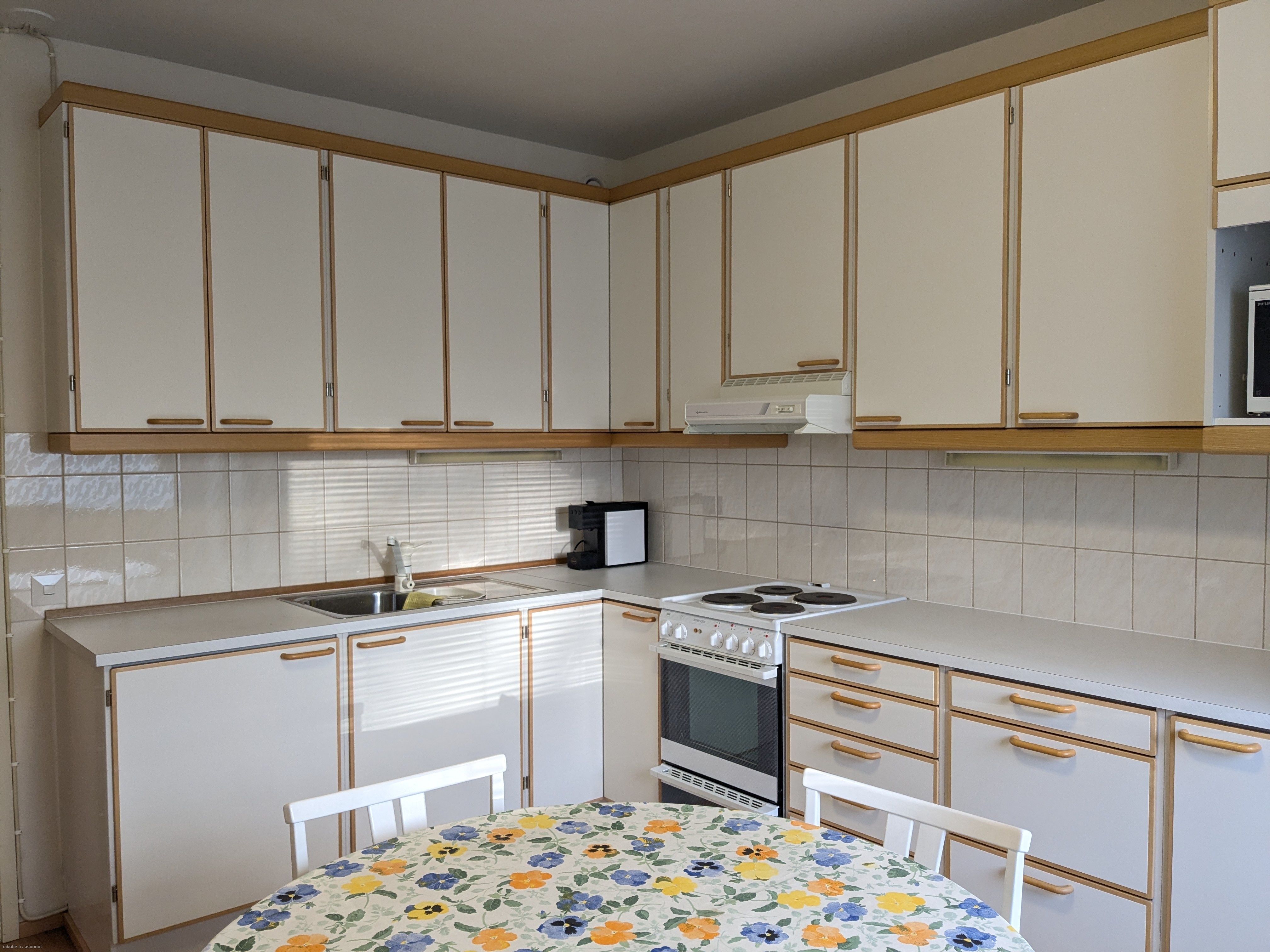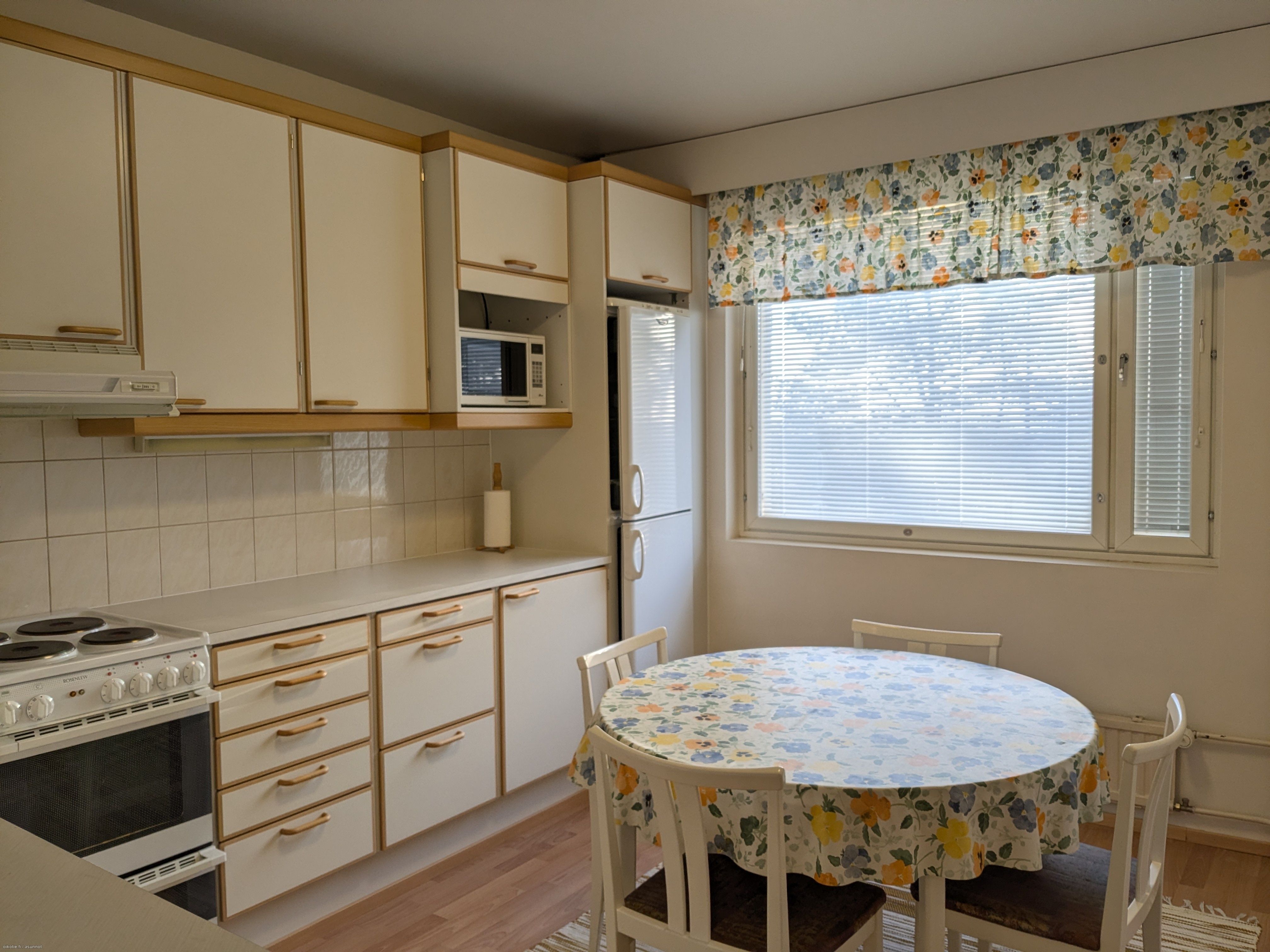 Varusteet: astianpesukoneliitäntä, astianpesukone, jääkaappipakastin. Liesi: sähköliesi