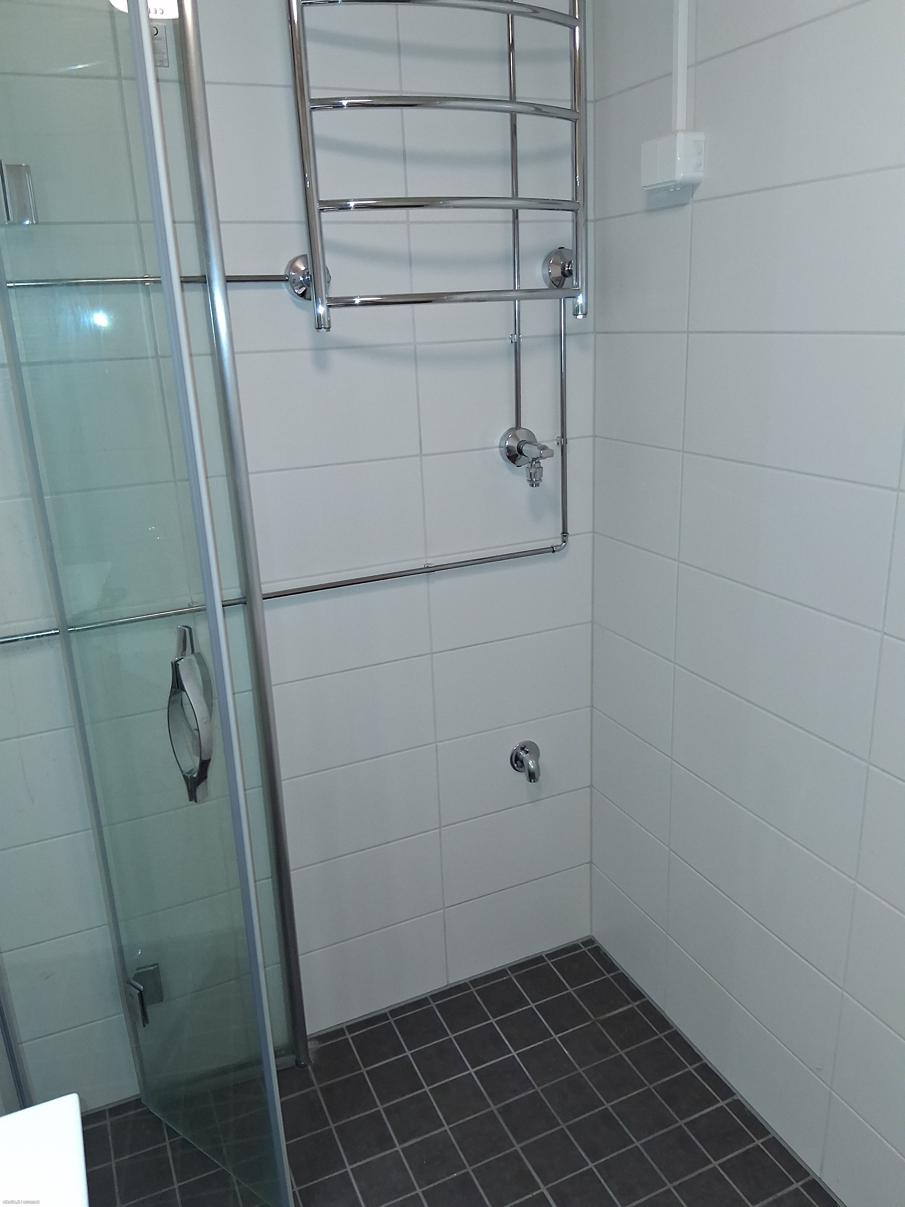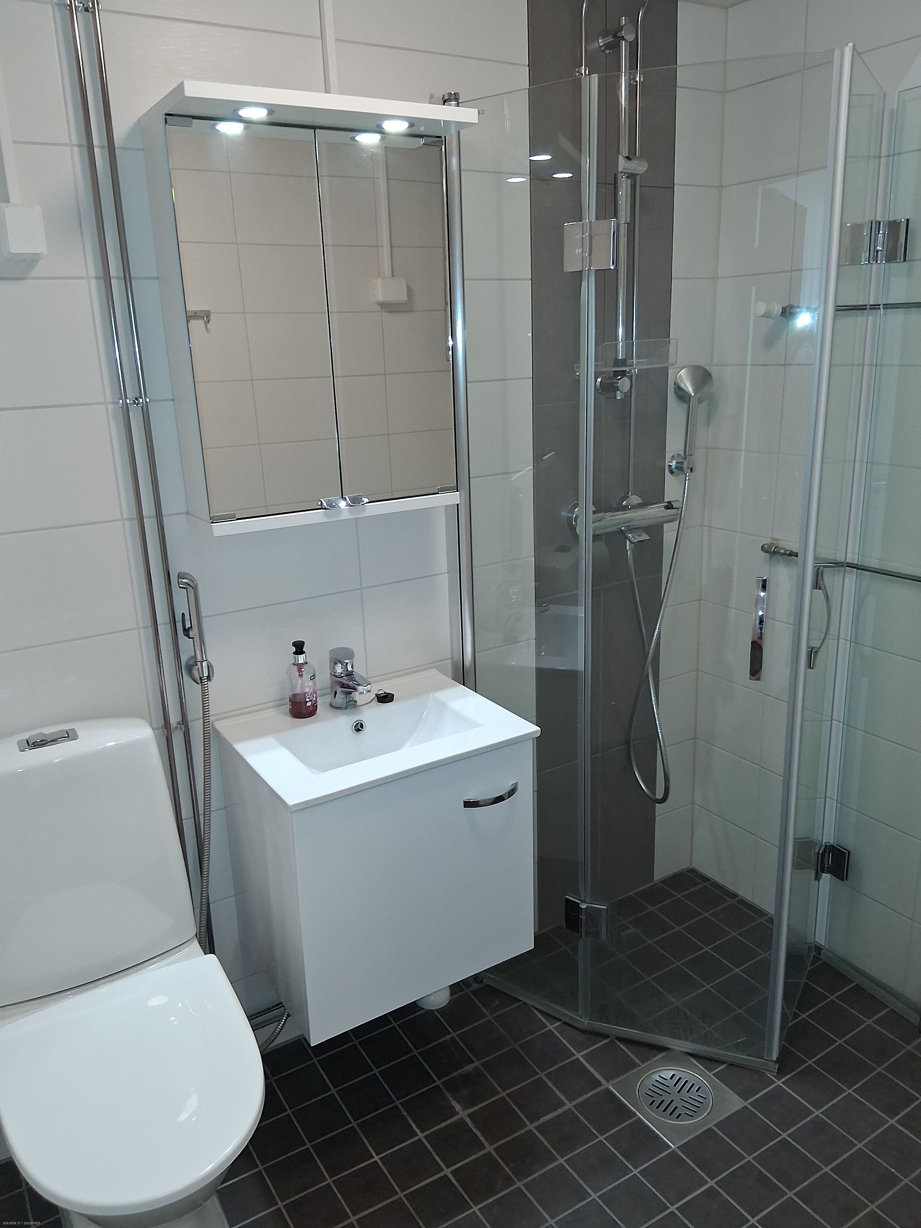 Varusteet: WC, suihku, pesukoneliitäntä, suihkuseinä, peilikaappi, allaskaappi