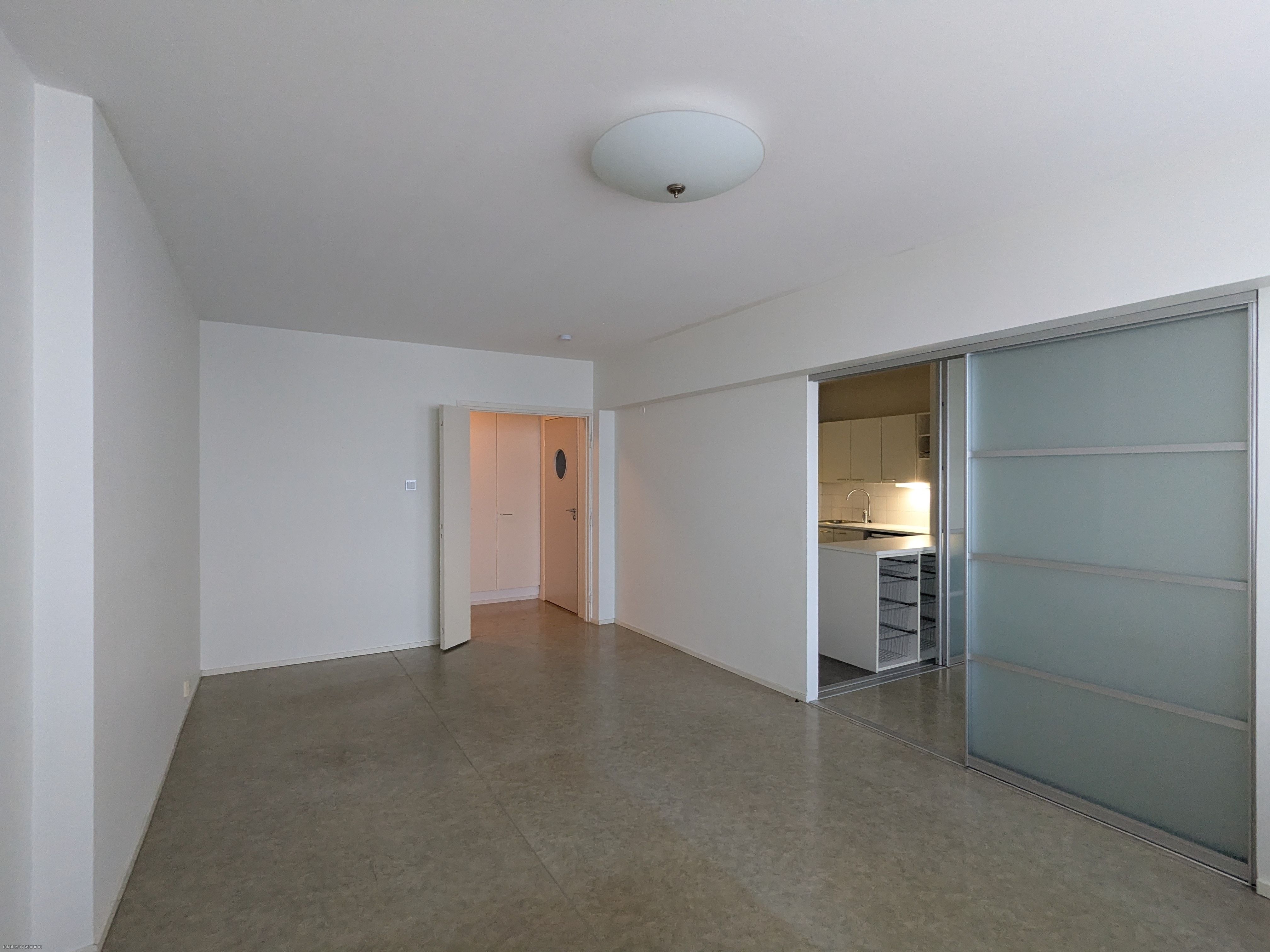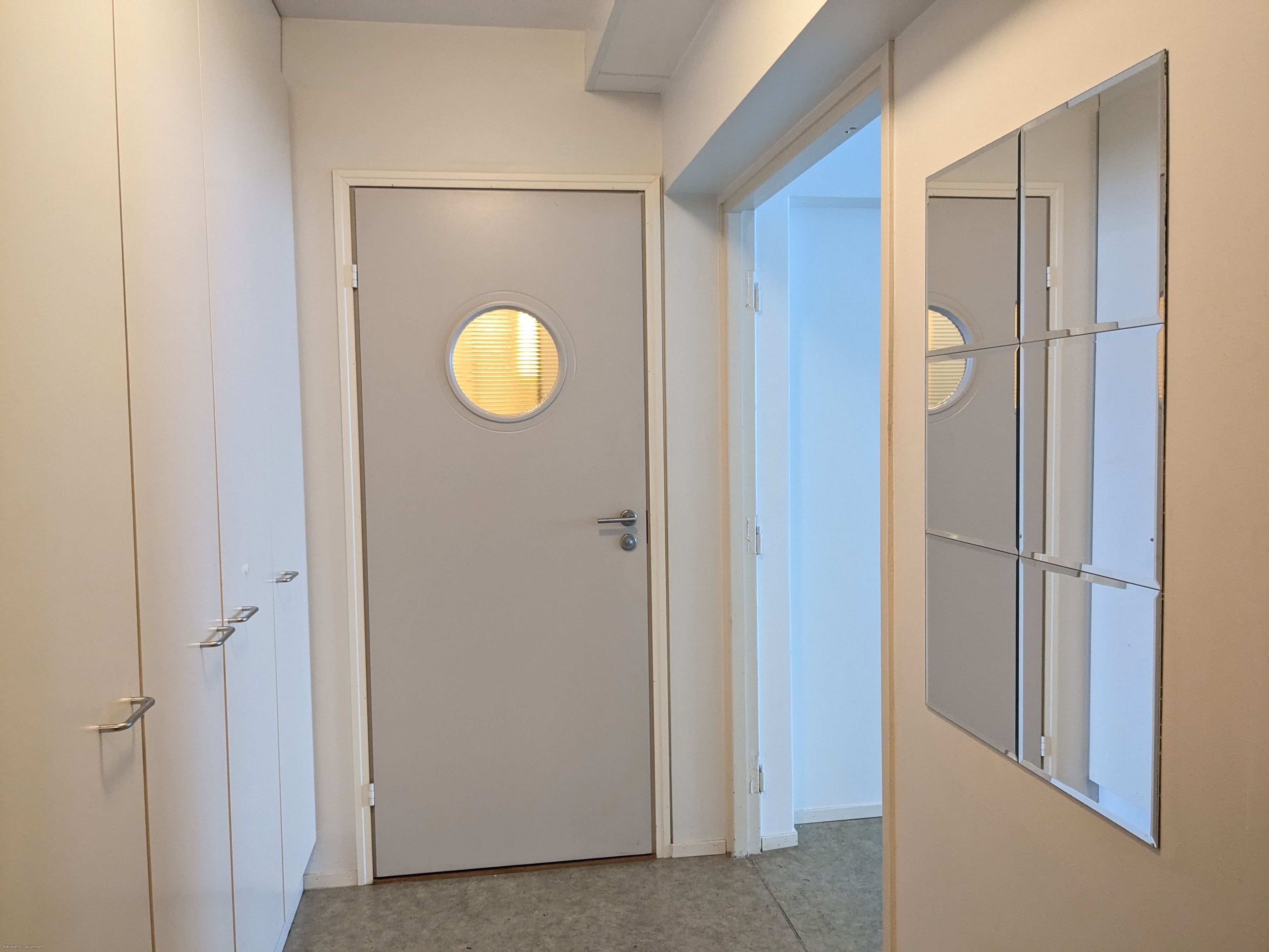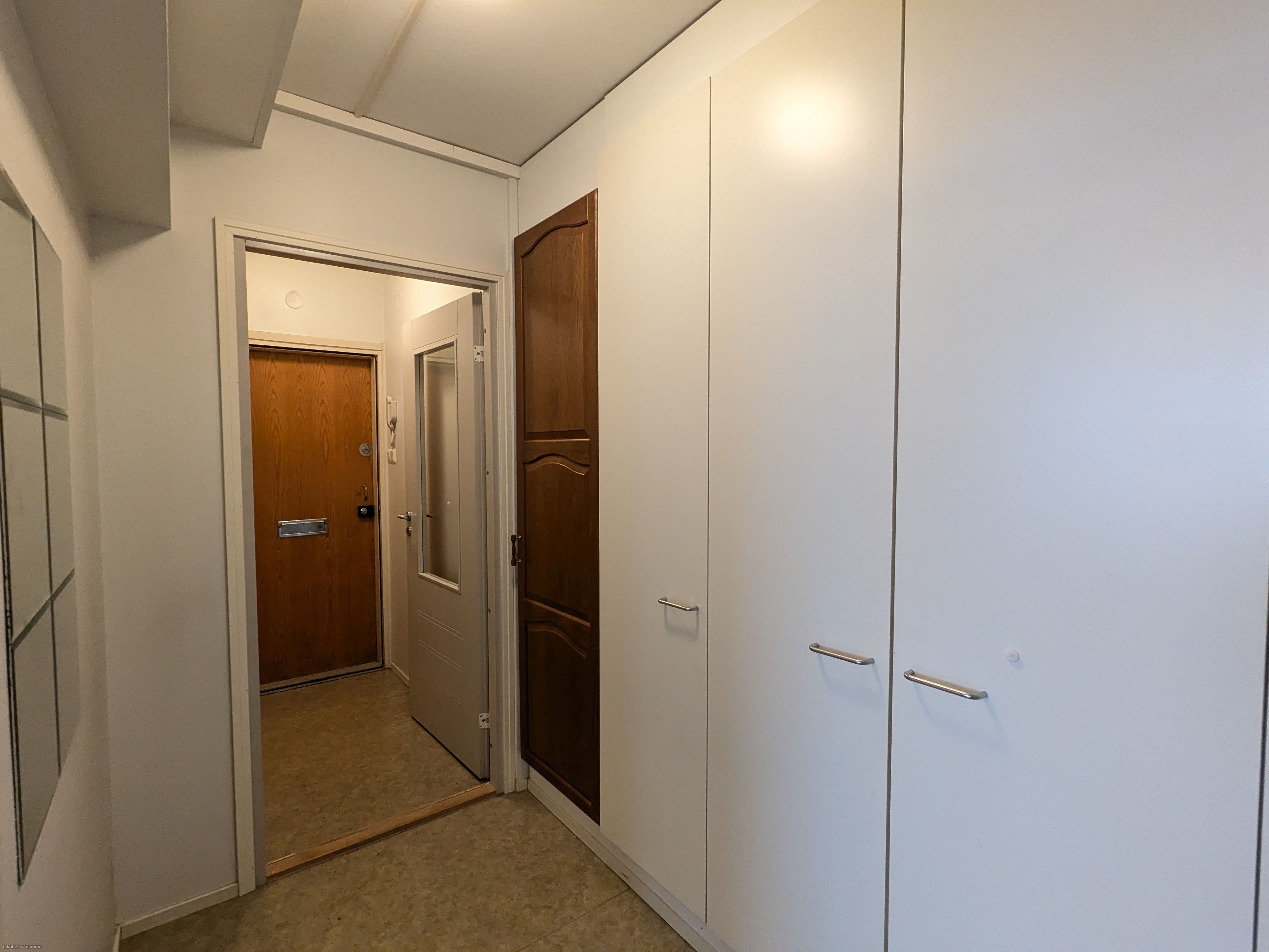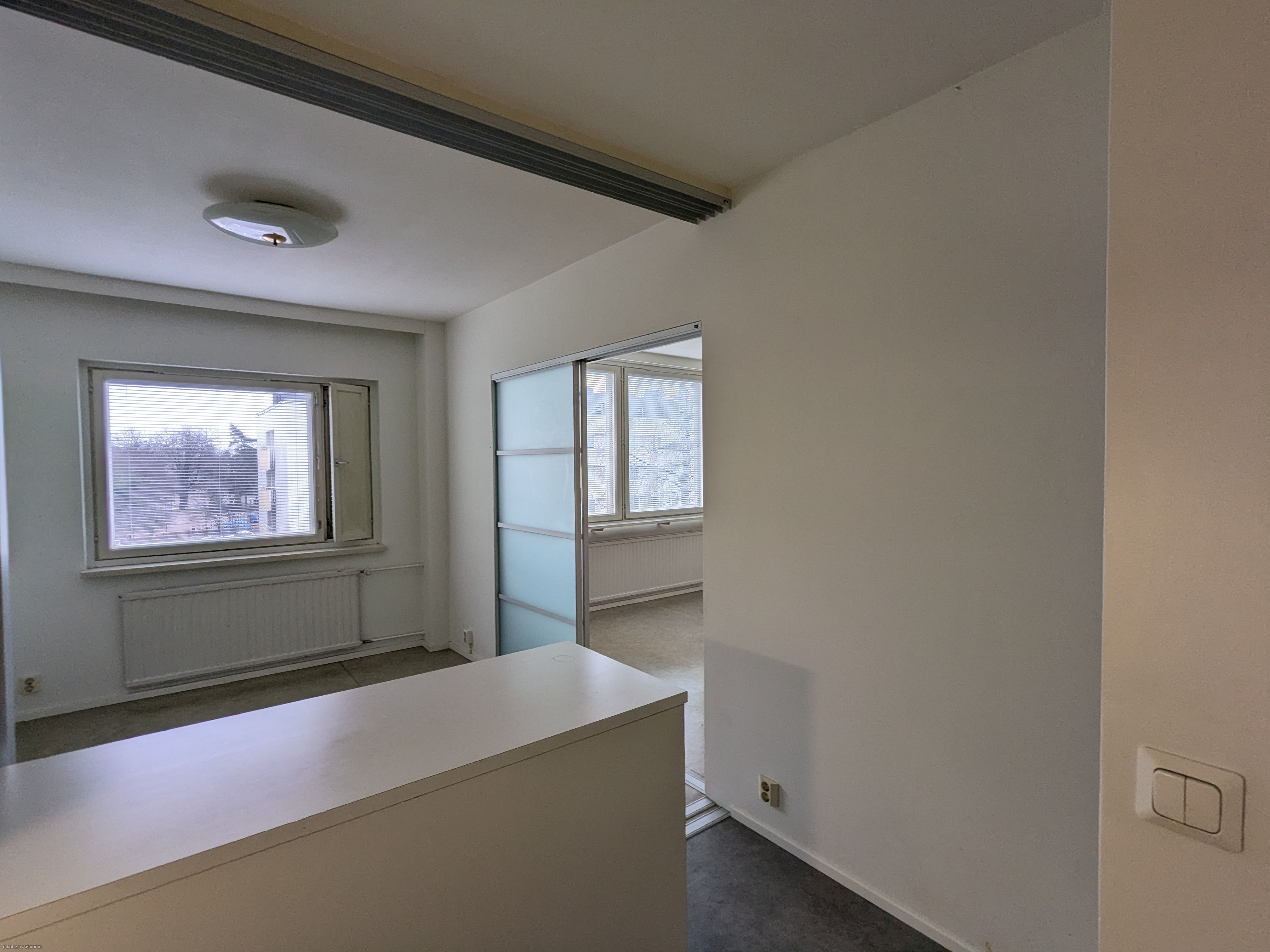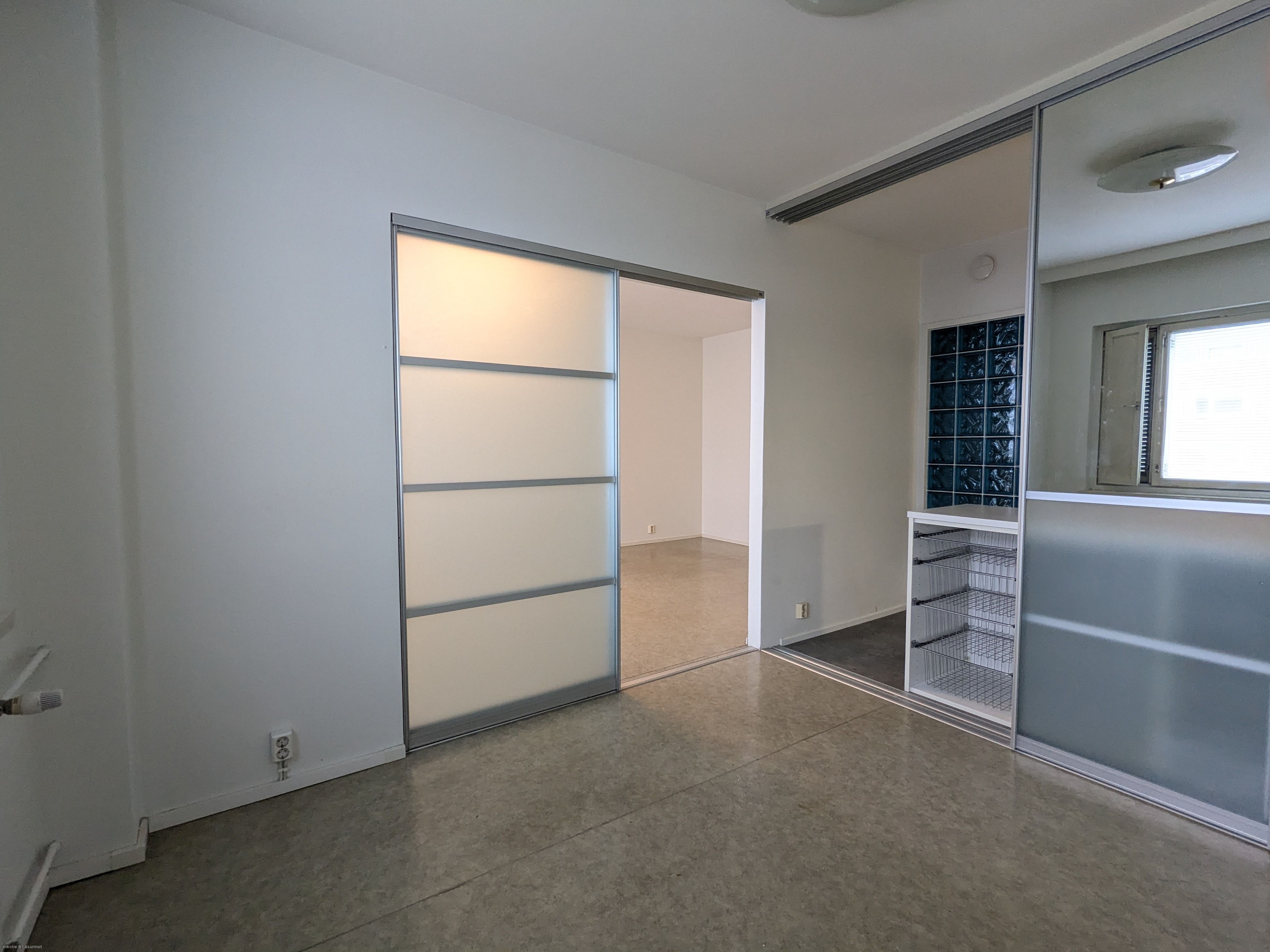 Kolmannen kerroksen asunnossa on kaksi asuinhuonetta ja keittiötila. Tilojen välillä liukuovet. Ikkunat rauhallisen sisäpihan/keskuspuiston suuntaan. Laatoitettu kylpyhuone, jossa on pesukonevalmius. Eteisessä runsaasti kaappitilaa.