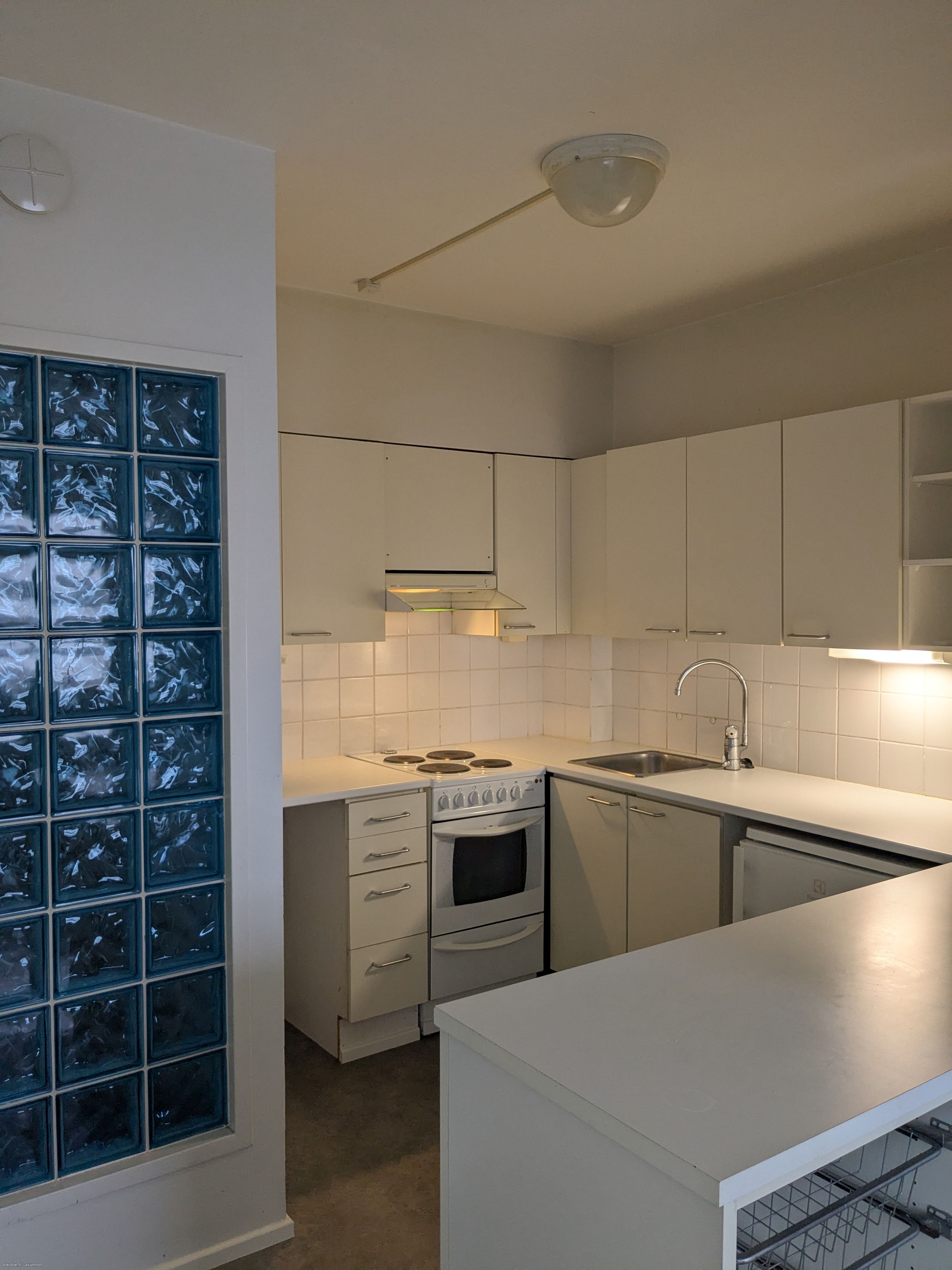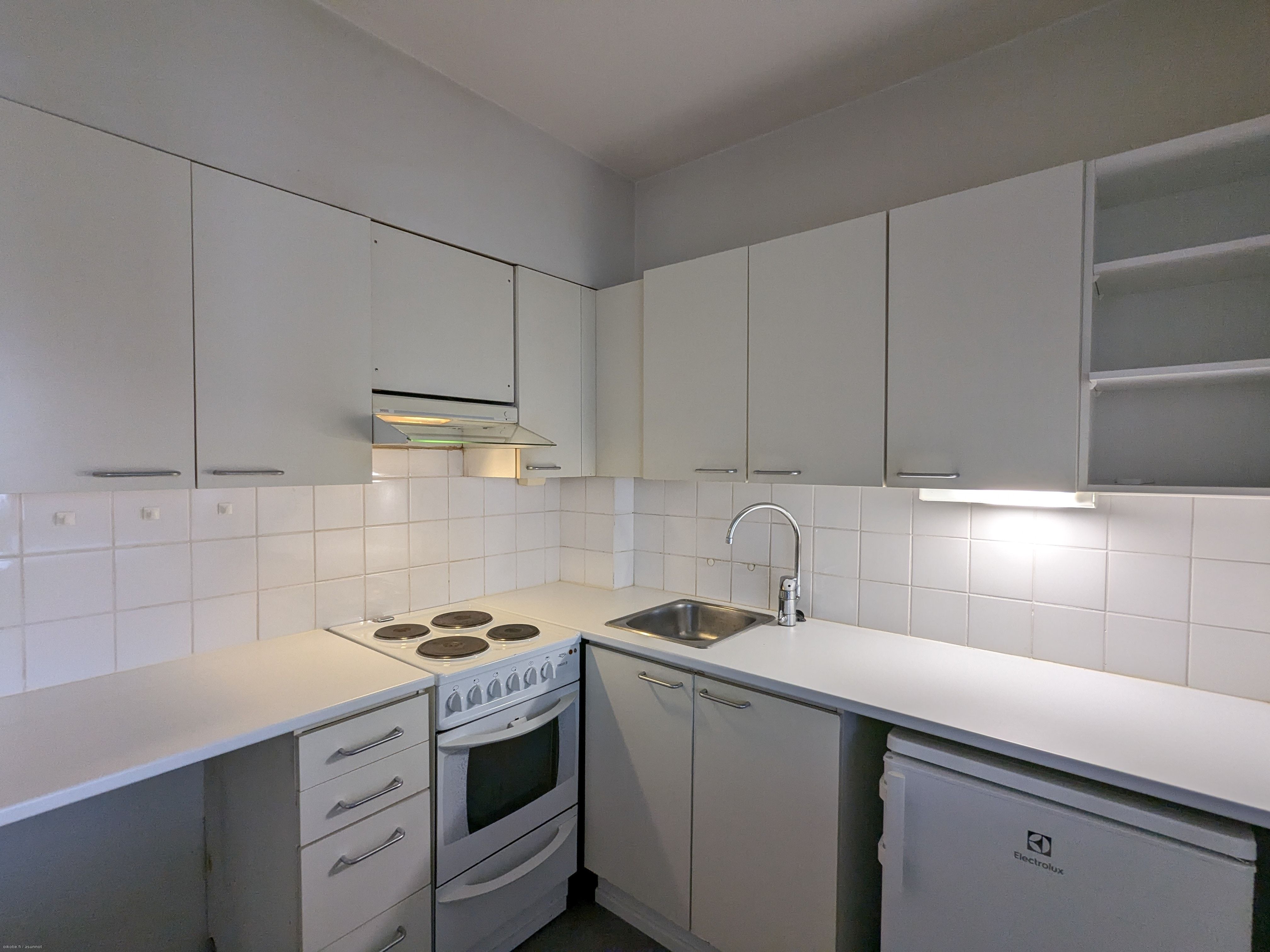 Varusteet: jääkaappi, astianpesukoneliitäntä. Liesi: sähköliesi, liesituuletin hormilla