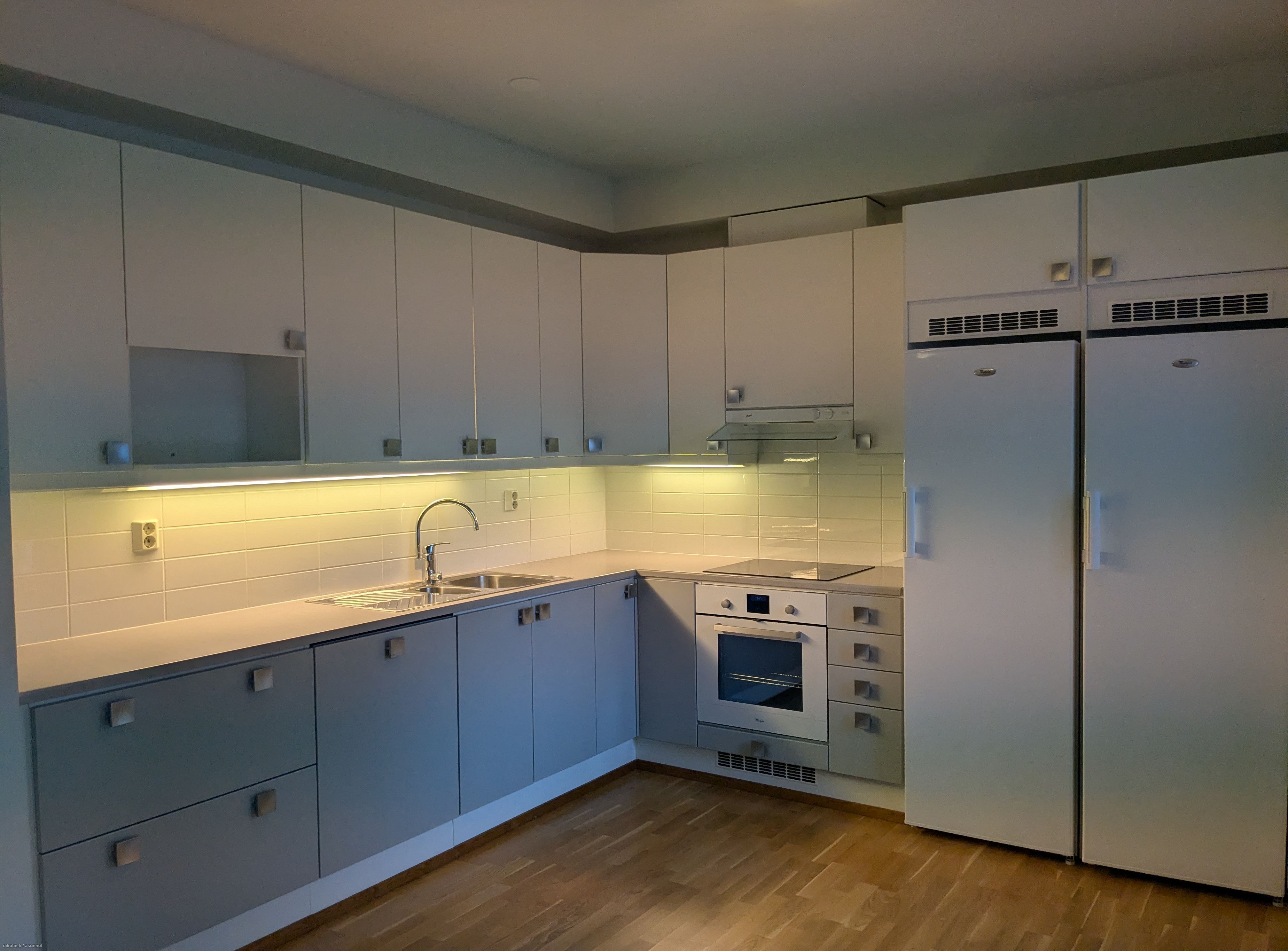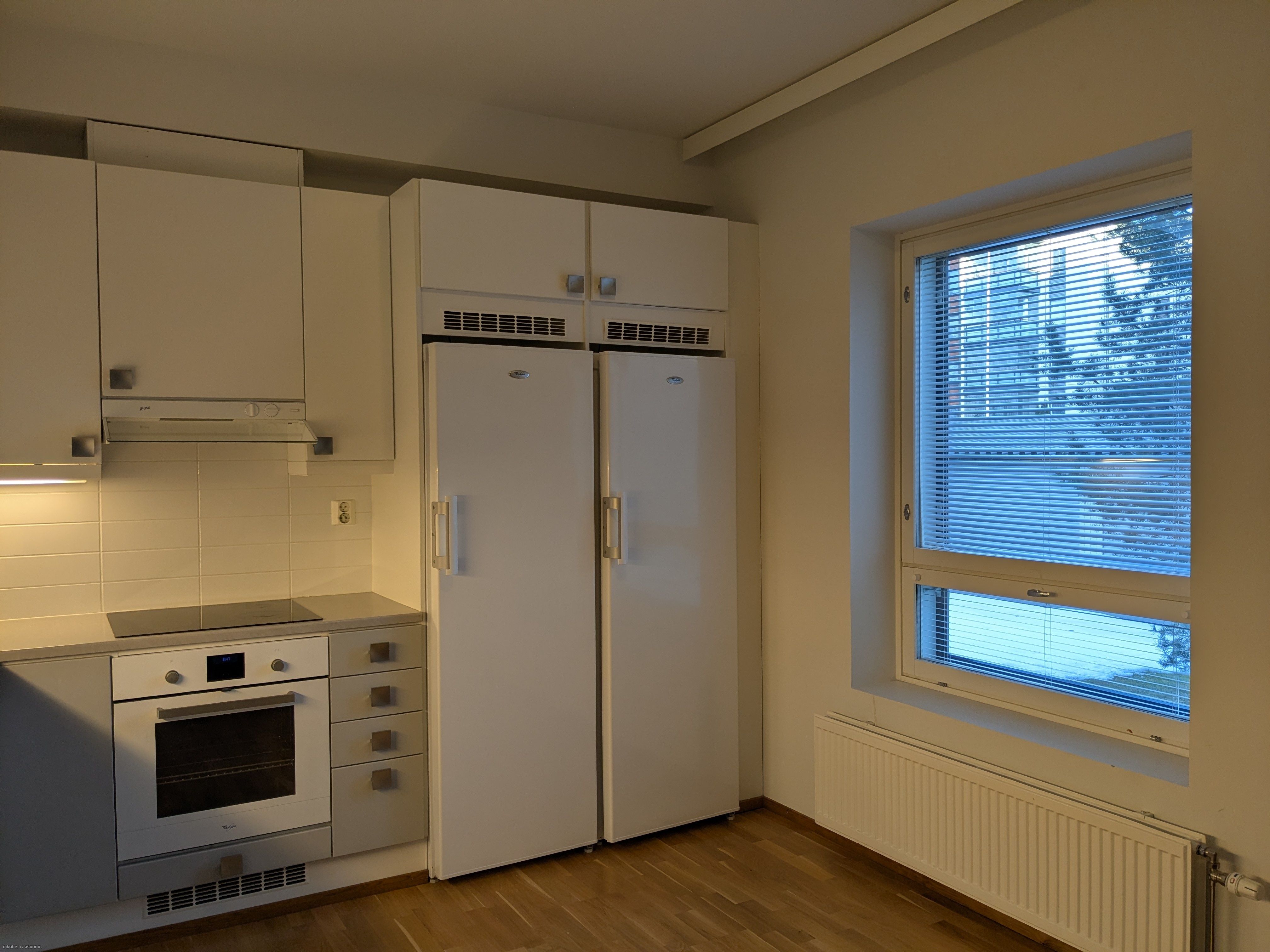 Varusteet: jääkaappi, pakastin, integroitu astianpesukone. Liesi: sähköliesi