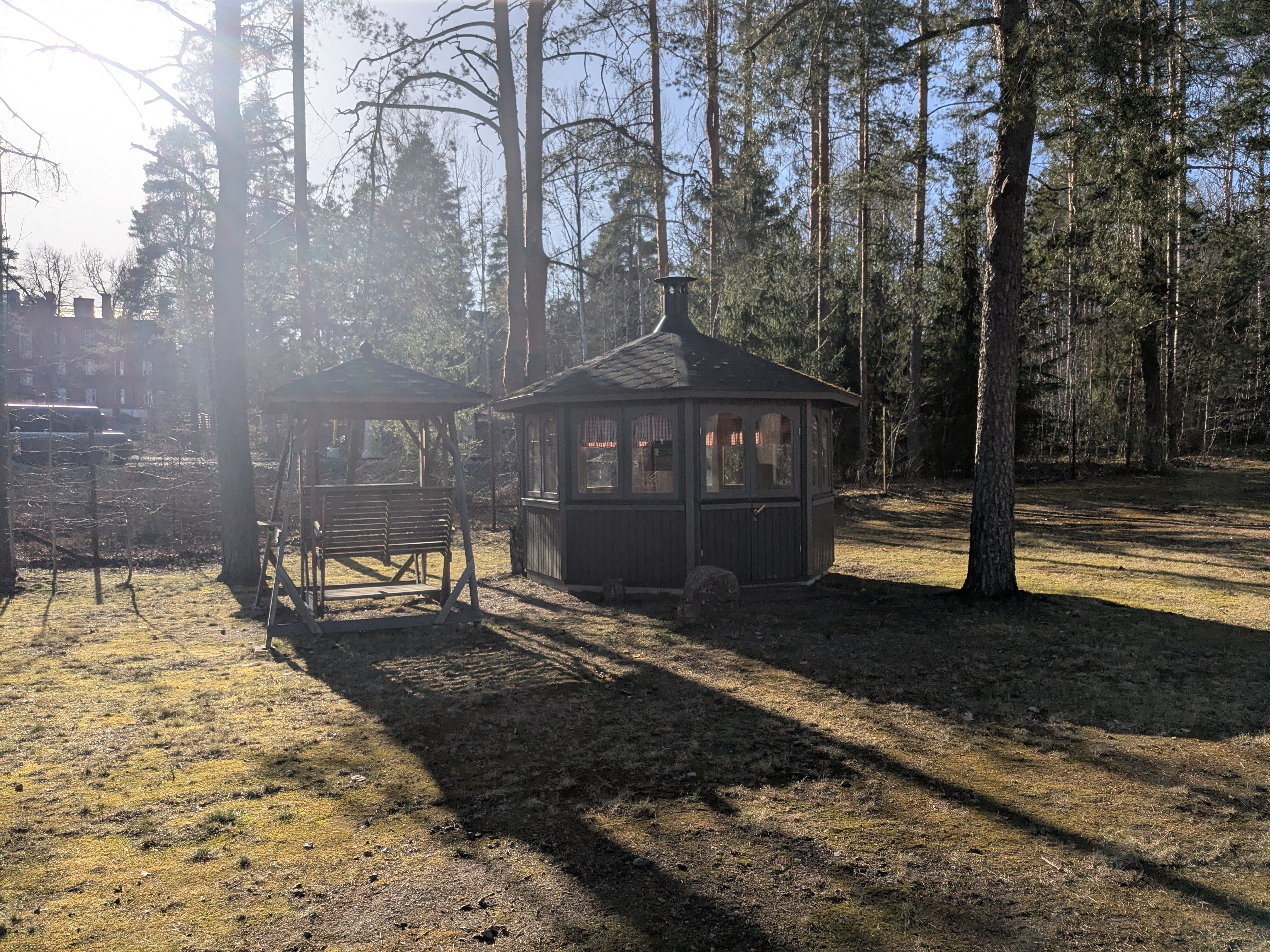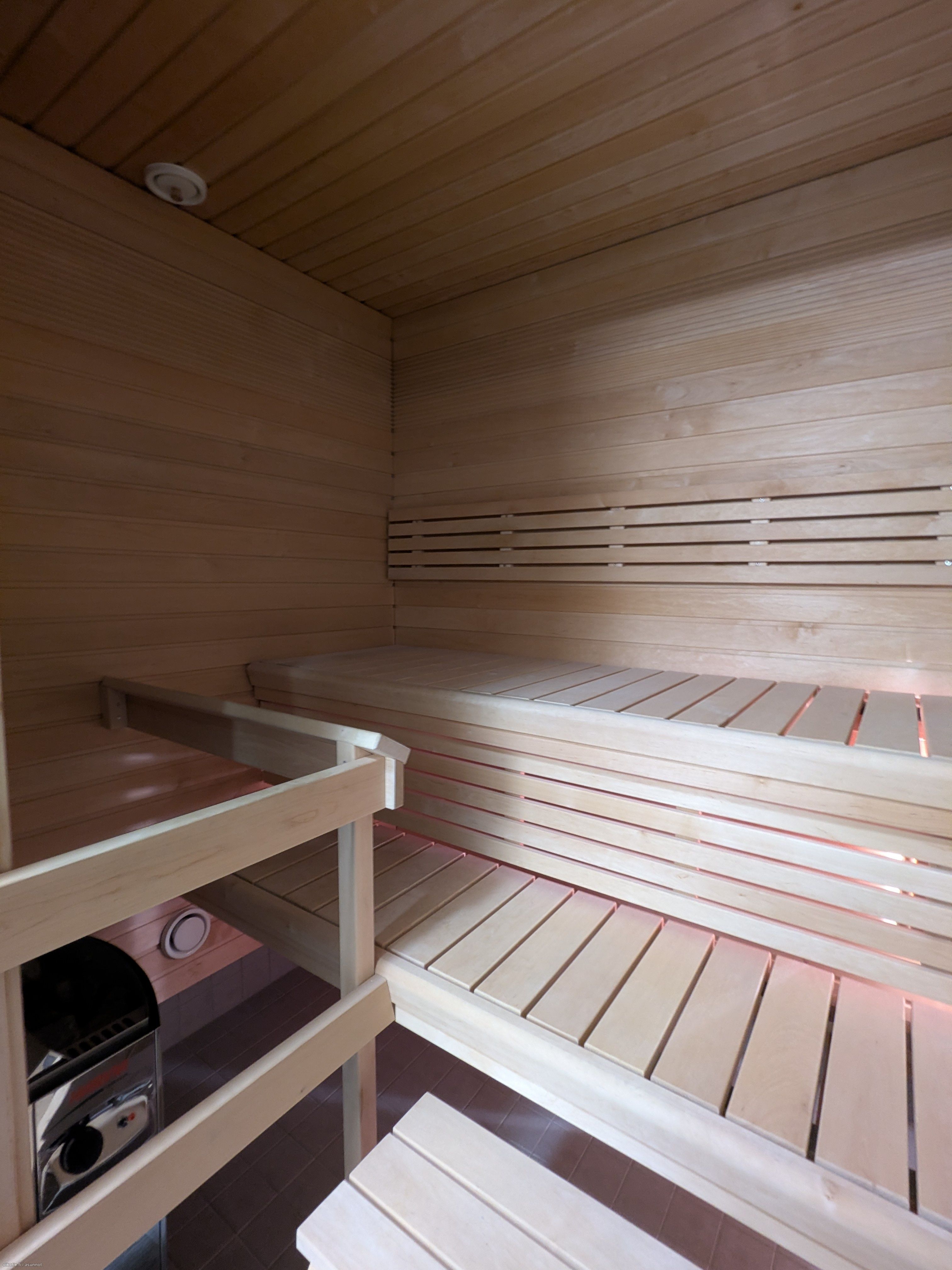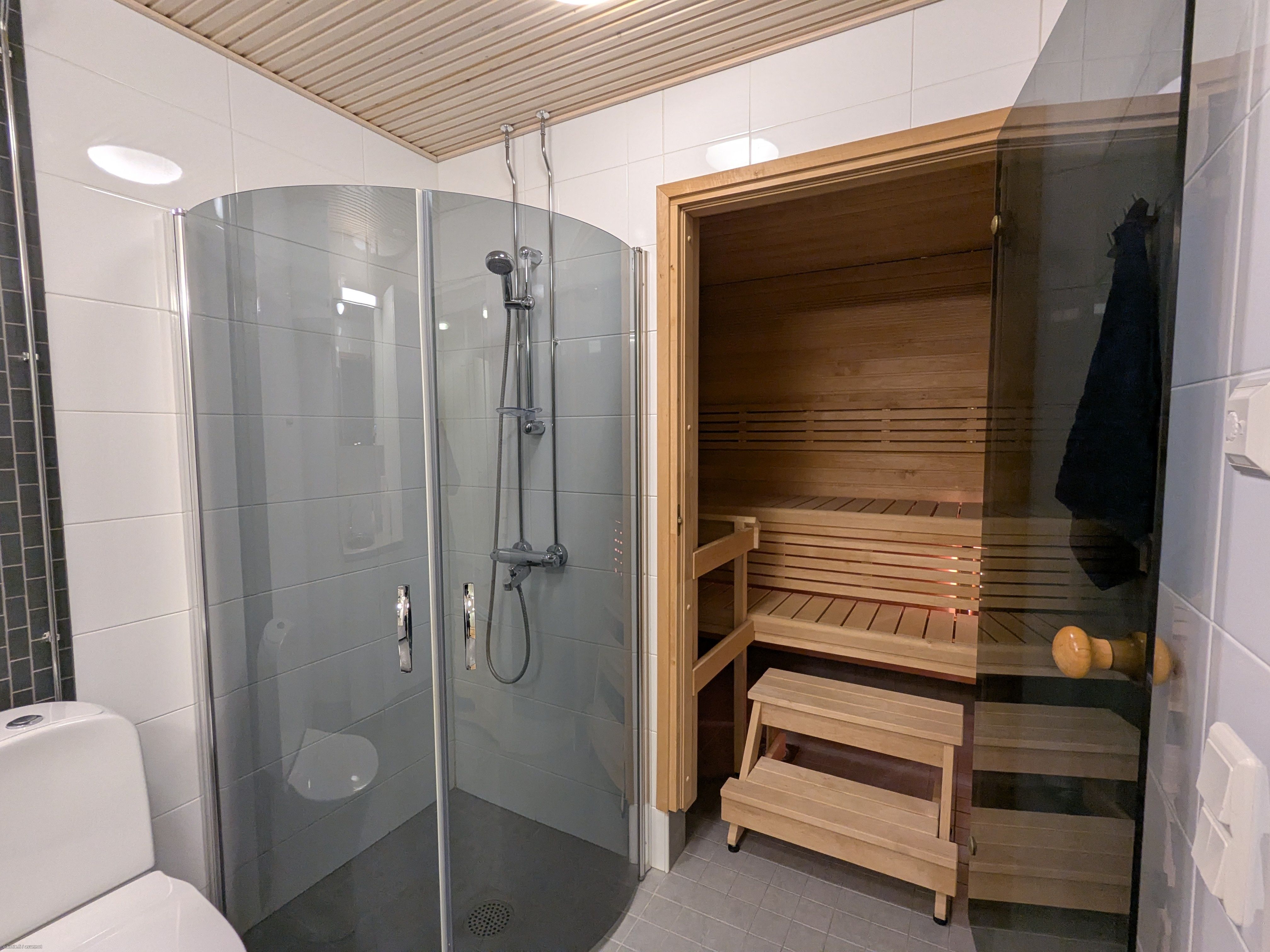 Varusteet: sähkökiuas, lattiakaivo. Lattiamateriaali: laattalattia