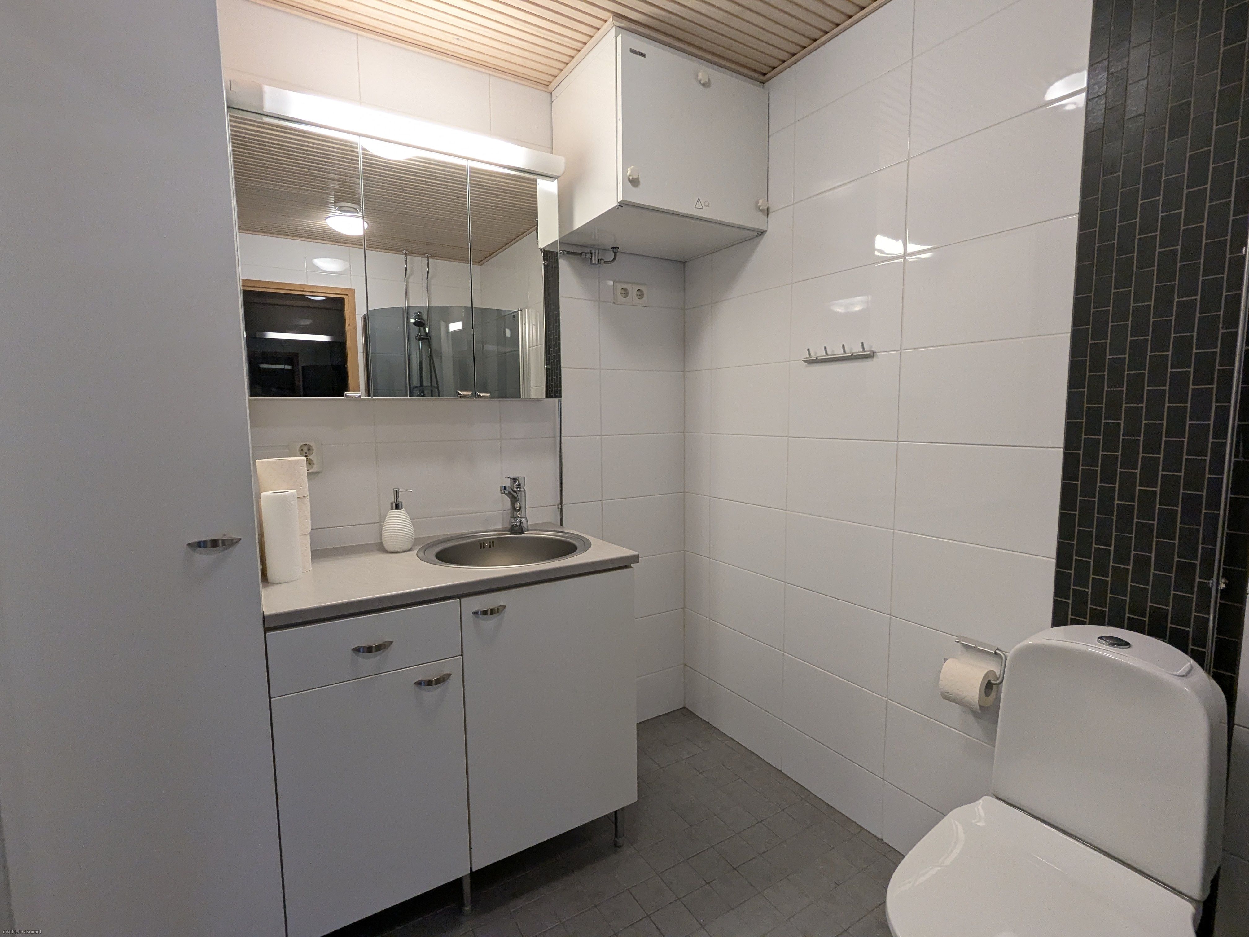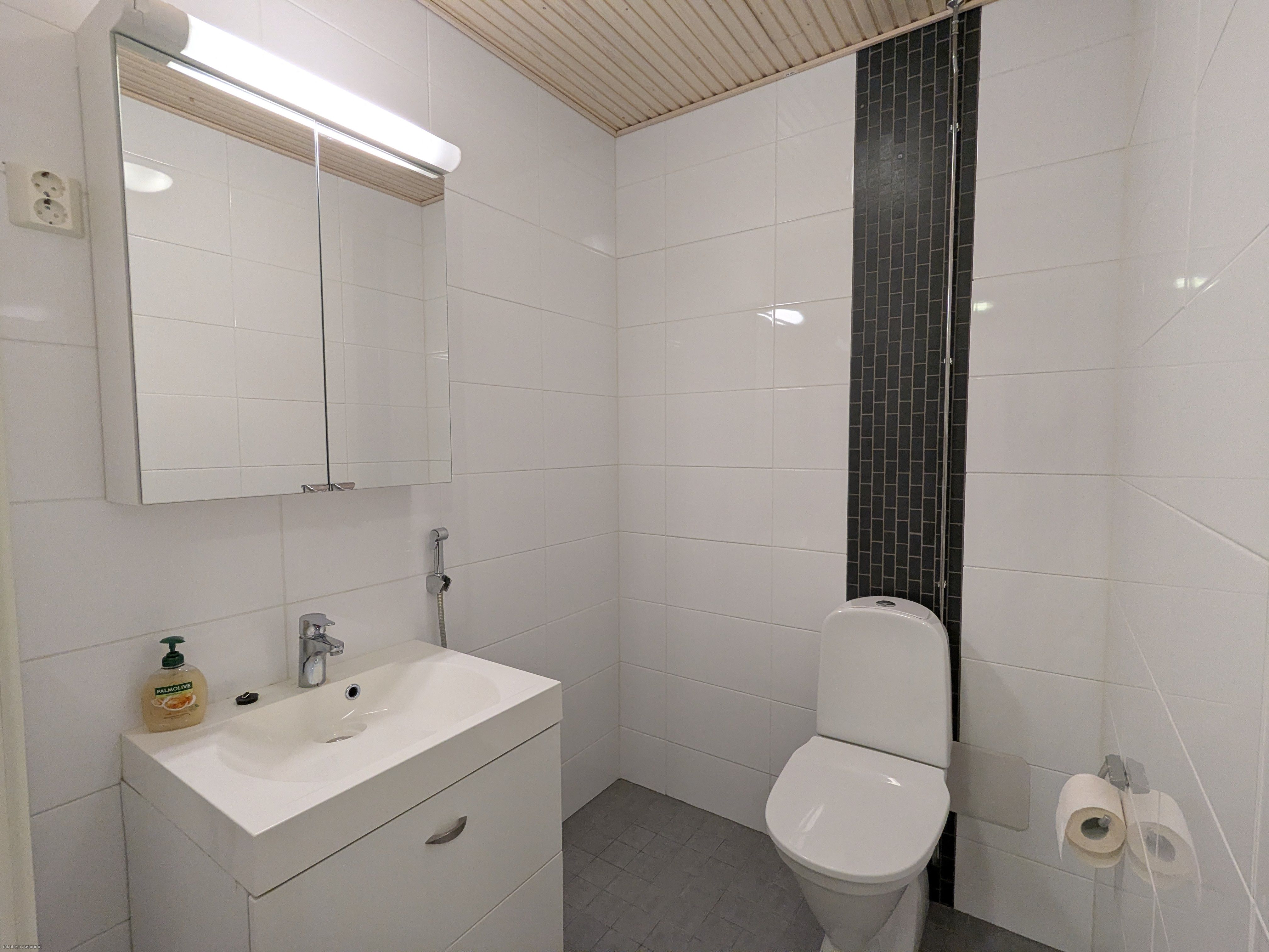 Varusteet: suihku, suihkuseinä, kylpyhuonekaapistot, pesukoneliitäntä, WC, lattialämmitys