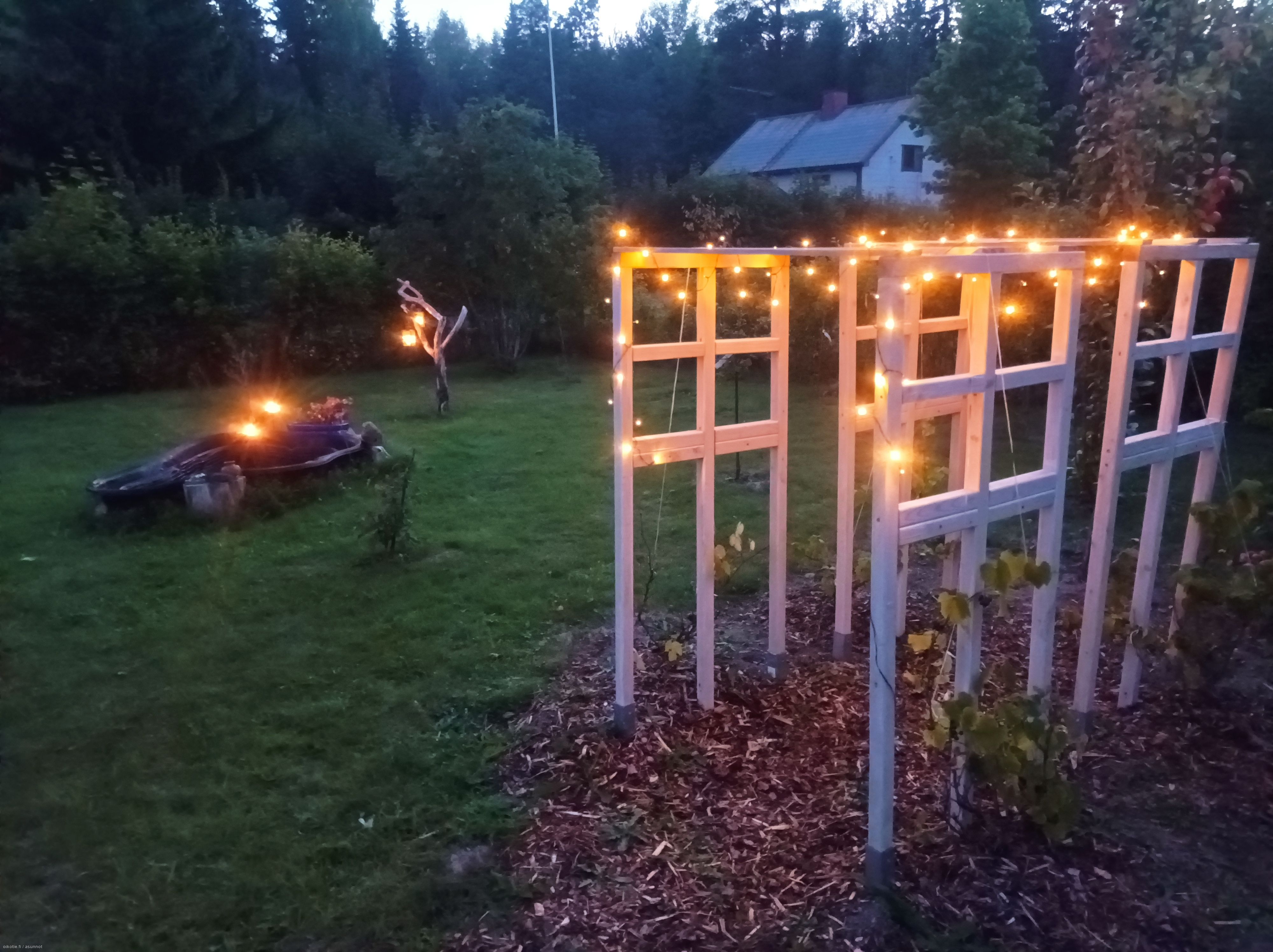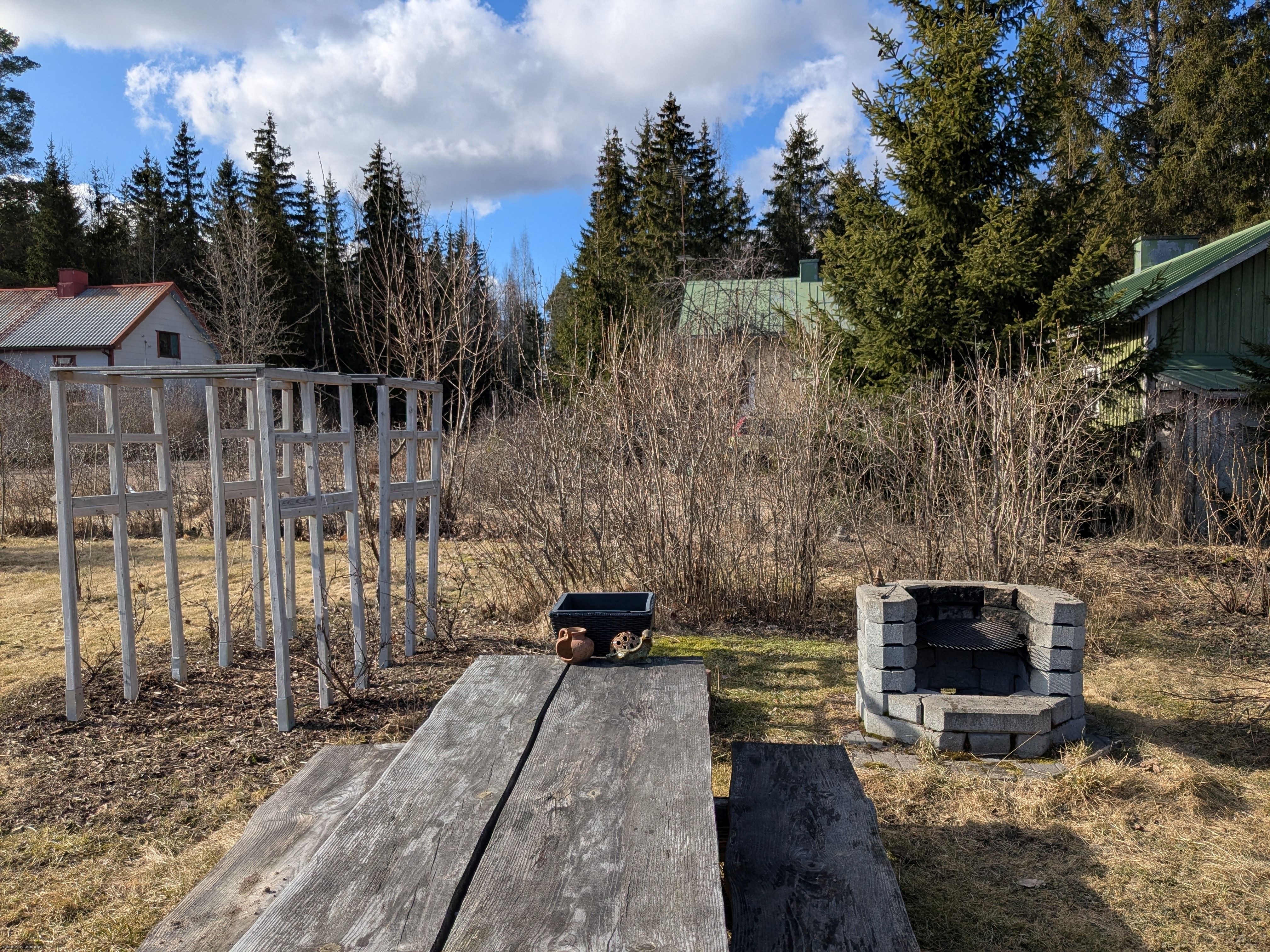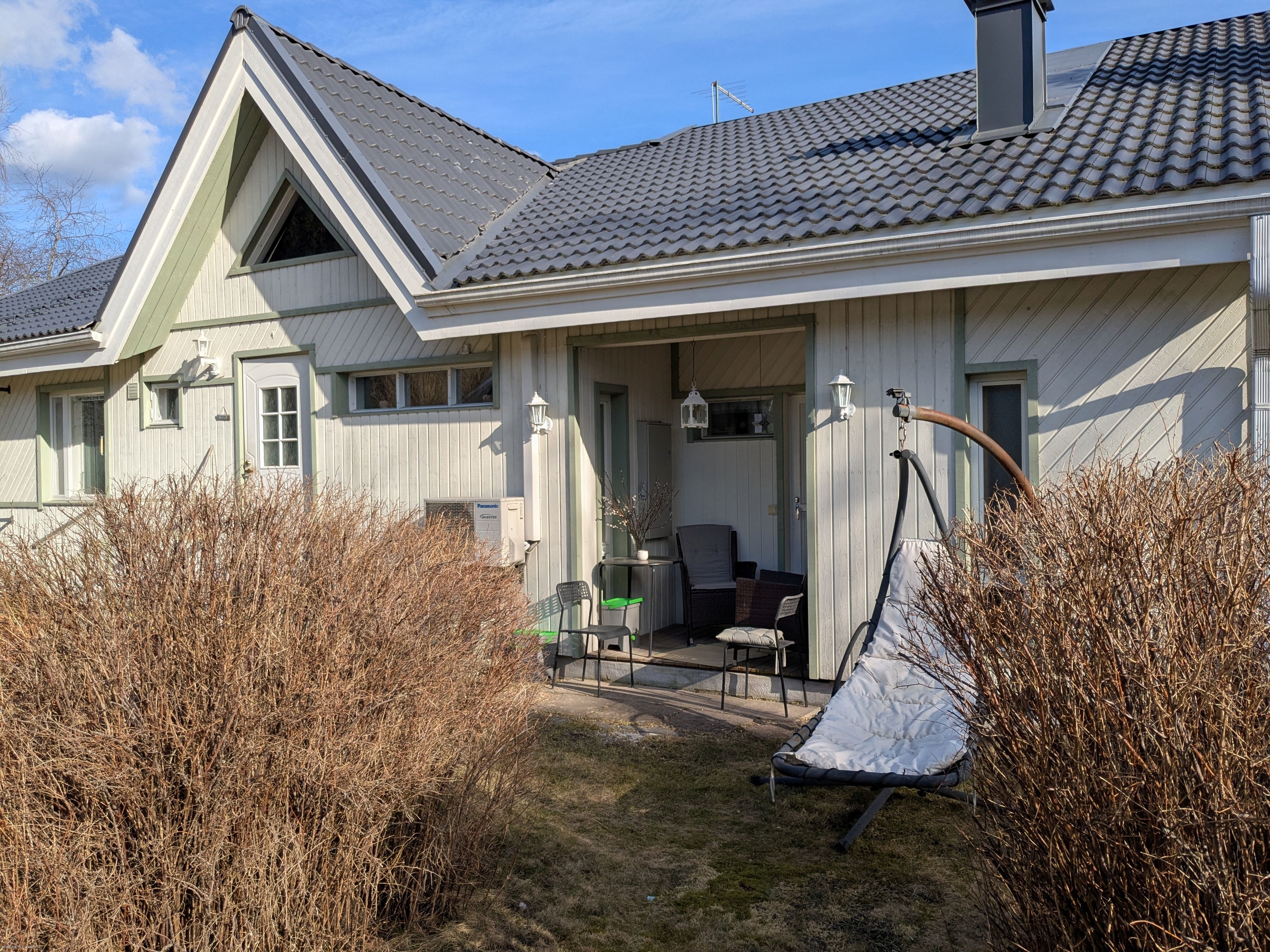 Molemmin puolin taloa on viihtyisiä ja katettuja oleskelutiloja. Omassa kauniissa pihapiirissä monipuolisia istutuksia, omena-, kirsikka- ja päärynäpuita, marjapensaita sekä grillipaikka. Tilalla sijaitsee myös vanha osittain kunnostusta vaativa talousrakennus, jossa on mm. pieni autotalli sekä varastotilaa.