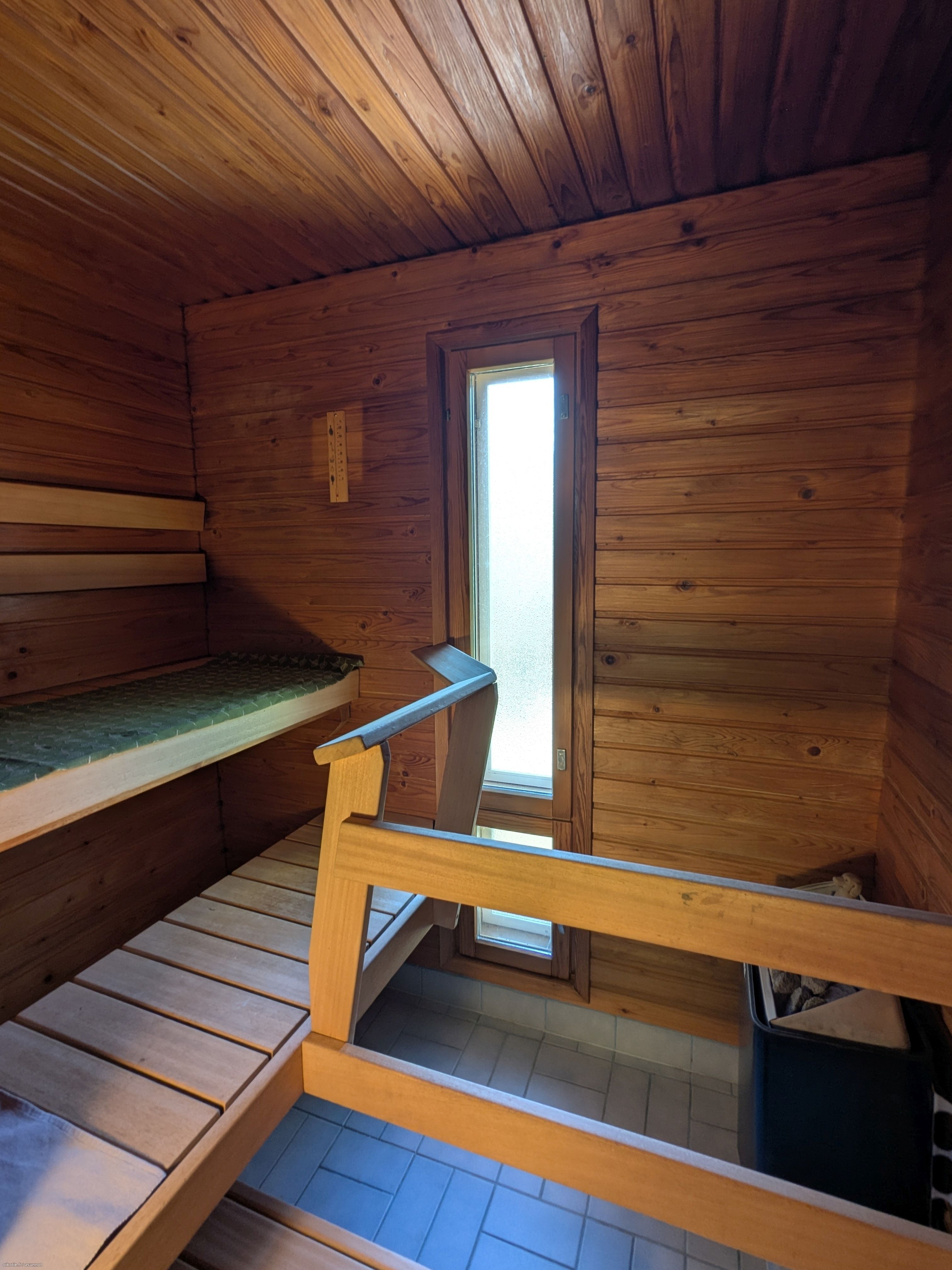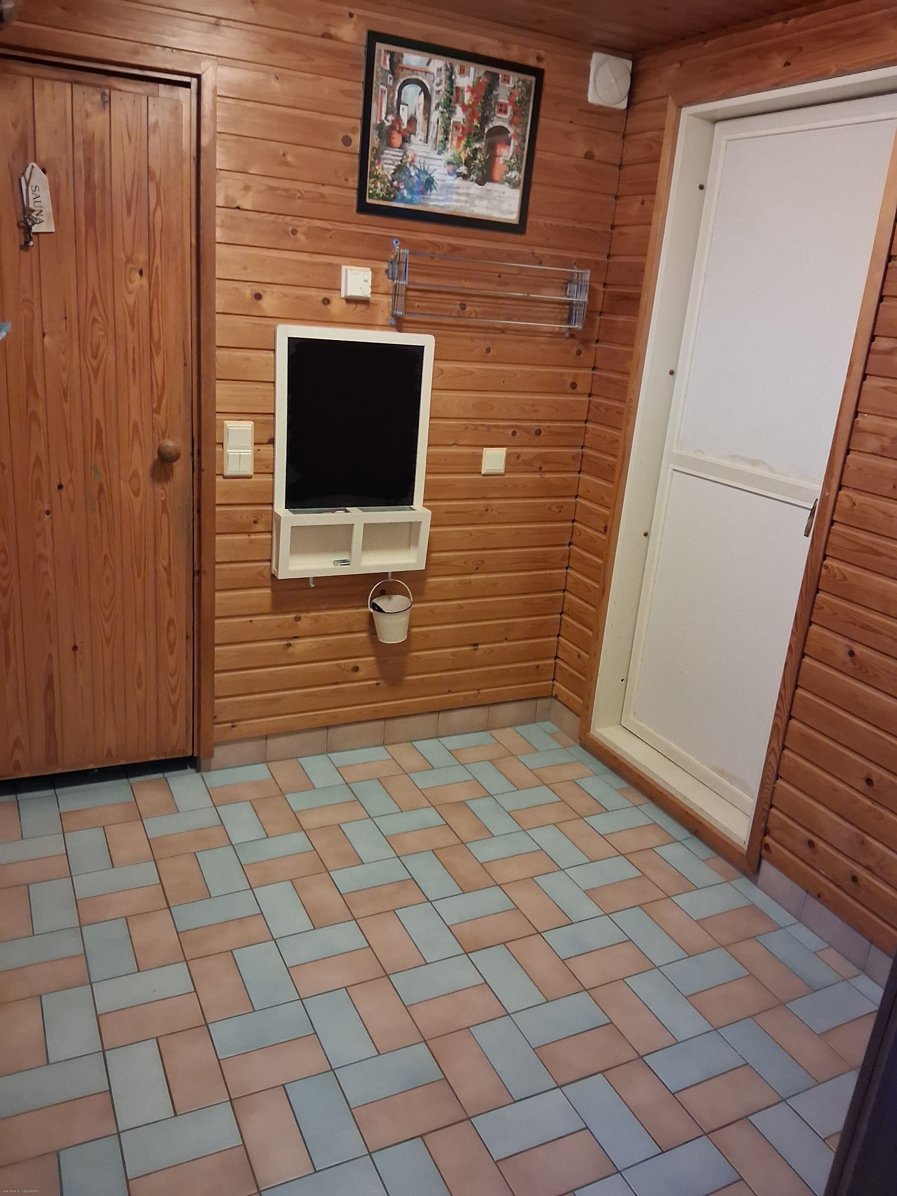 Varusteet: sähkökiuas, lattiakaivo, ikkuna ulos. Lattiamateriaali: laattalattia
